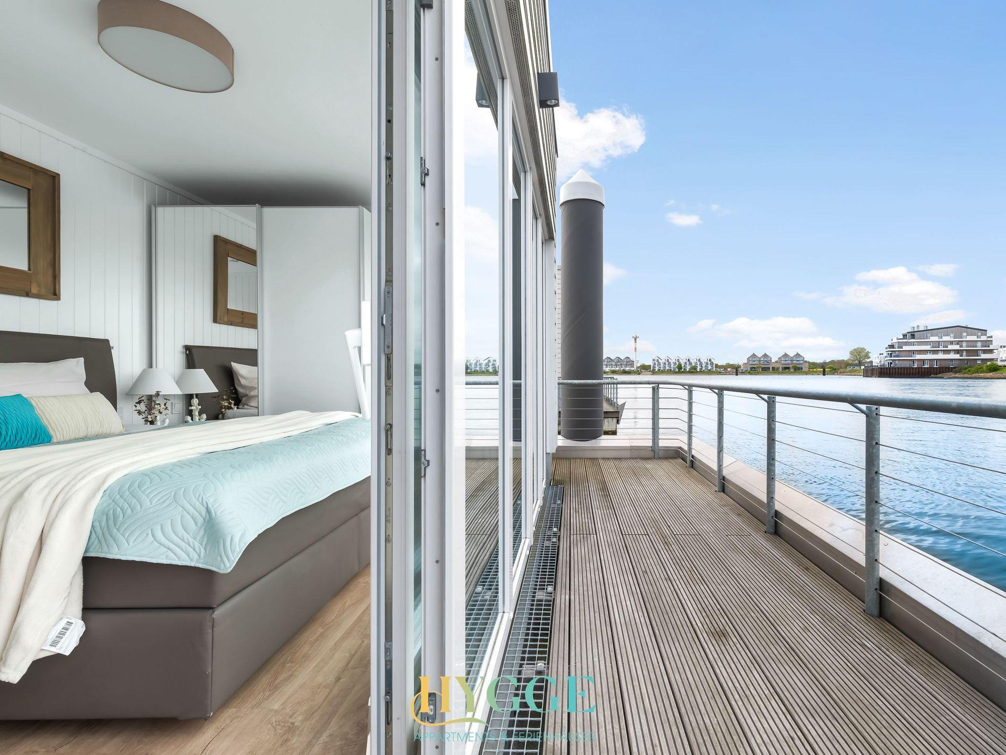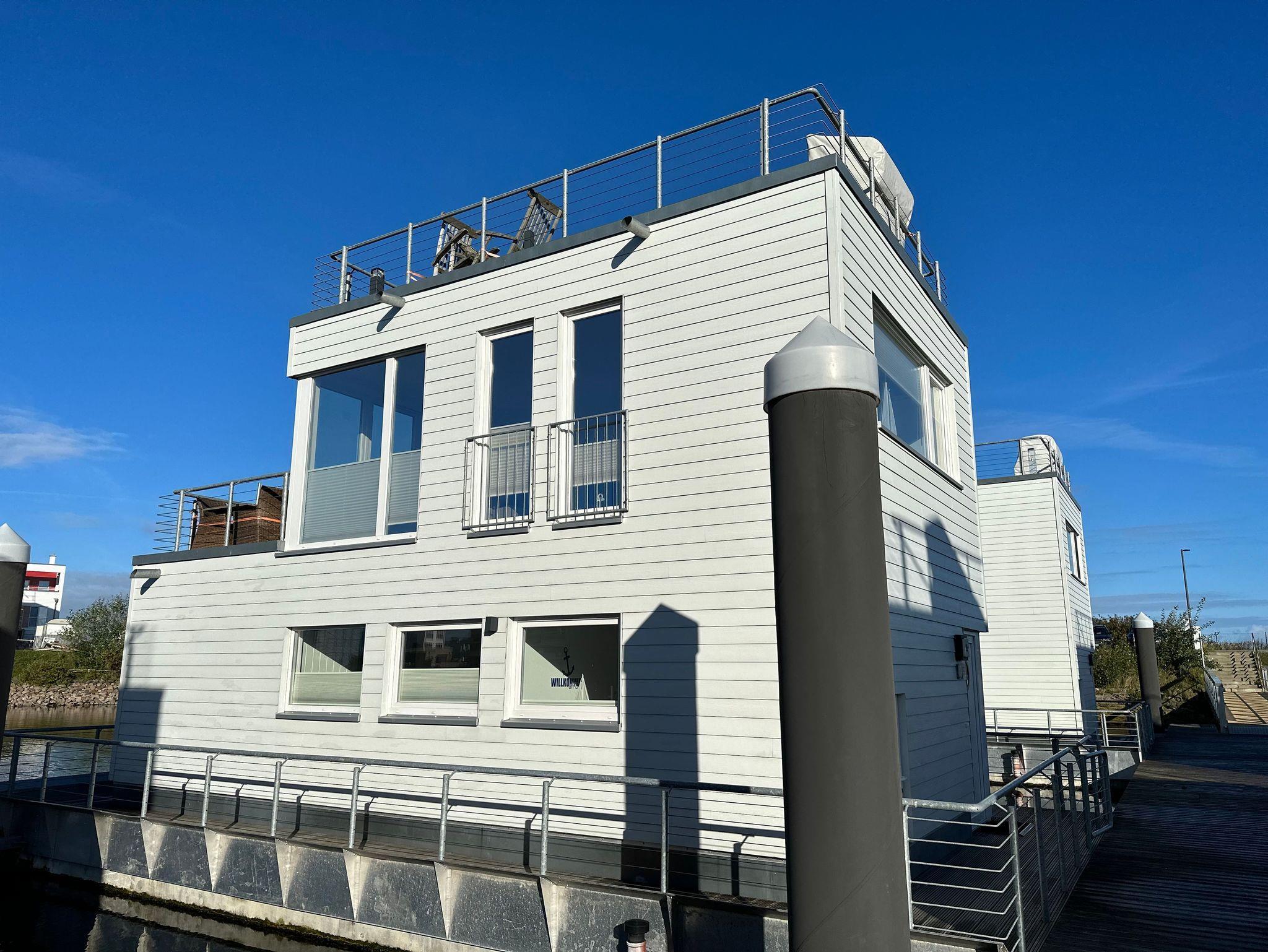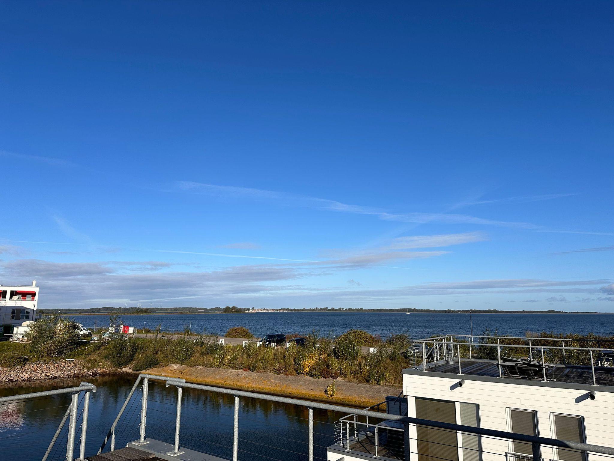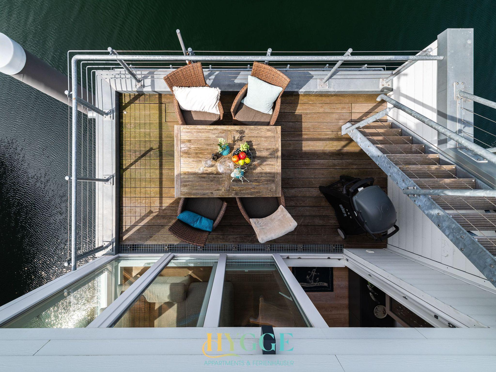 Das schwimmende Haus erstreckt sich über drei Ebenen. Im Obergeschoss befindet sich der offen gestaltete Wohn- und Essbereich, voll ausgestatteter Wohnküche und angrenzender Terrasse. Von hier aus gelangt man auf die spektakuläre Dachterrasse mit Blick über den Segel- und Sportboothafen, die Schlei und deren Mündung in die Ostsee. Ausgestattet mit hochwertigen Gartenmöbeln, Strandkorb und Weber Elektrogrill bieten die Terrassen pures Urlaubsfeeling und atemberaubende Sonnenuntergänge. Der Bootsanleger ist direkt von der Tür, sodass die Anreise mit dem eigenen Boot kein Problem ist.
