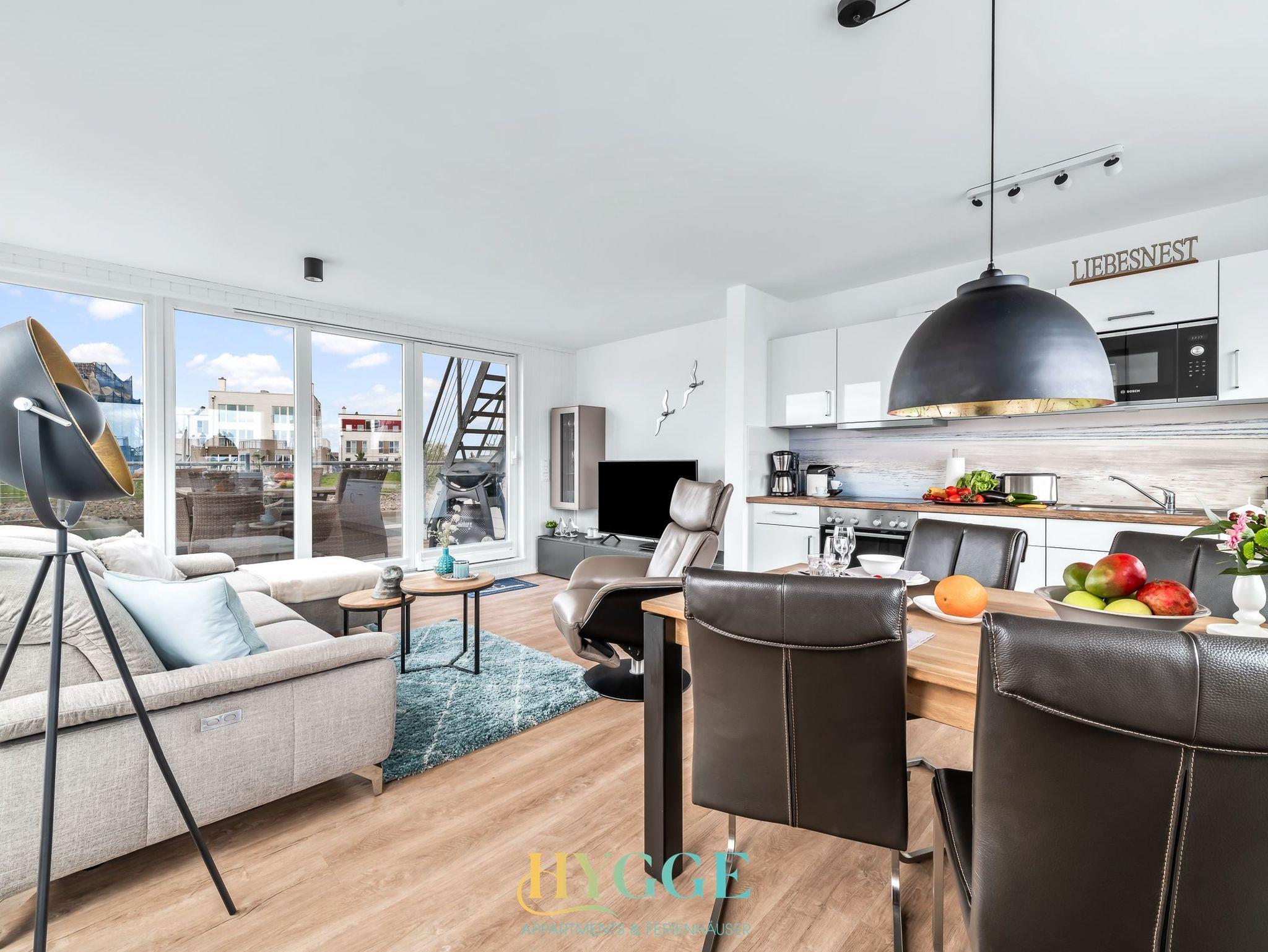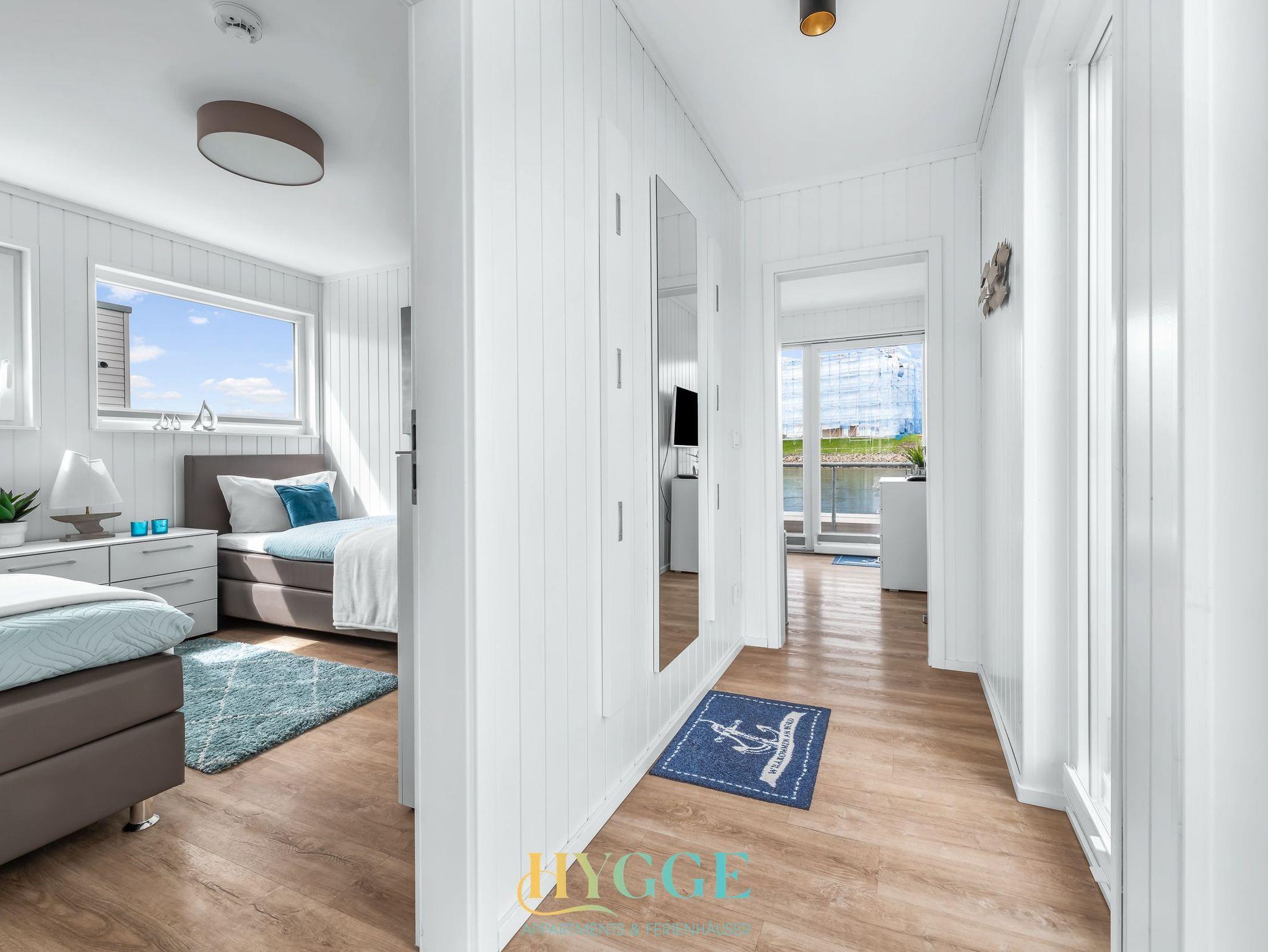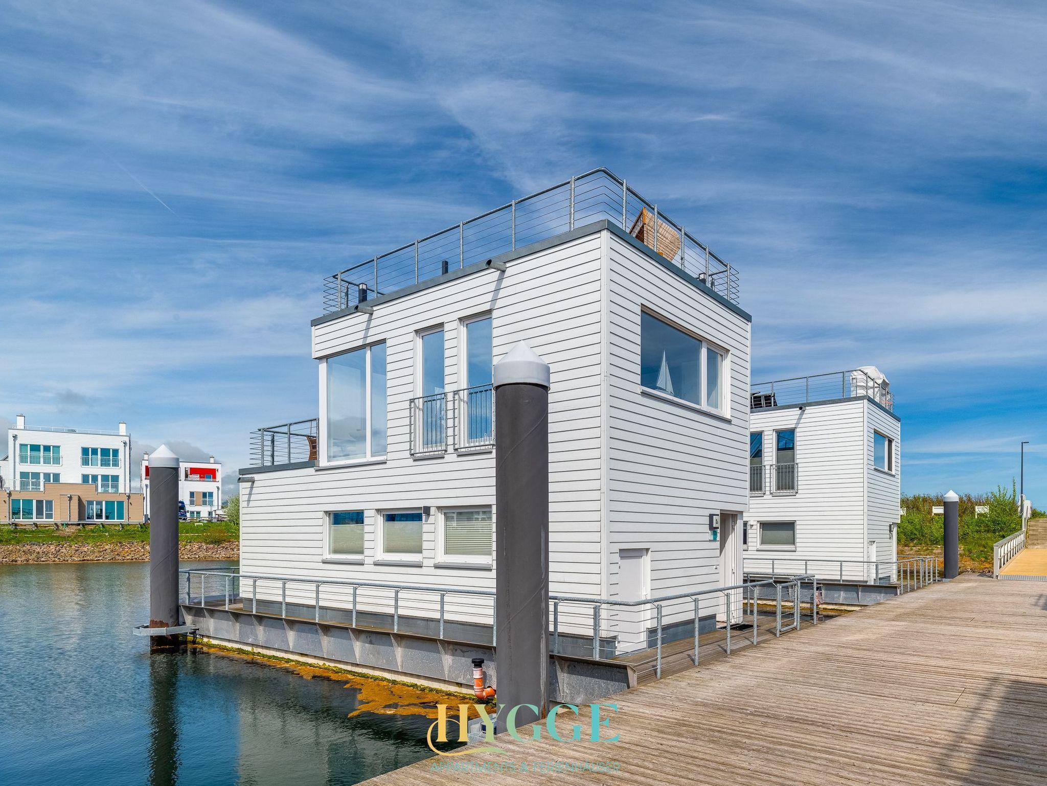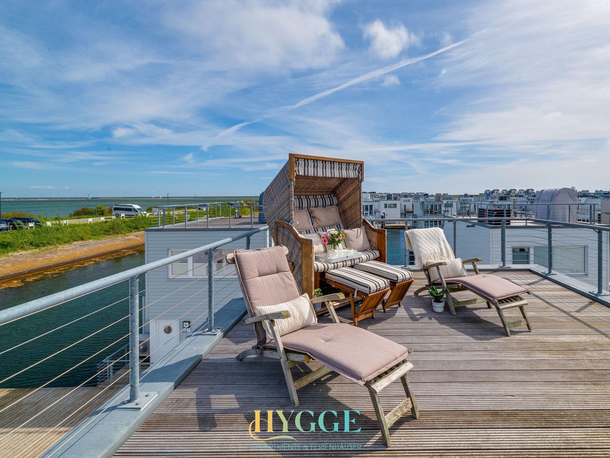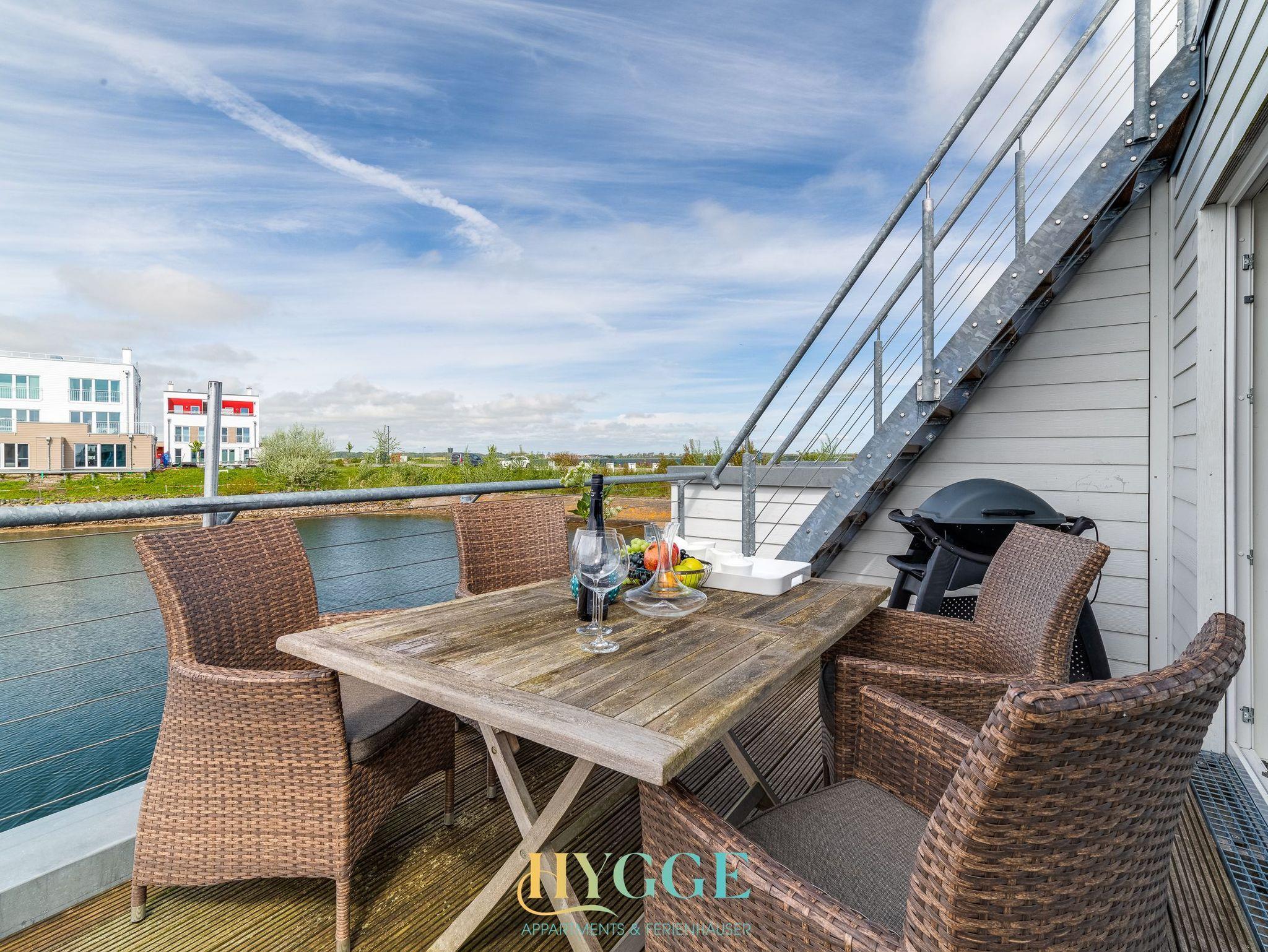 Das schwimmende Haus erstreckt sich über drei Ebenen. Im Obergeschoss befindet sich der offen gestaltete Wohn- und Essbereich, voll ausgestatteter Wohnküche und angrenzender Terrasse. Von hier aus gelangt man auf die spektakuläre Dachterrasse mit Blick über den Segel- und Sportboothafen, die Schlei und deren Mündung in die Ostsee. Ausgestattet mit hochwertigen Gartenmöbeln, Strandkorb und Weber Elektrogrill bieten die Terrassen pures Urlaubsfeeling und atemberaubende Sonnenuntergänge. Der Bootsanleger ist direkt von der Tür, sodass die Anreise mit dem eigenen Boot kein Problem ist.