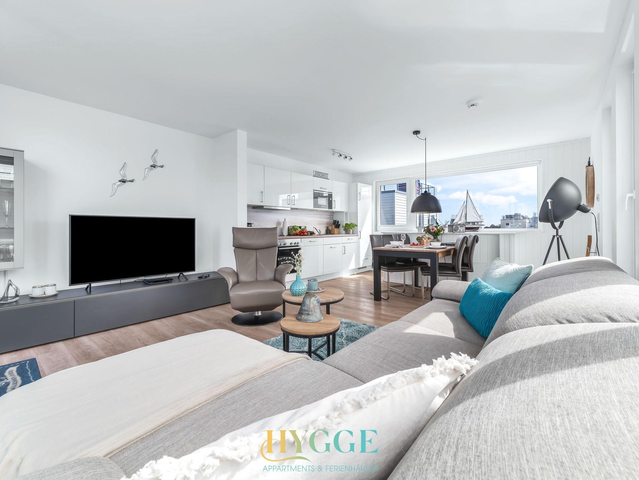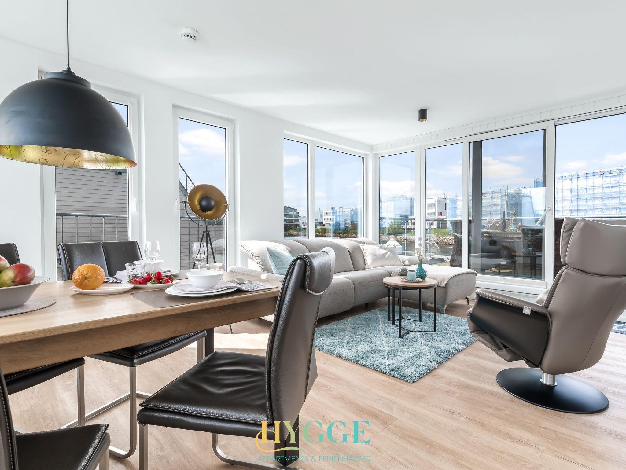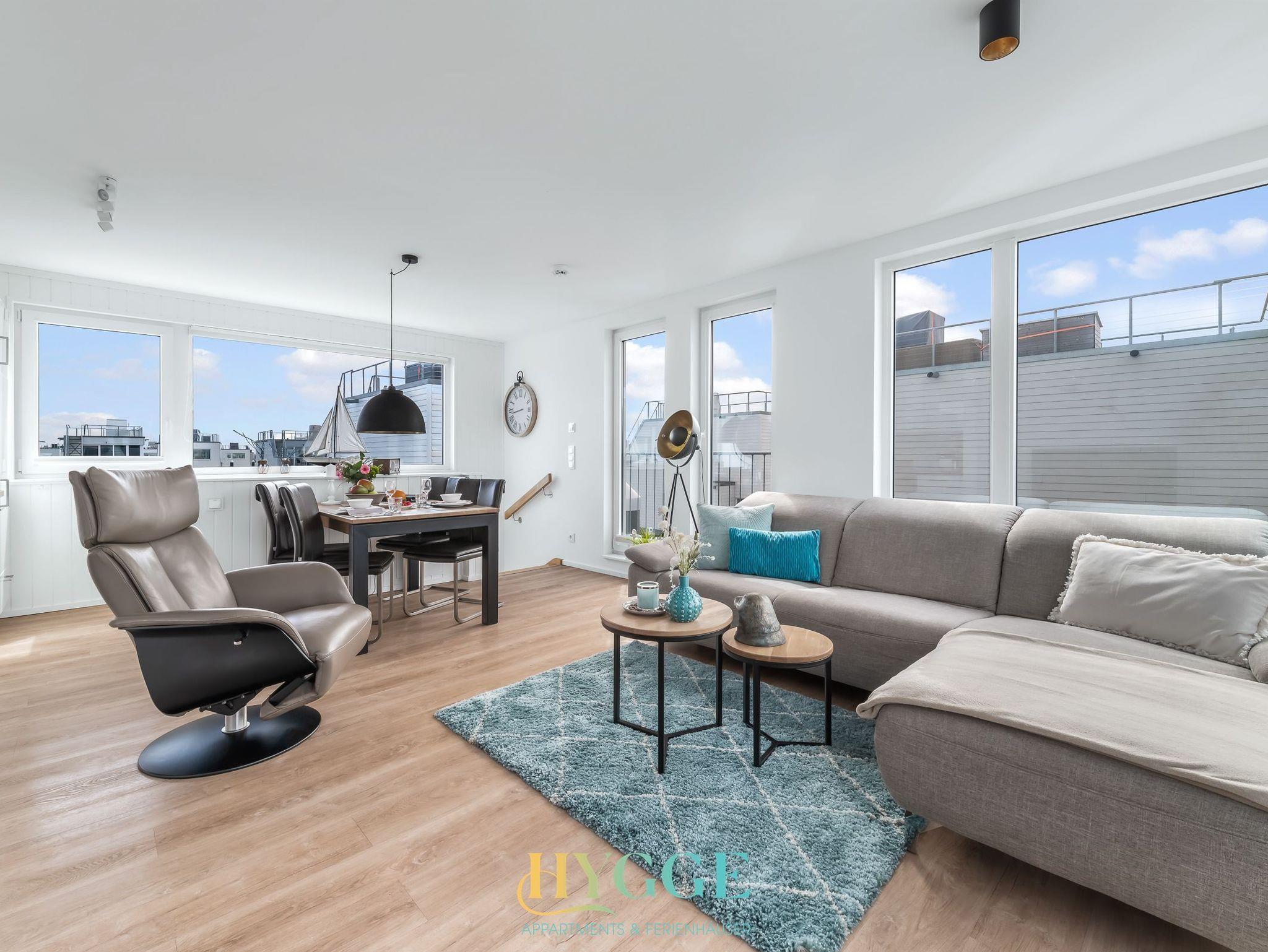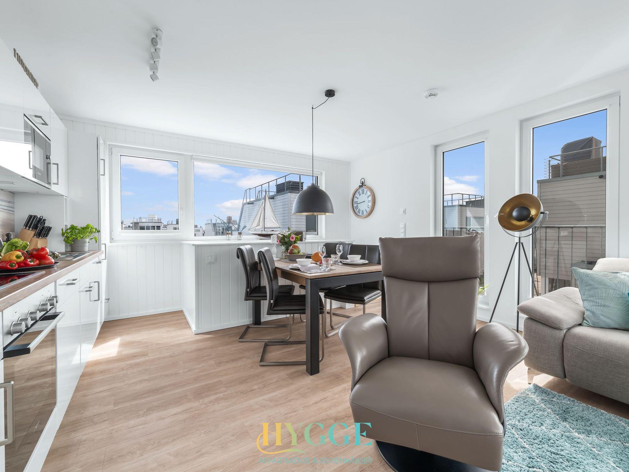 Das schwimmende Haus erstreckt sich über drei Ebenen. Im Obergeschoss befindet sich der offen gestaltete Wohn- und Essbereich, voll ausgestatteter Wohnküche und angrenzender Terrasse. Von hier aus gelangt man auf die spektakuläre Dachterrasse mit Blick über den Segel- und Sportboothafen, die Schlei und deren Mündung in die Ostsee. Ausgestattet mit hochwertigen Gartenmöbeln, Strandkorb und Weber Elektrogrill bieten die Terrassen pures Urlaubsfeeling und atemberaubende Sonnenuntergänge. Der Bootsanleger ist direkt von der Tür, sodass die Anreise mit dem eigenen Boot kein Problem ist.