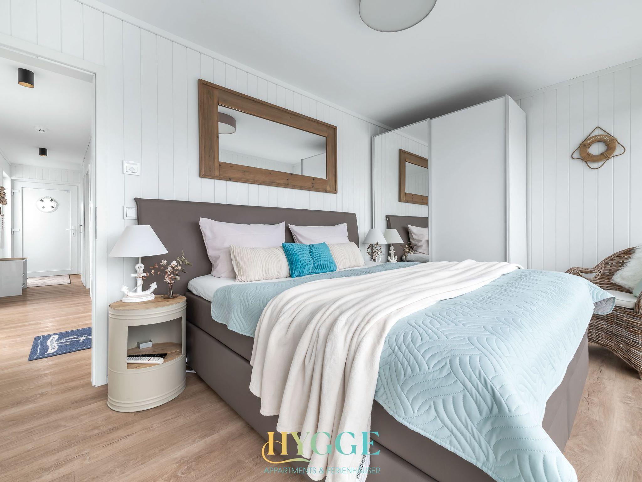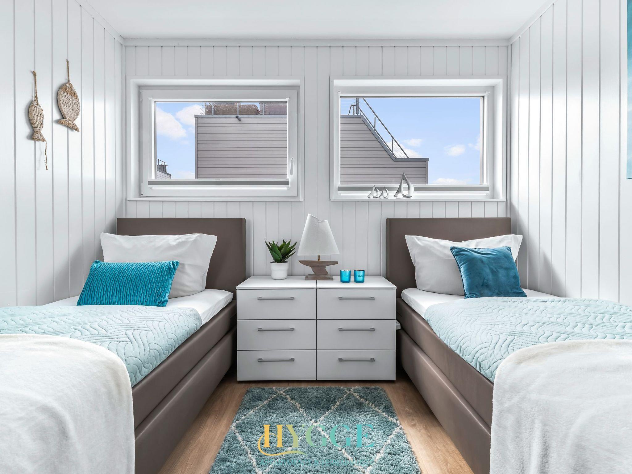 Der Ruhebereich des Hauses befindet sich im Erdgeschoss mit zwei Schlafzimmern (ausgestattet mit Boxspring Doppelbetten), bzw. ein Schlafzimmer mit zwei Einzelbetten, dazu Duschbadezimmer und Sauna. Das Hauptschlafzimmer punktet mit einer bodentiefen Panorama Fensterfront, durch welche sich die atemberaubende Wasserkulisse genießen lässt und einer angrenzenden umlaufenden Terrasse.