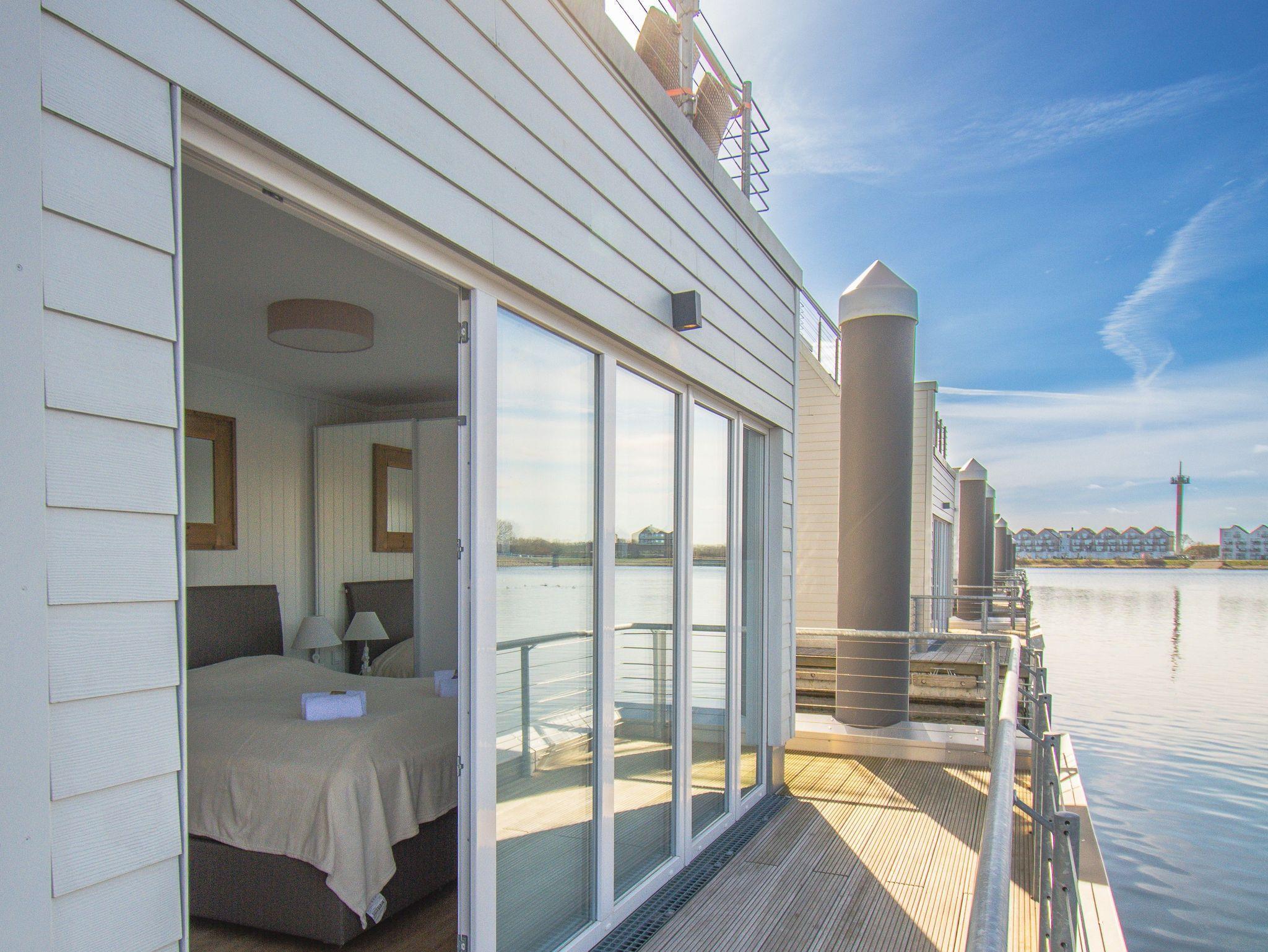 Schwimmendes Ferienhaus An Bord Zwei mit Sauna, Meerblick und privatem Bootsanleger im OstseeResort Olpenitz.