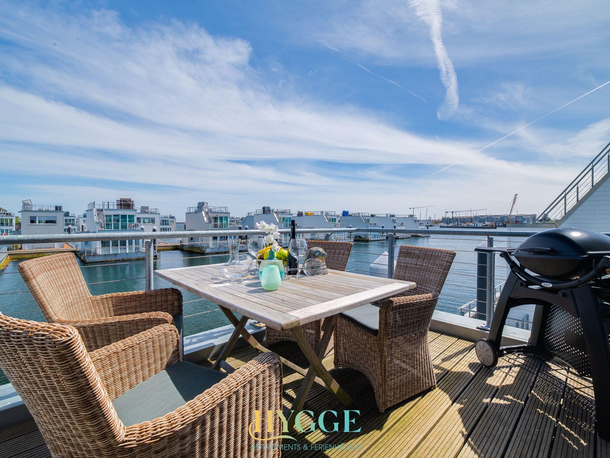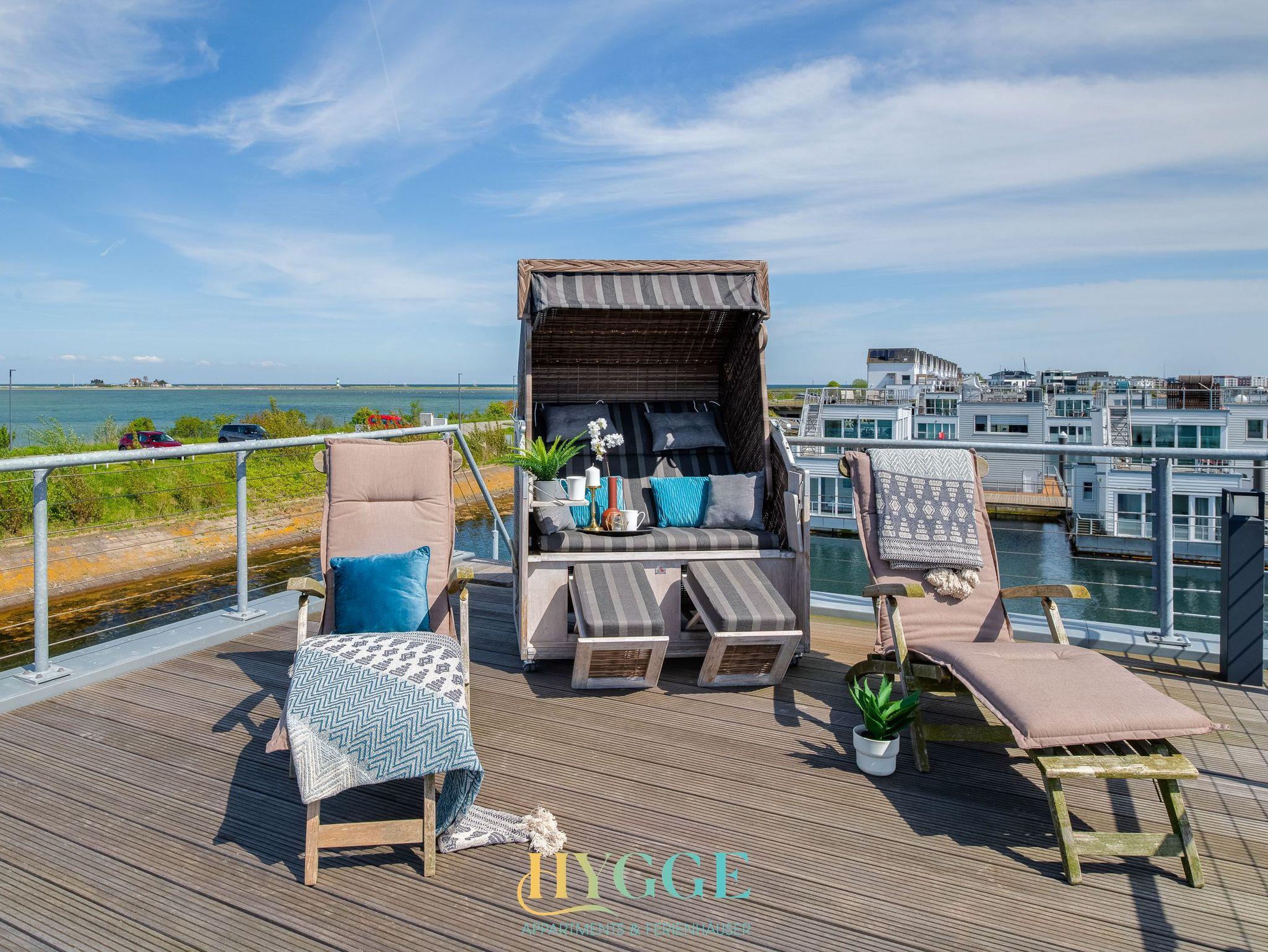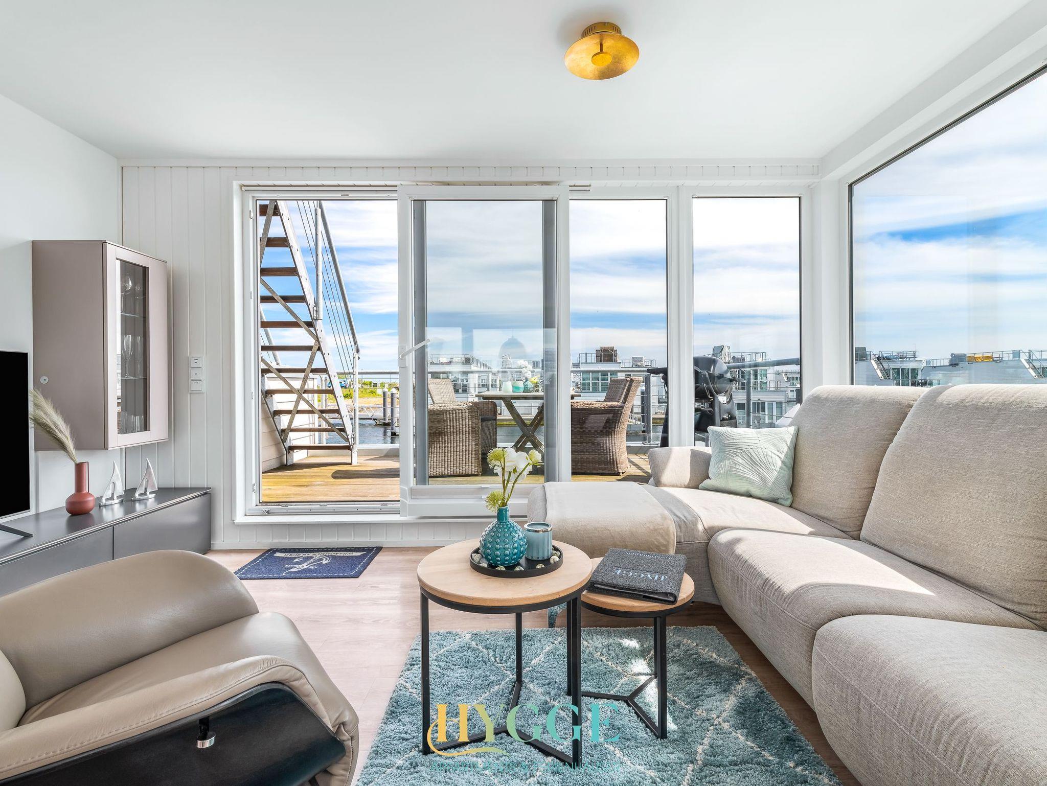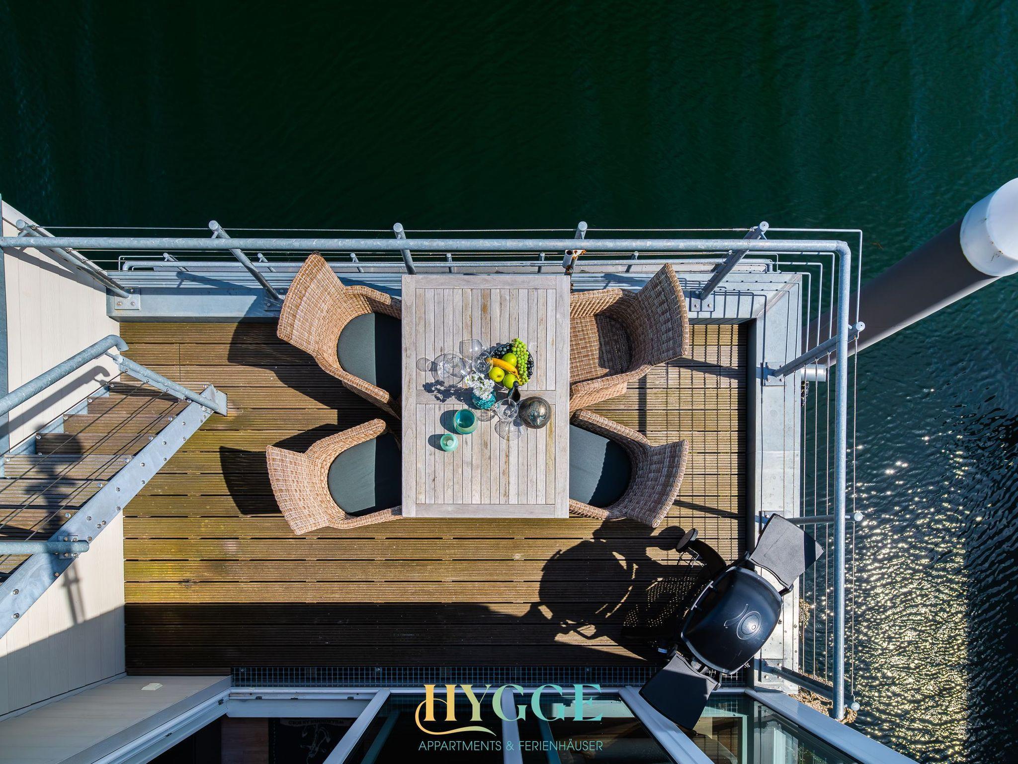 Das schwimmende Haus erstreckt sich über drei Ebenen. Im Obergeschoss befindet sich der offen gestaltete Wohn- und Essbereich mit rundum Wasserblick, voll ausgestatteter Wohnküche und angrenzender Terrasse. Von hier aus gelangt man auf die spektakuläre Dachterrasse mit Blick über den Segel- und Sportboothafen, die Schlei und deren Mündung in die Ostsee. Ausgestattet mit hochwertigen Gartenmöbeln, Strandkorb und Weber Elektrogrill bieten die Terrassen pures Urlaubsfeeling und atemberaubende Sonnenuntergänge. Der Bootsanleger ist direkt von der Tür, sodass die Anreise mit dem eigenen Boot kein Problem ist.