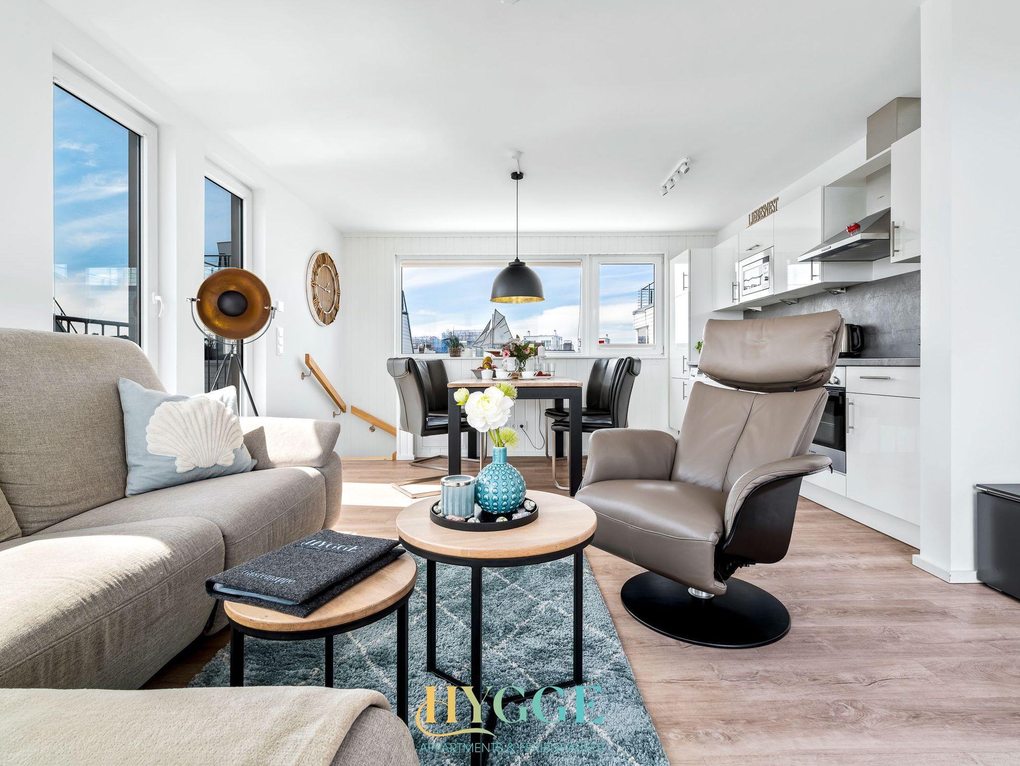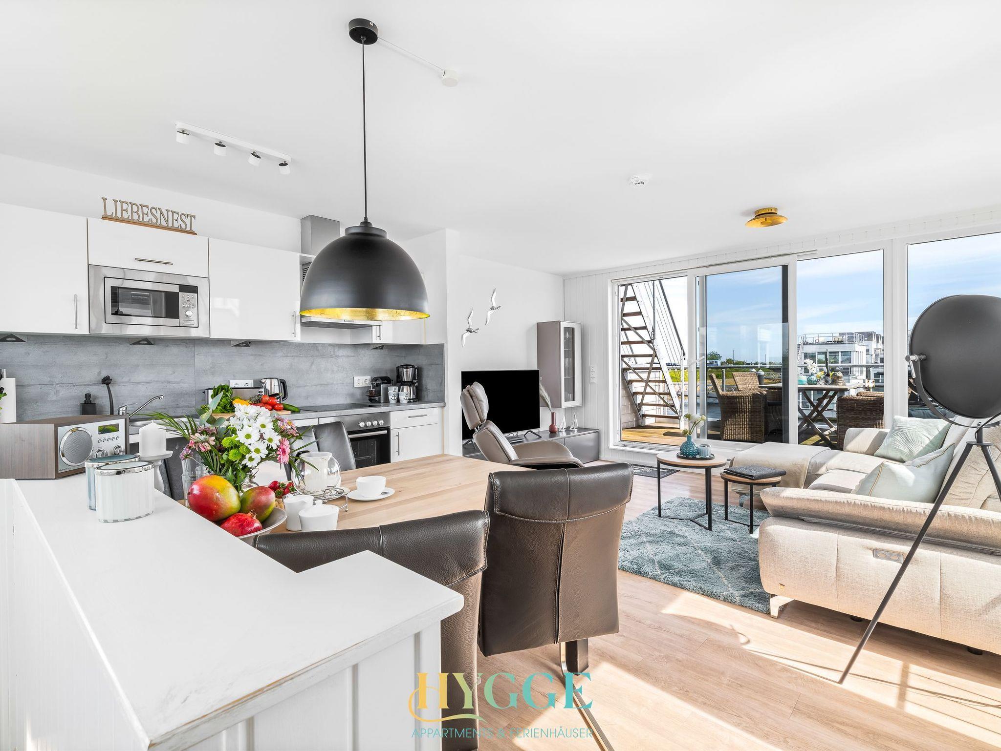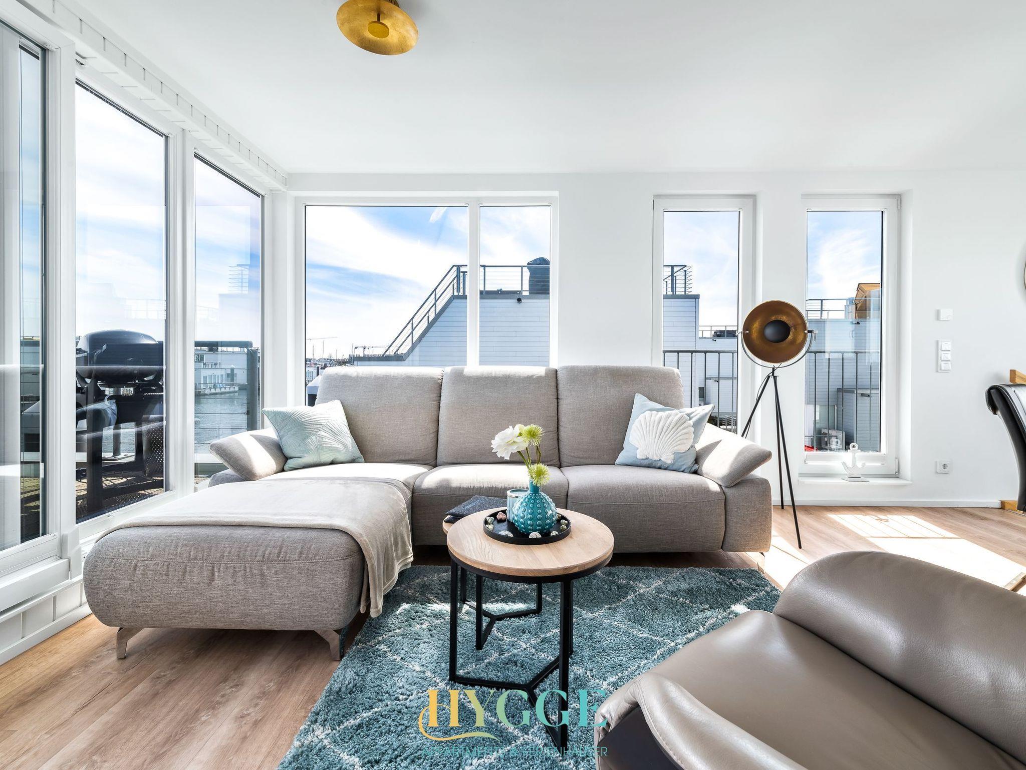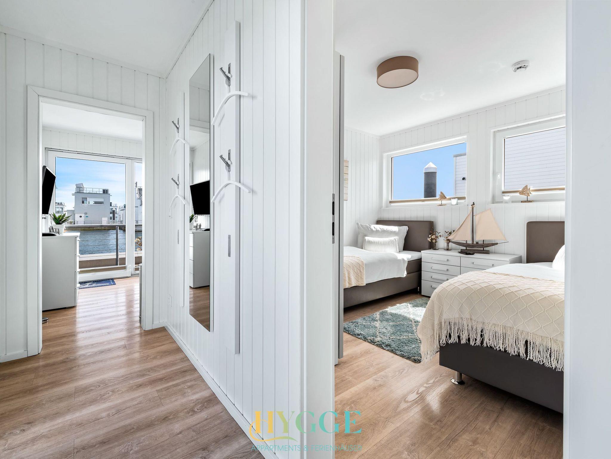 Das schwimmende Haus erstreckt sich über drei Ebenen. Im Obergeschoss befindet sich der offen gestaltete Wohn- und Essbereich mit rundum Wasserblick, voll ausgestatteter Wohnküche und angrenzender Terrasse. Von hier aus gelangt man auf die spektakuläre Dachterrasse mit Blick über den Segel- und Sportboothafen, die Schlei und deren Mündung in die Ostsee. Ausgestattet mit hochwertigen Gartenmöbeln, Strandkorb und Weber Elektrogrill bieten die Terrassen pures Urlaubsfeeling und atemberaubende Sonnenuntergänge. Der Bootsanleger ist direkt von der Tür, sodass die Anreise mit dem eigenen Boot kein Problem ist.