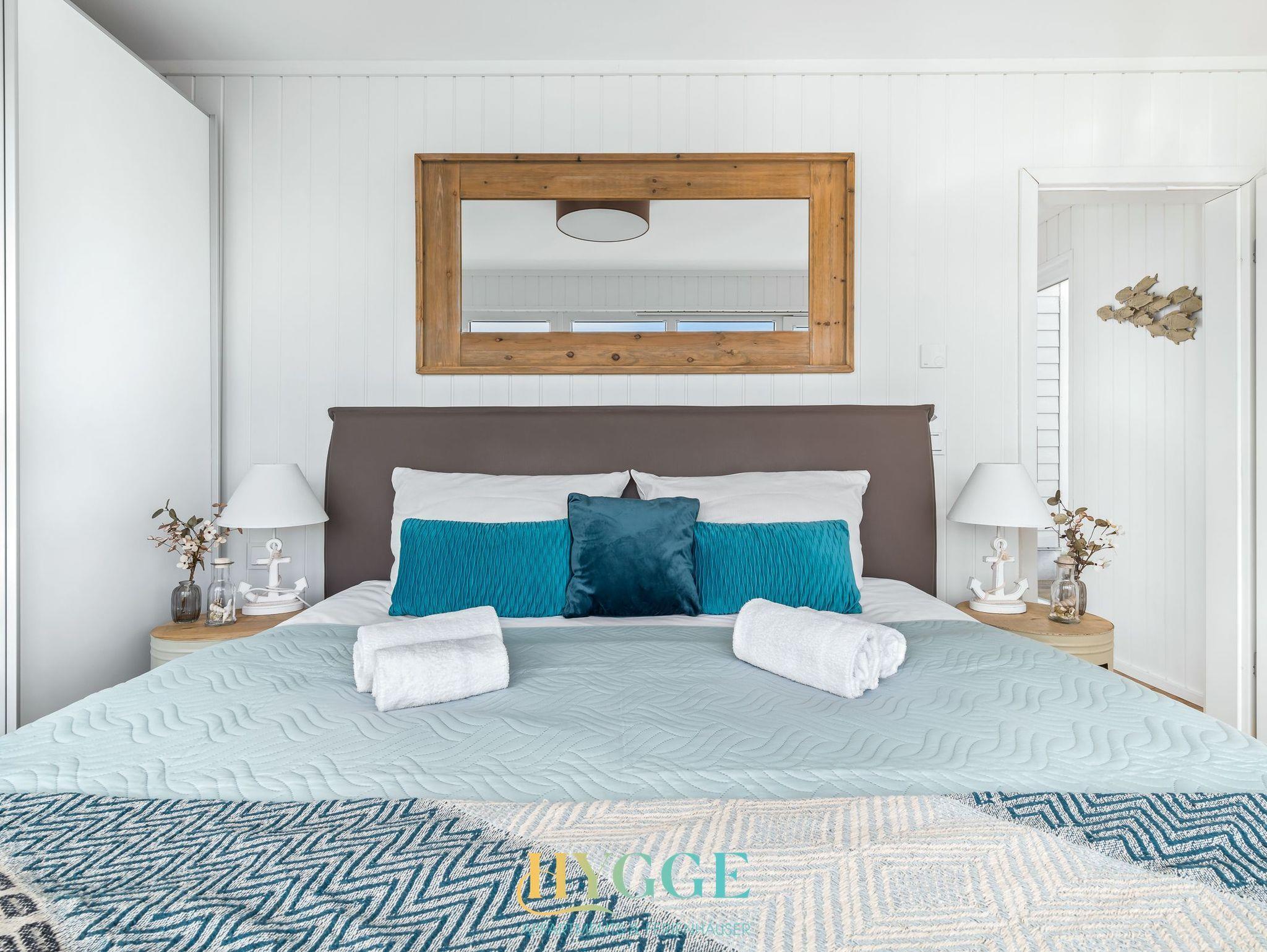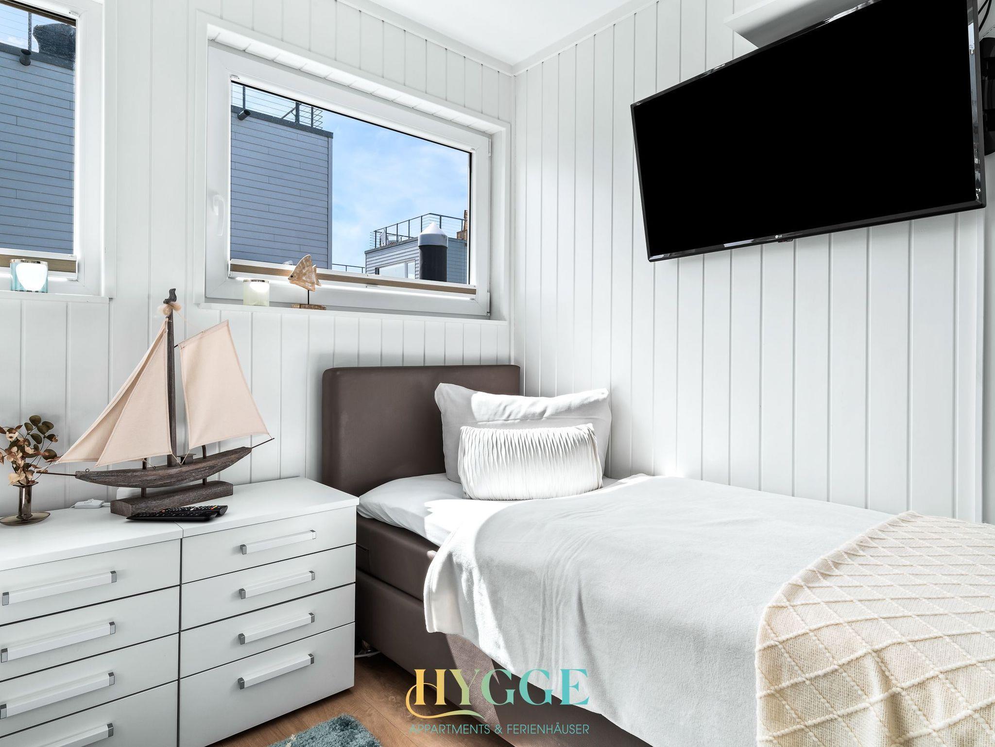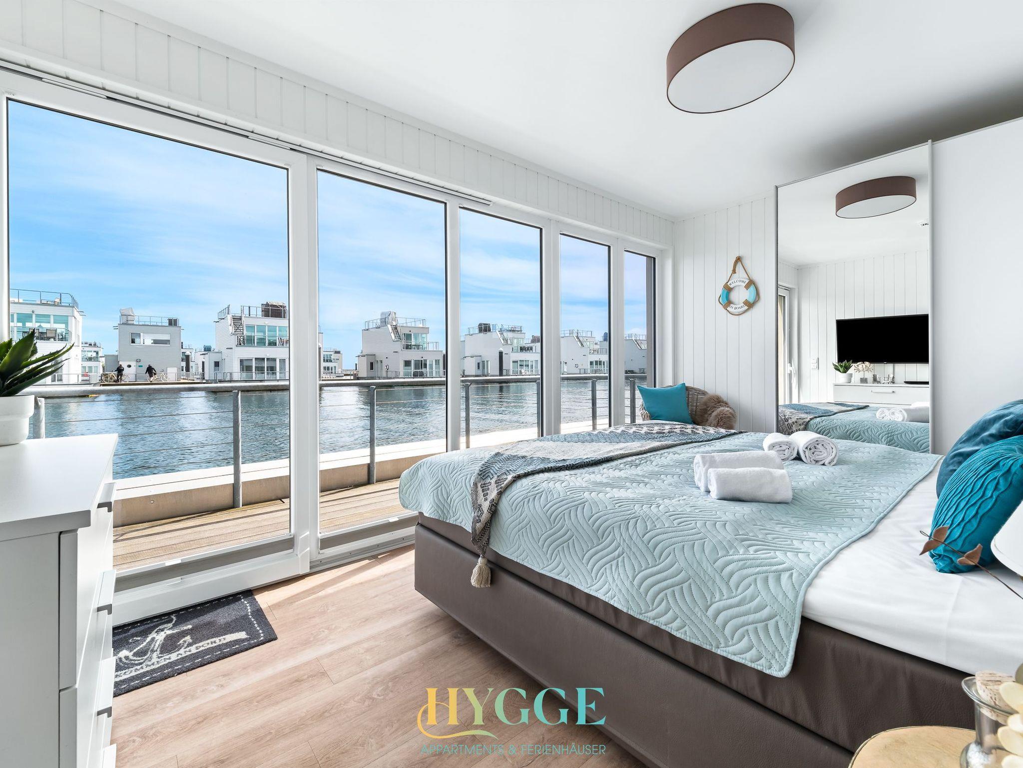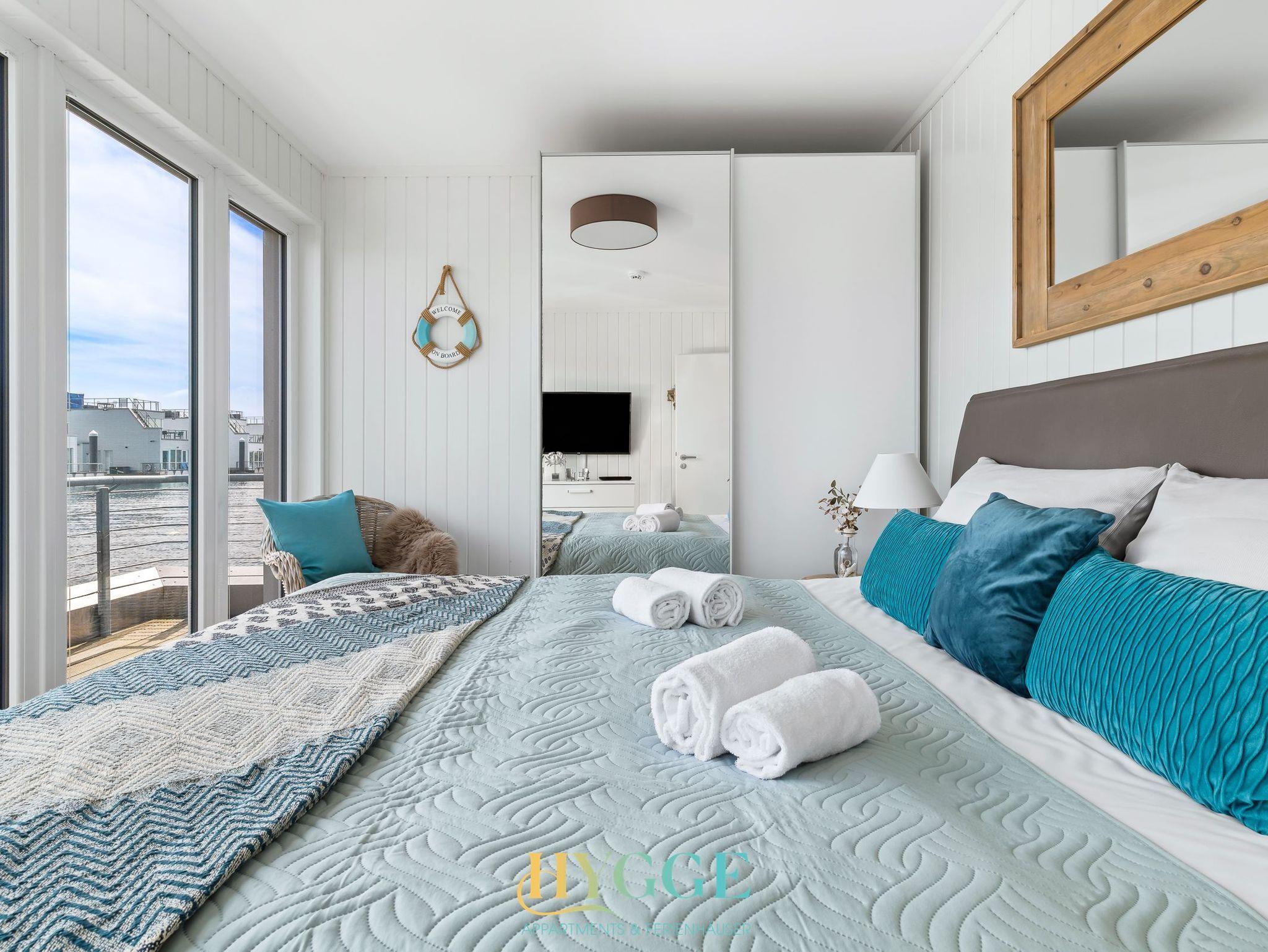 Der Ruhebereich des Hauses befindet sich im Erdgeschoss mit zwei Schlafzimmern (ausgestattet mit Boxspring Doppelbetten), Duschbadezimmer und Sauna. Das Hauptschlafzimmer punktet mit einer bodentiefen Panorama Fensterfront, durch welche sich die atemberaubende Wasserkulisse genießen lässt und einer angrenzenden umlaufenden Terrasse.