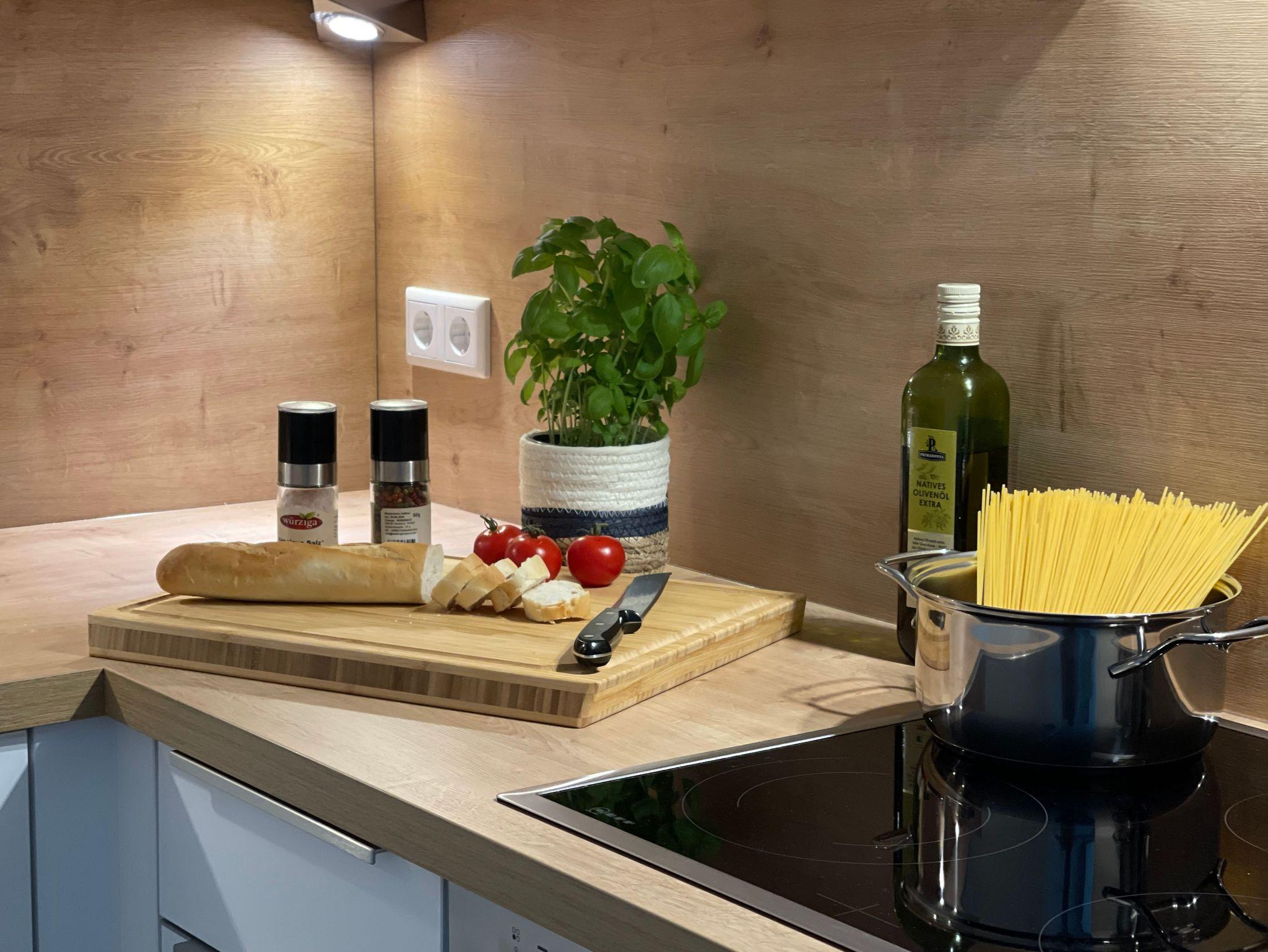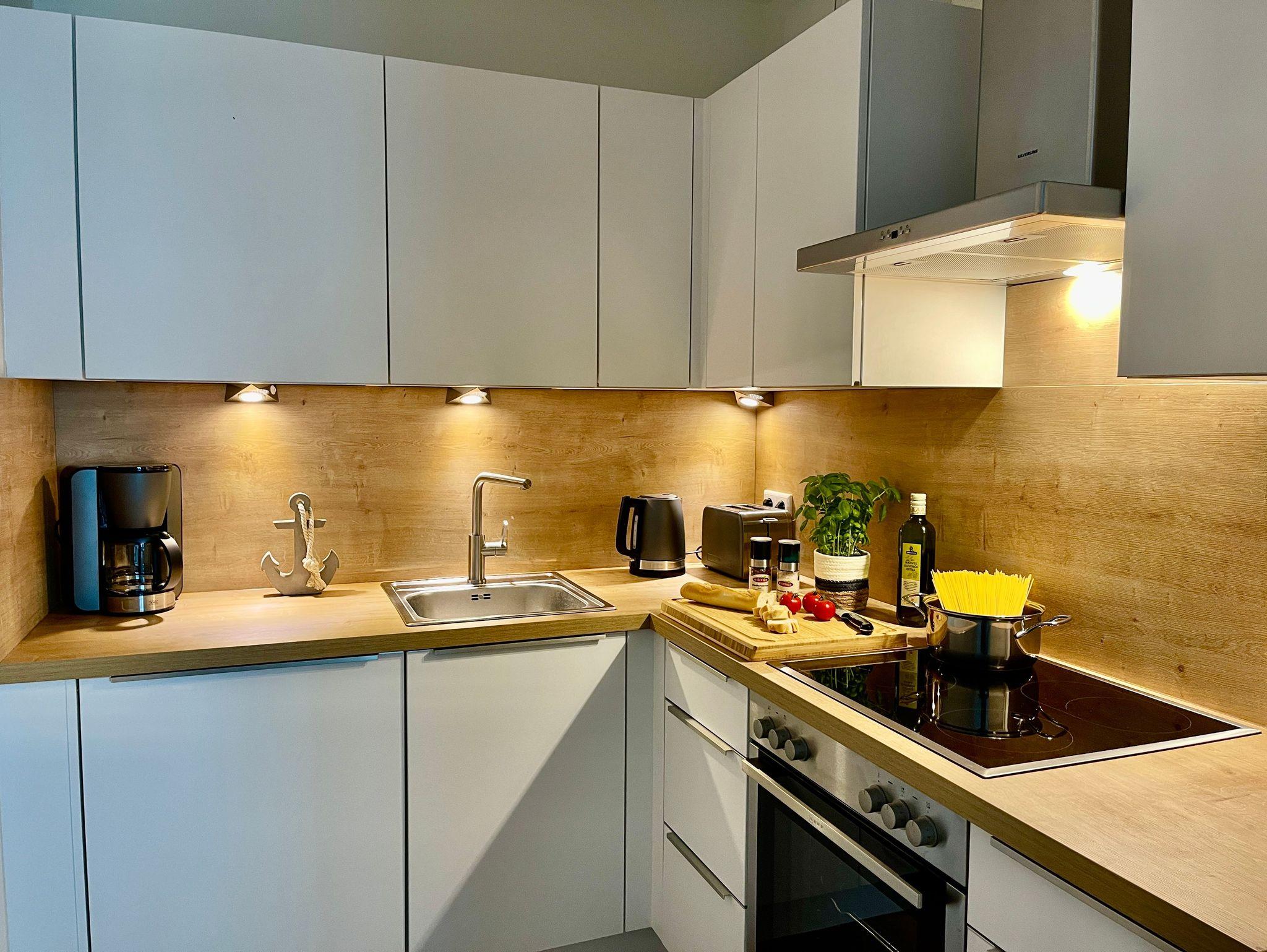 Zudem verfügt die Wohnung über eine voll ausgestattete Küche mit hochwertigen Markengeräten, ein Bad mit bodentiefer Regendusche und Föhn, einen Abstellraum und einen Balkon. Zur Unterhaltung steht Ihnen schnelles WLAN, eine Musikanlage (Internetradio, CD, Bluetooth) und zwei Smart-TVs mit sky Programmen zur Verfügung (Bundesliga HD, Sport1 HD, Cinema HD, Family HD). Damit Sie gut schlafen, sind alle Fenster mit hochwertigen Verdunkelungsgardinen ausgestattet.