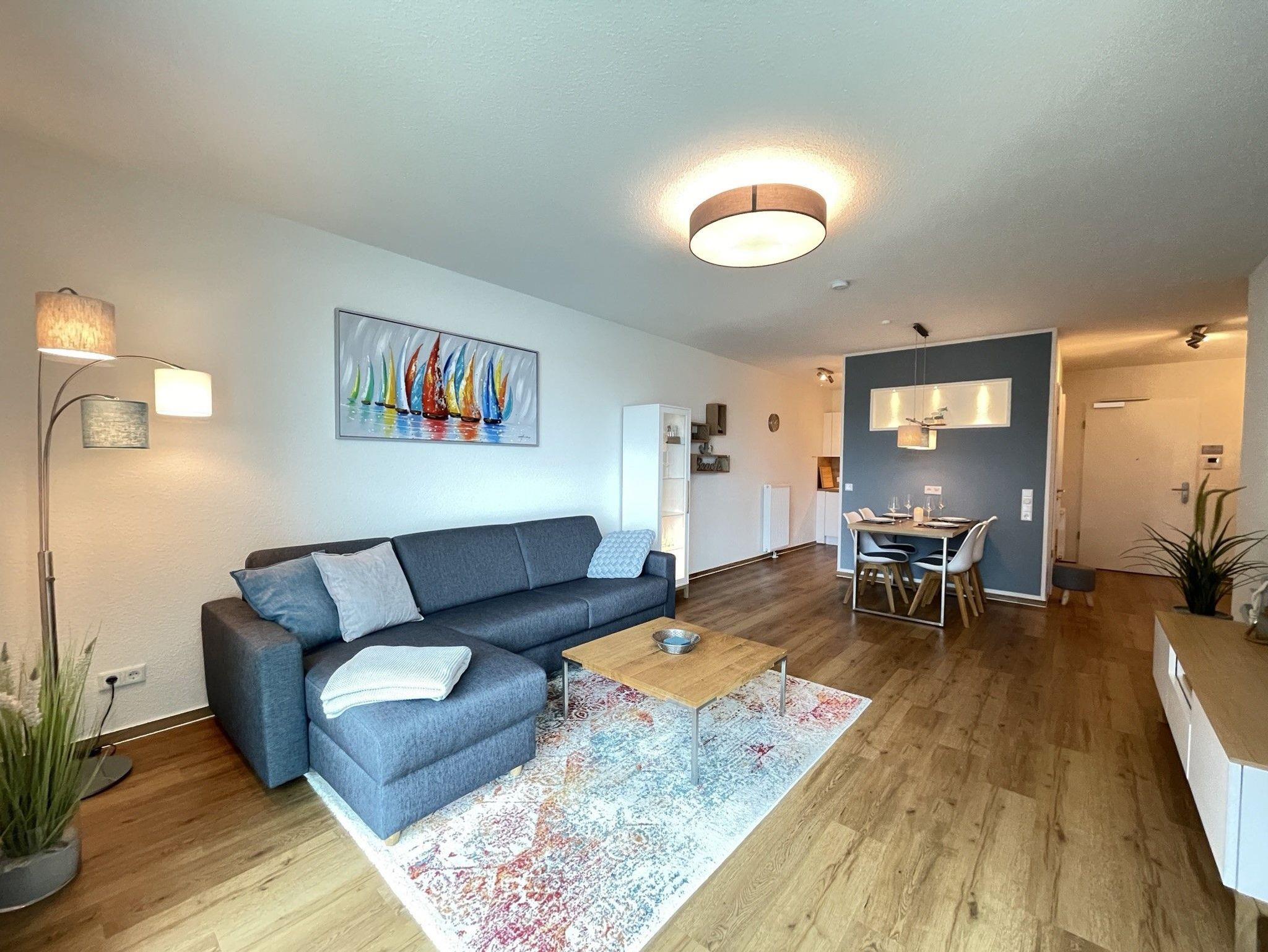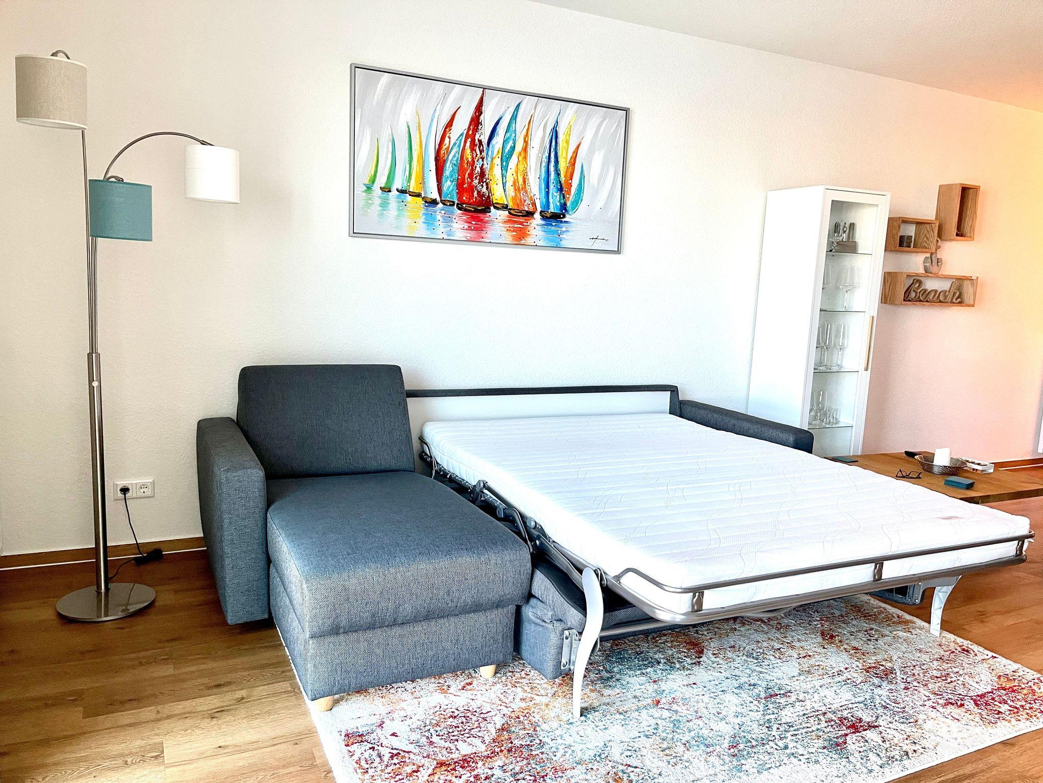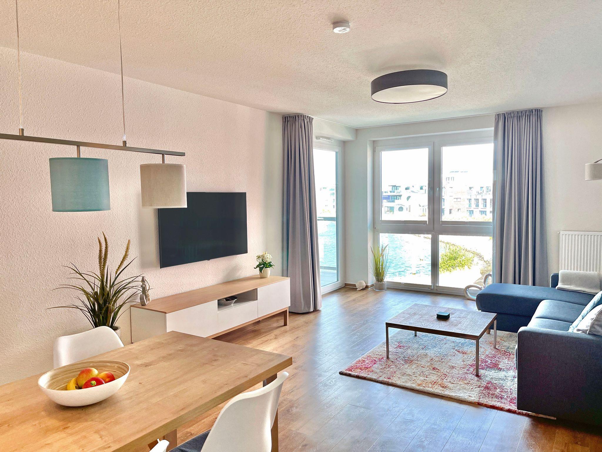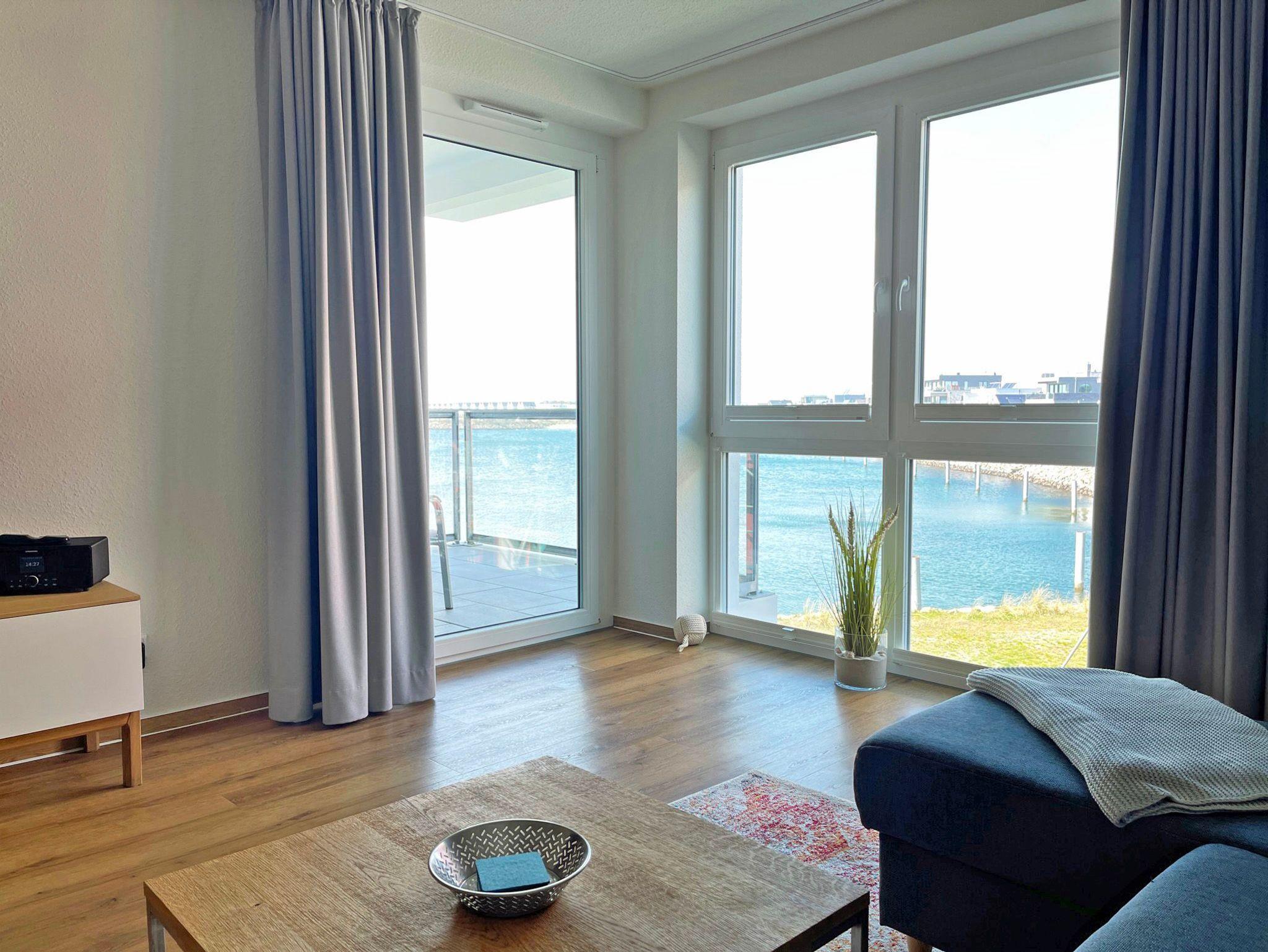 Der offene und modern gestaltete Wohnbereich mit ausziehbarer Doppelbettcouch (140 cm x 200 cm) und Esstisch bietet einen wunderschönen Blick auf die Bucht, den Yachthafen und den Strand.