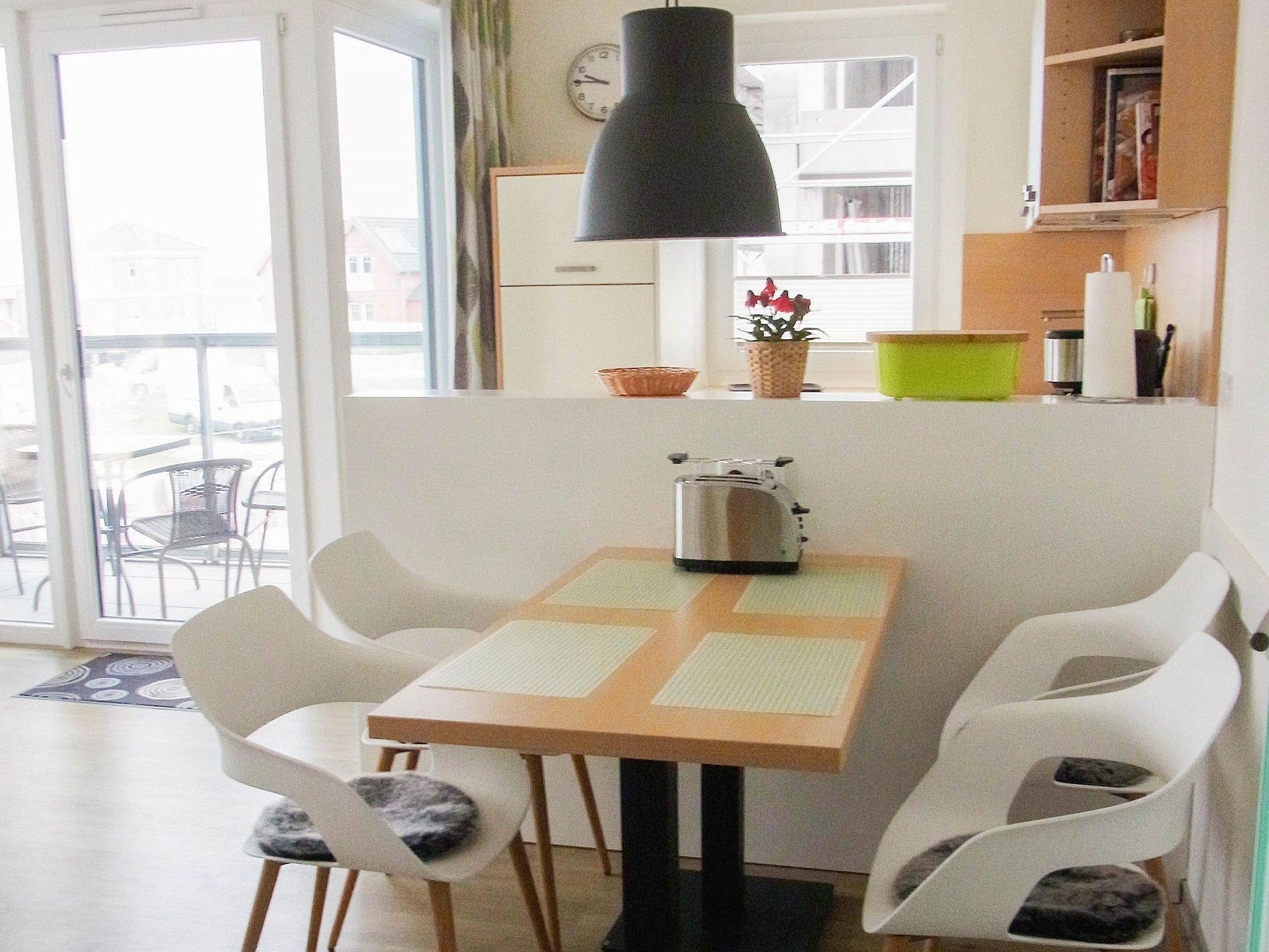 Derwindgeschützte Balkon ist mit Sitzgelegenheiten für 4 Personen und einem kleinen Tisch ausgestattet. Hier lassen Sie die Seele baumeln und einen schönen Urlaubstag, zum Beispiel bei einem leckeren Getränk, ausklingen.
