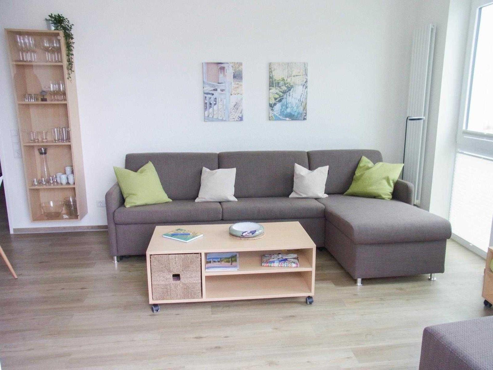 Im Wohnbereich erwartet Sie eine gemütliche Eckcouch, die im Nu zu einem bequemen Bett mit großer Liegefläche umgebaut ist. Hier können zwei Personen bequem schlafen. Auf dem 43 Zoll UHD SAT-TV empfangen Sie kostenlos diverse sky-Programme.