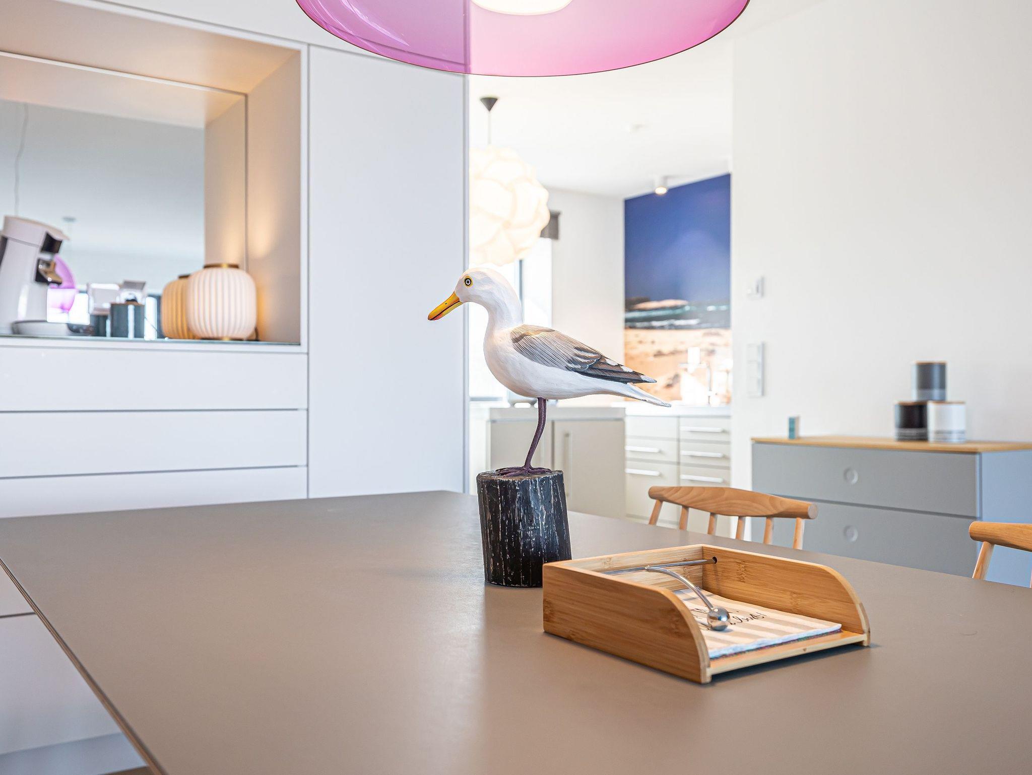 Verbringen Sie unvergessliche Urlaubstage in einem großzügigen 3-Zimmer-Apartment, das höchsten Ansprüchen gerecht wird. Die offene, komplett ausgestattete Küche, geschmückt mit einem inspirierenden Wandbild, lädt zu geselligen Kochabenden ein. Im eleganten Wohnbereich mit Kamin genießen Sie eine gemütliche Atmosphäre und einen spektakulären Blick auf den Hafen, die Schleimündung mit ihrem Leuchtturm sowie die Ostsee.