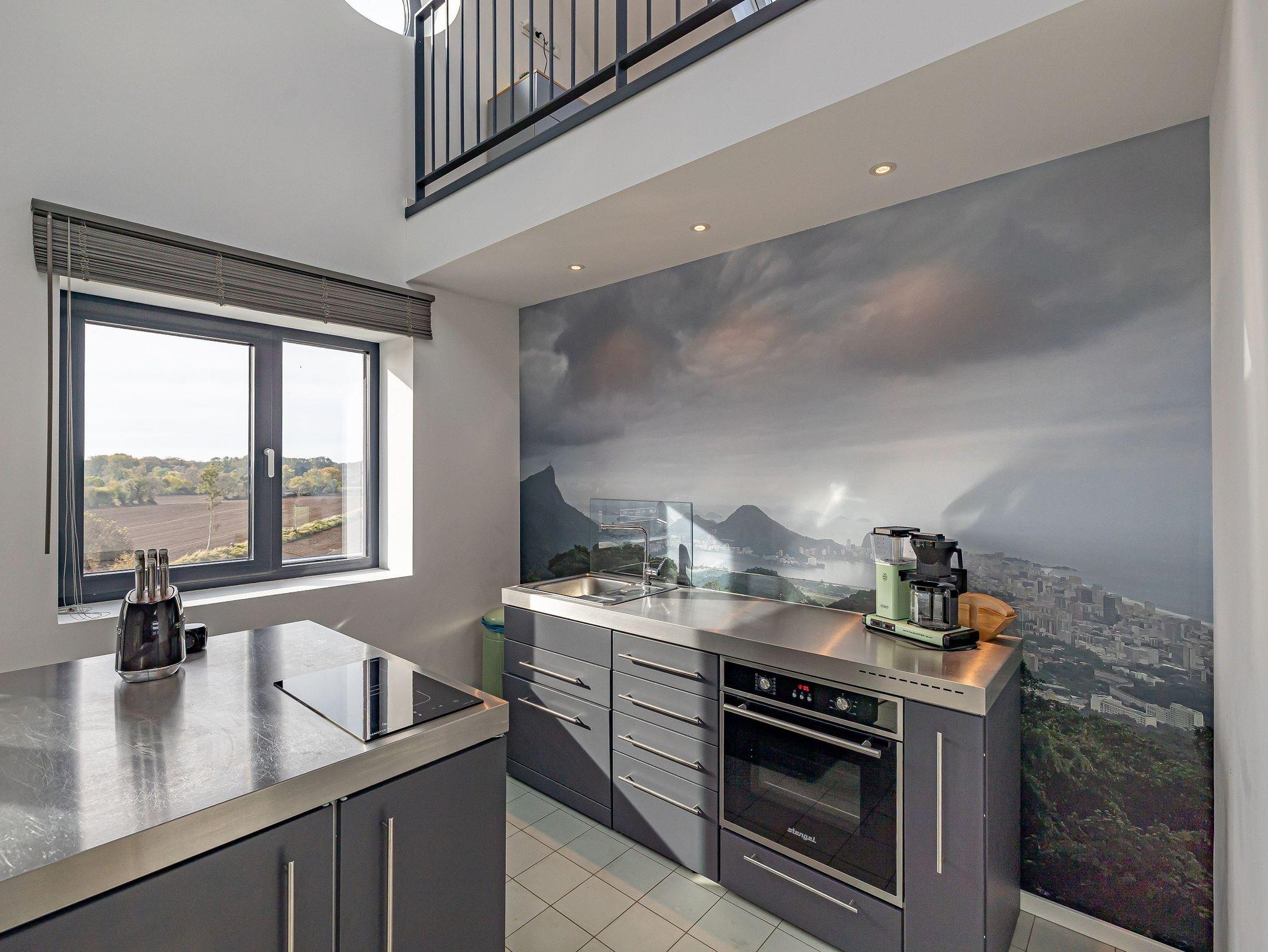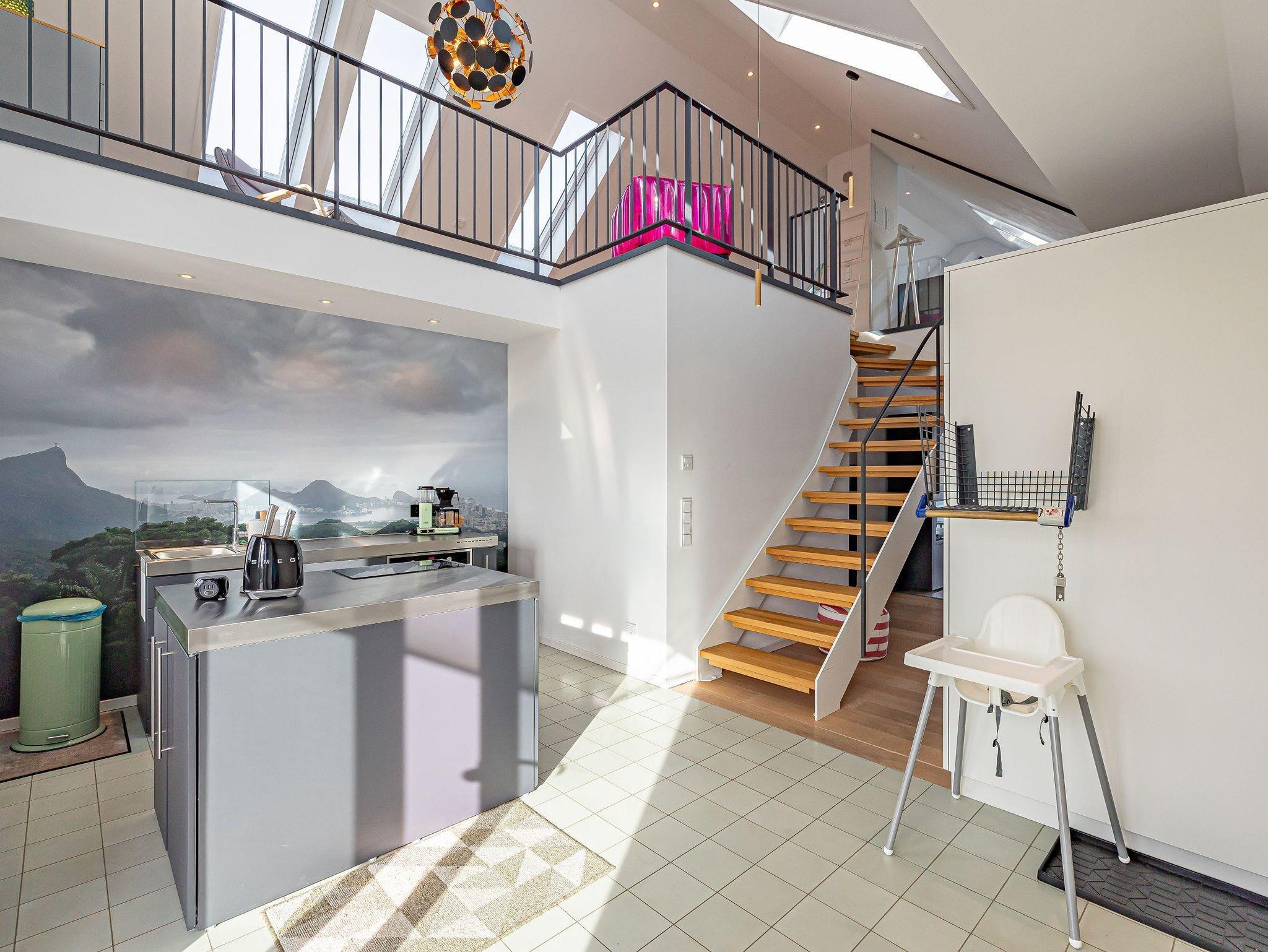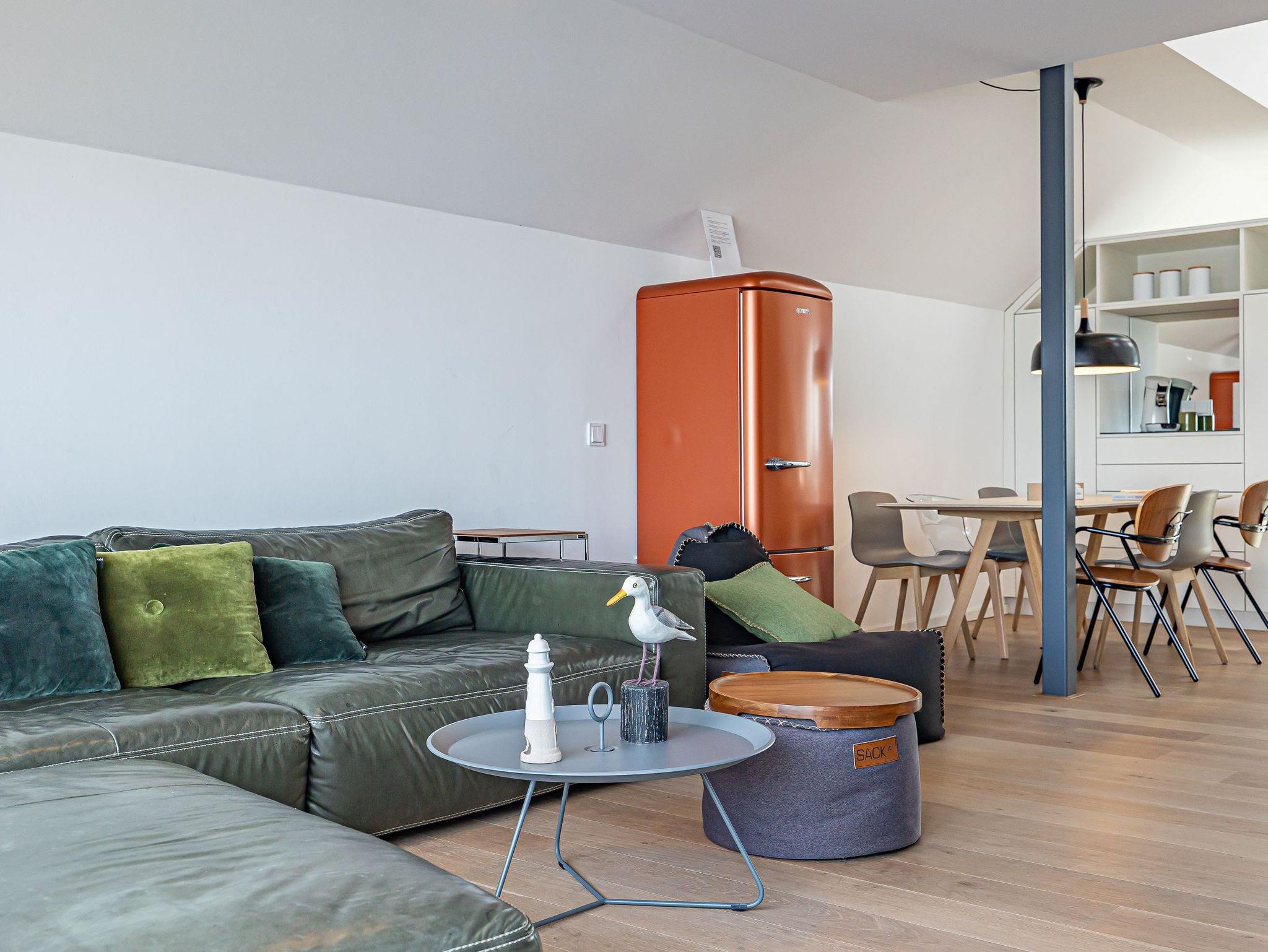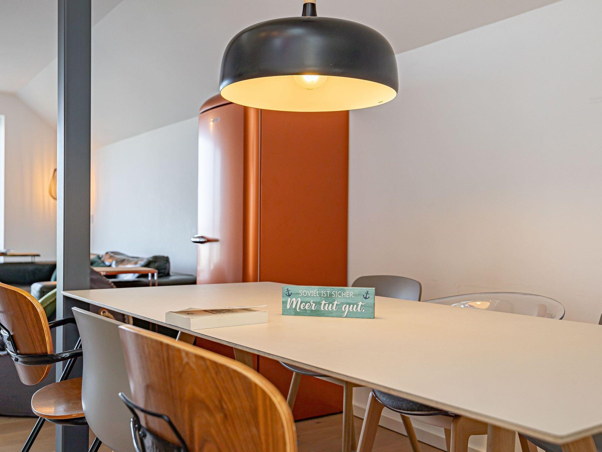 Tauchen Sie ein in Luxus und Komfort in dieser stilvollen 126 m² großen Maisonette-Wohnung mit offenem Dachausbau, perfekt für bis zu 6 Personen. Die großzügige, voll ausgestattete Küche mit einem originellen Wandbild lädt dazu ein, kulinarische Momente gemeinsam zu genießen. Der elegant gestaltete Wohnbereich mit Kamin bietet nicht nur eine gemütliche Atmosphäre, sondern auch einen atemberaubenden Panoramablick auf den Hafen, Schleimünde mit seinem Leuchtturm und die Ostsee.