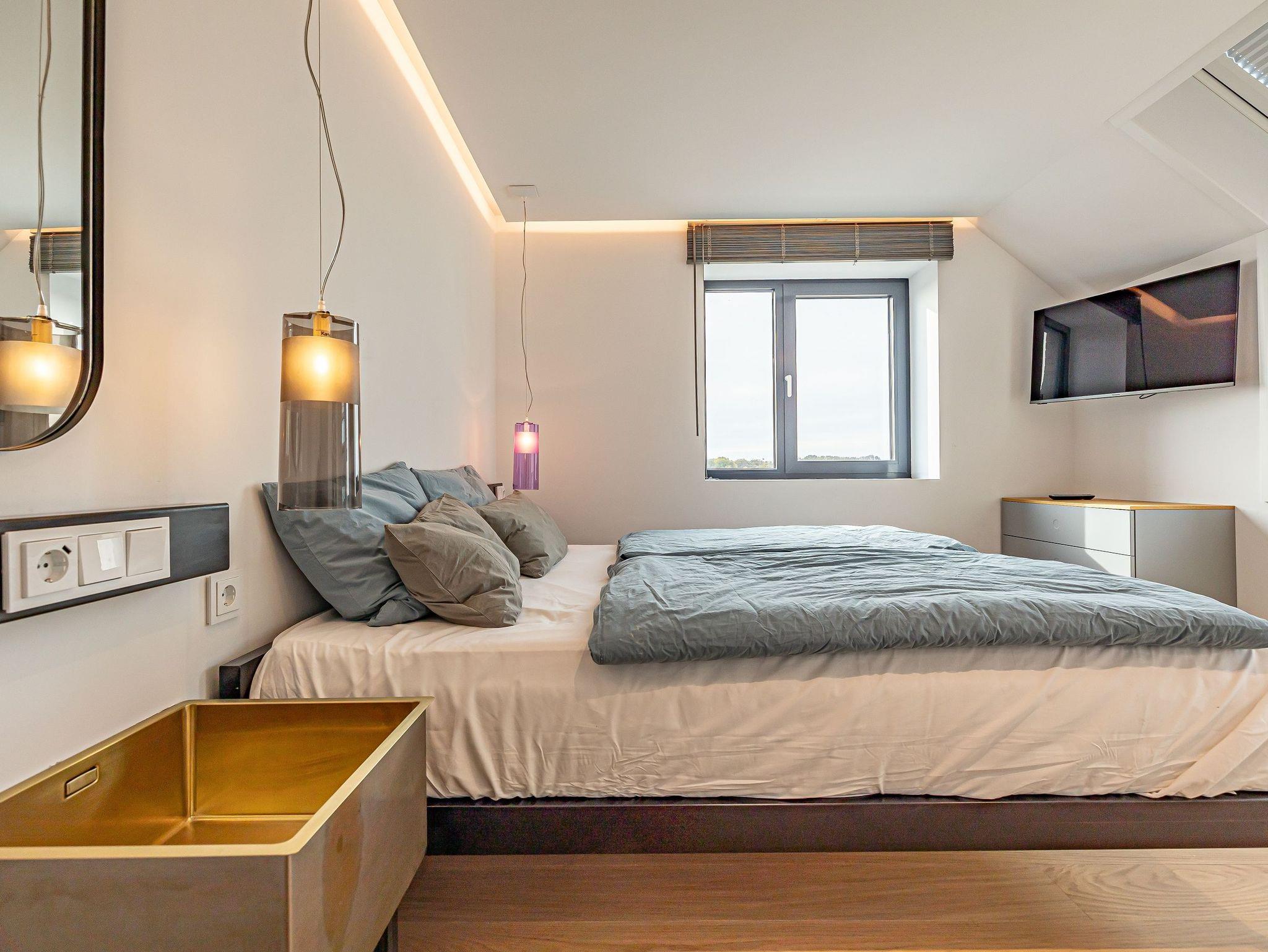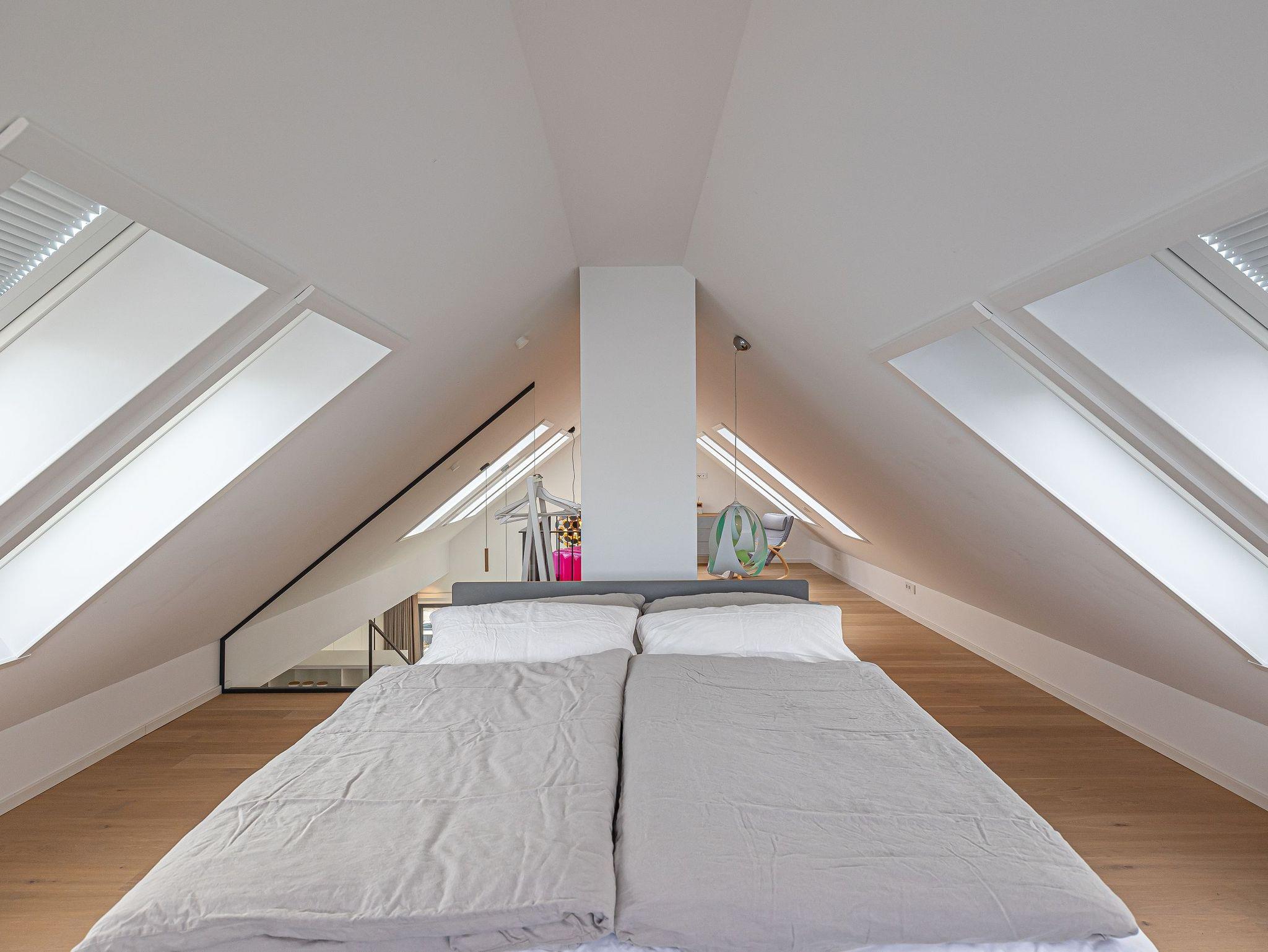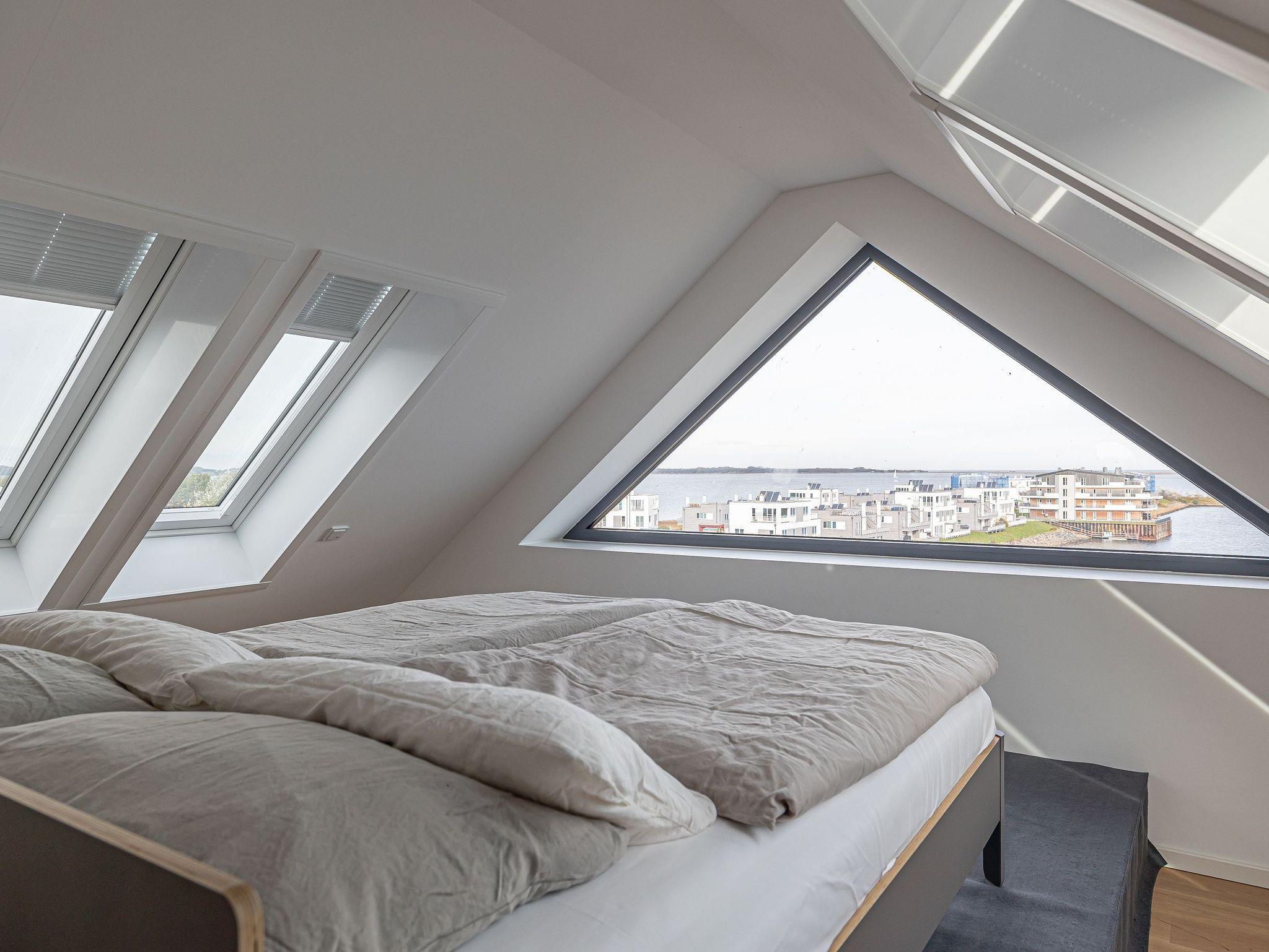 Der lichtdurchflutete Dachausbau mit großen Fenstern verleiht ein außergewöhnliches Wohngefühl. Hier erwartet Sie ein bequemes Bett, von dem aus Sie einen ungestörten Blick auf die Schlei und die Ostsee genießen können ein wahrer Rückzugsort.