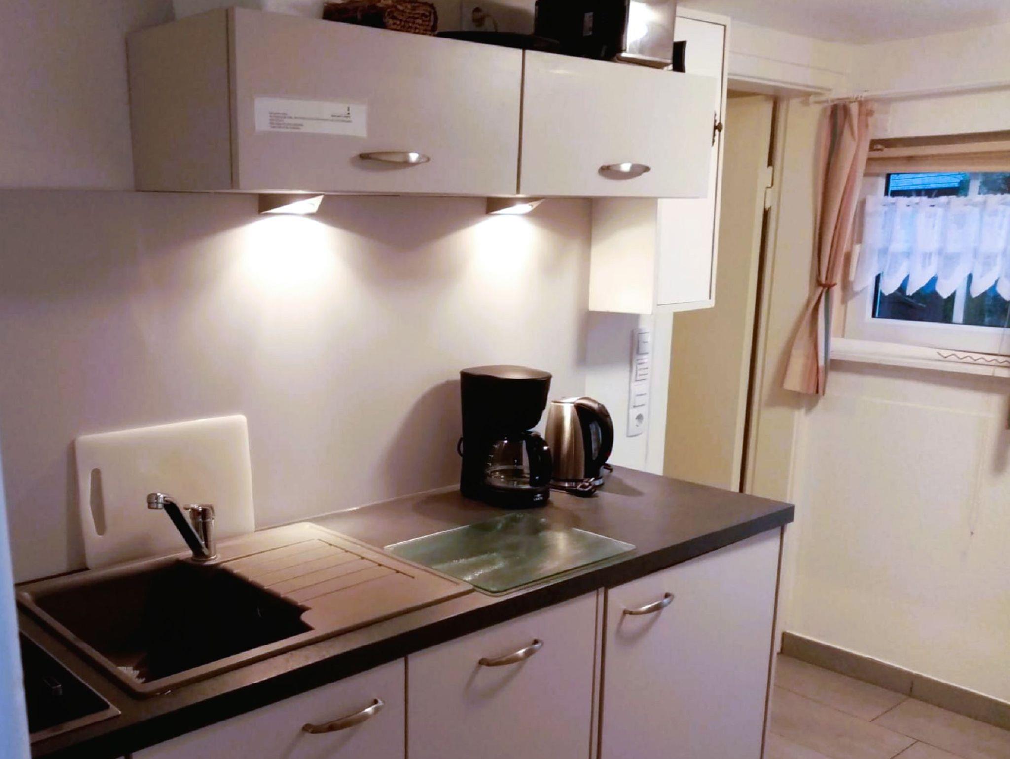 Ferienwohnung 27 für 2 Personen im EG. Wohnzimmer mit Schlafcouch und Schlafzimmer mit Doppelbett. Neue Einbauküche mit Geschirrspüler und Cerankochfeld. Große Dusche (120) und WC.