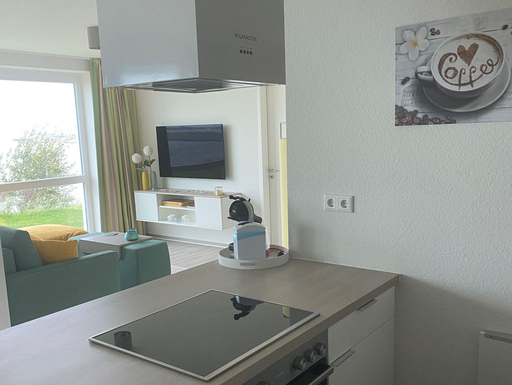 Helle Wohnung mit offenen Wohn-Küchenbereich, modern eingerichtet, Wasserblick, Terrasse Südwest Ausrichtung