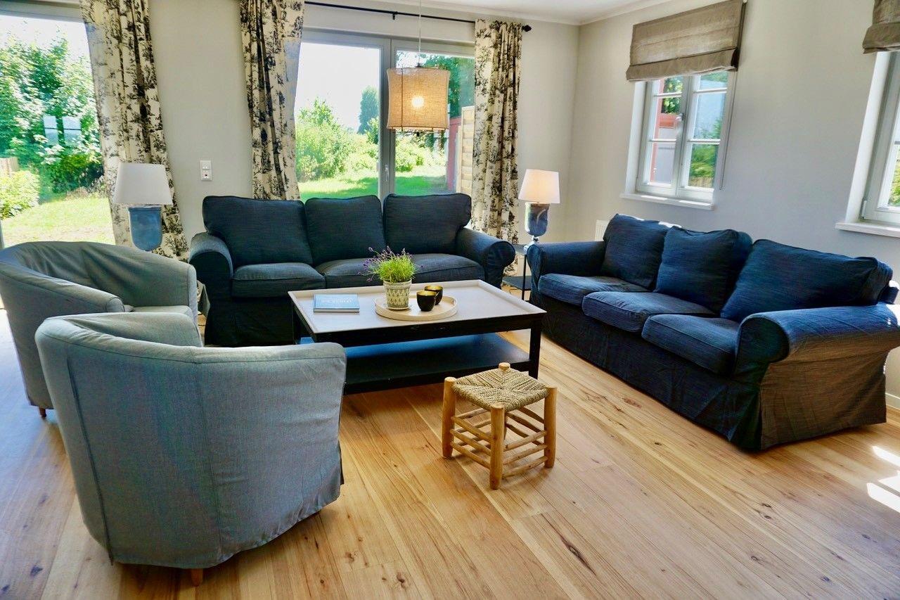 Der kombinierte Wohn- und Essbereich des Meierhus ist mit einem Kaminofen ausgestattet und grenzt an die offene Küche. Die Küche ist voll ausgestattet mit einer Mikrowelle, Induktionskochfeld, Backofen, Kühlschrank, Gefriermöglichkeit, Spülmaschine, Filterkaffeemaschine und Kaffeevollautomat, Wasserkocher, Toaster, Handrührgerät, Eierkocher, Raclette sowie Geschirr und Besteck.