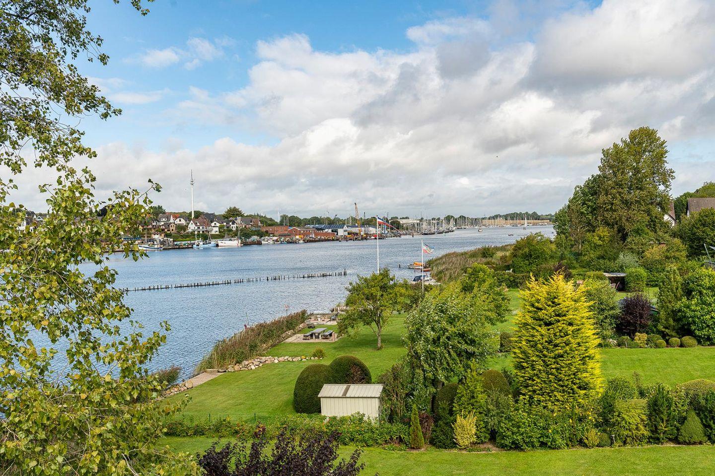 Genießen Sie den atemberaubenden Ausblick durch die Atelierverglasung auf die Schlei und Kappeln, entspannen Sie vor dem Kamin im Wohnbereich mit Blick auf das Wasser. Die Wohnung ist stilvoll und edel mit skandinavischen Akzenten eingerichtet.