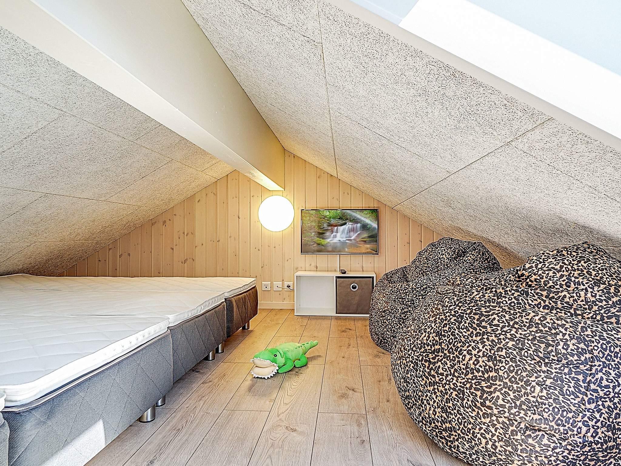 Poolraum. Die Einzelbetten können zu Doppelbetten zusammengeschoben werden. Auf der Schlafgalerie mit vier Schlafplätzen und Fernseher