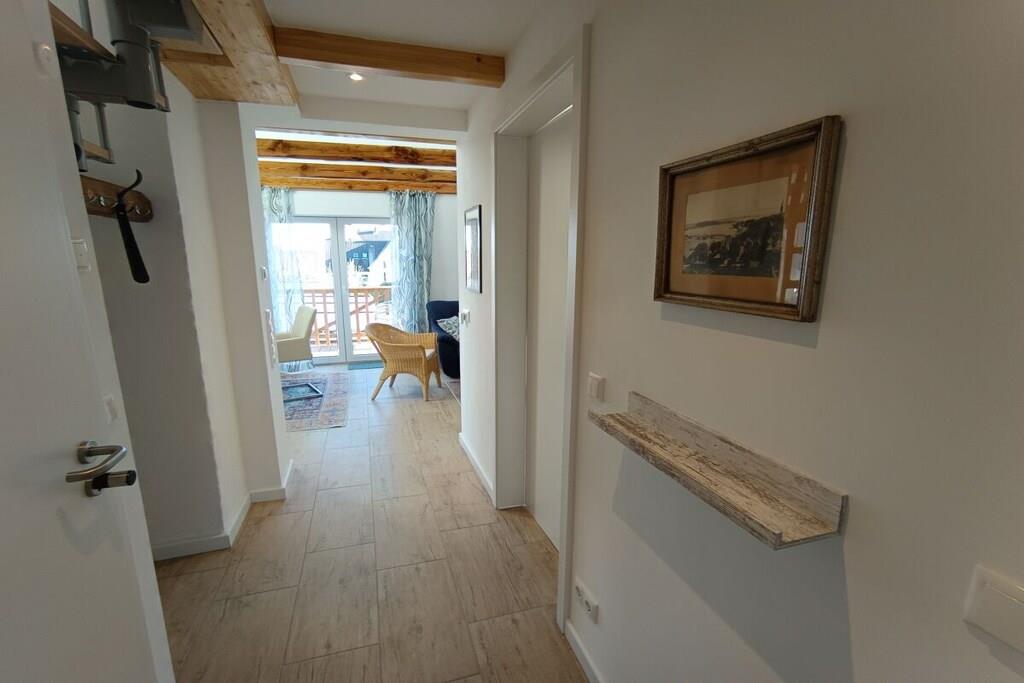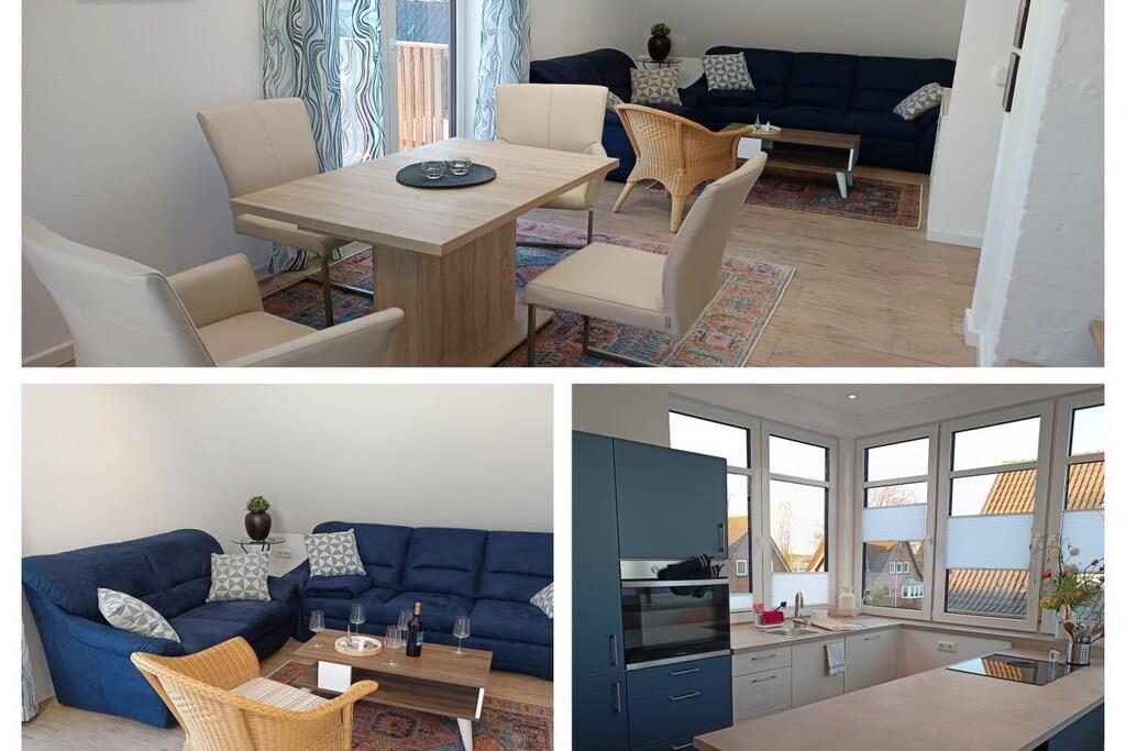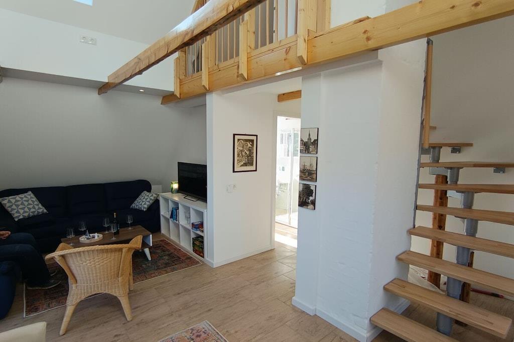 Die gemütlich-modern eingerichtete Ferienwohnung bietet auf der unteren Ebene Fußbodenheizung und Fliesen, während die Empore mit Holzdielen ausgestattet ist. Der lichtdurchflutete Wohn-, Ess- und Küchenbereich öffnet sich bis in den Giebel und bietet einen Blick auf den Garten. Die Küche mit Halbinsel und Barhockern lädt zum gemeinsamen Kochen oder Kaffeetrinken ein. Der ausziehbare Esstisch bietet ausreichend Platz für Mahlzeiten, Spielabende und gesellige Gespräche bei einem Glas Wein. Zwei Sofas laden dazu ein, die Abende entspannt mit einem Smart-TV oder netten Gesprächen ausklingen zu lassen. Die Schlafräume befinden sich auf der Empore und im nördlichen Teil der Wohnung.