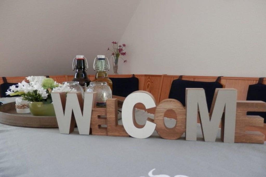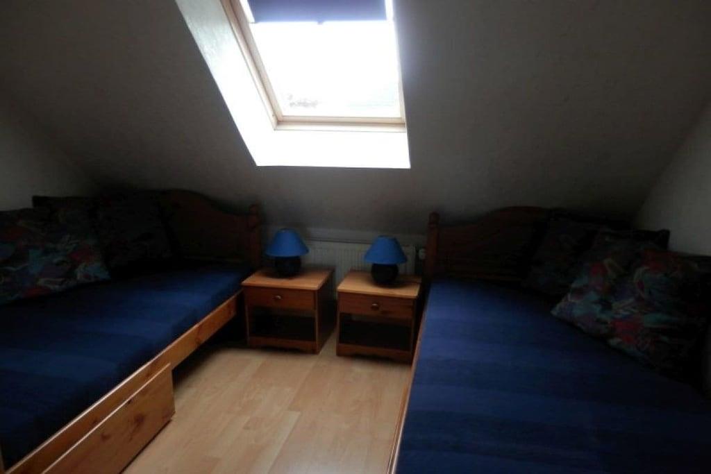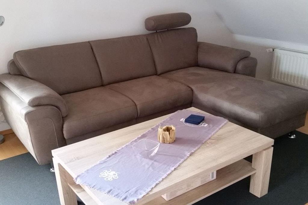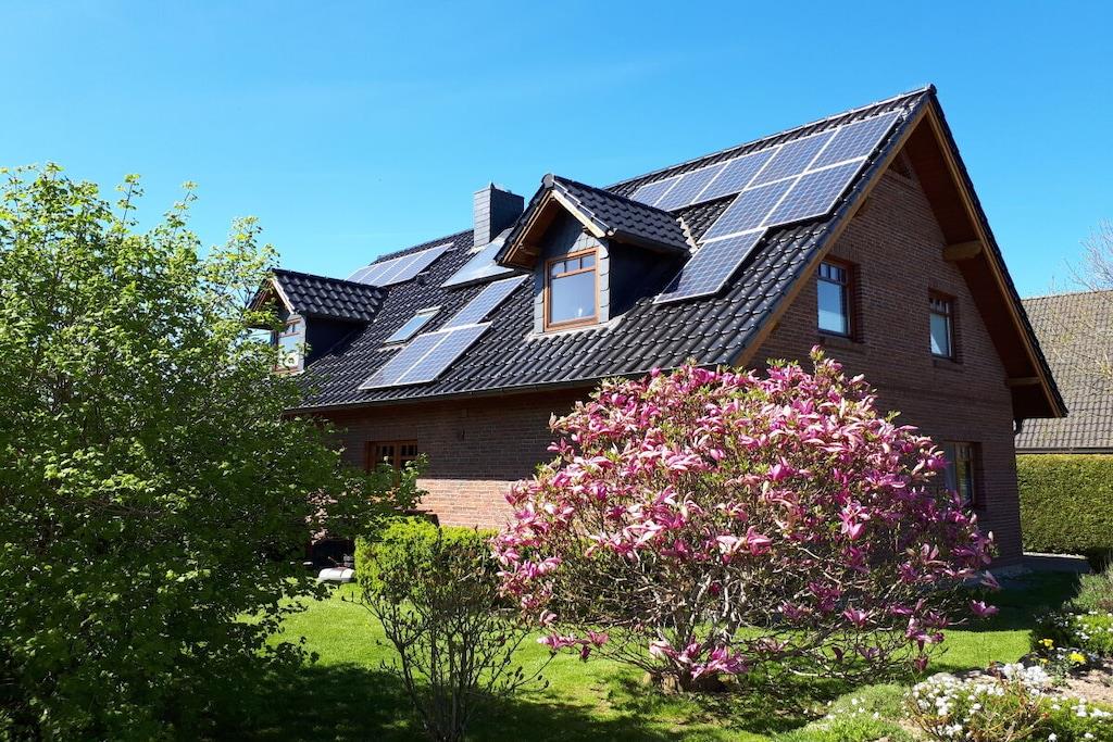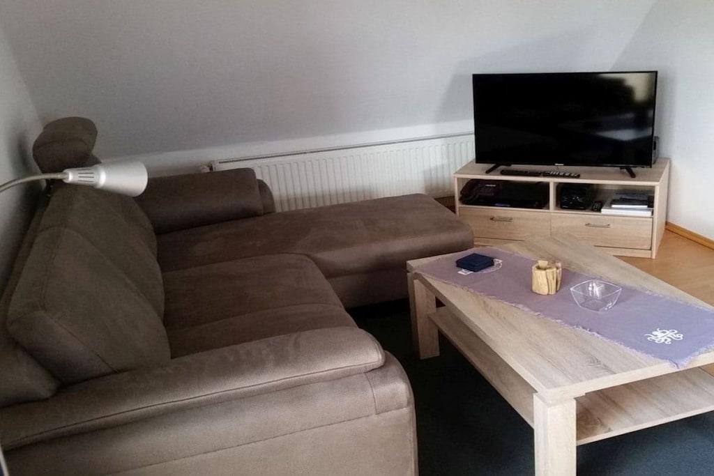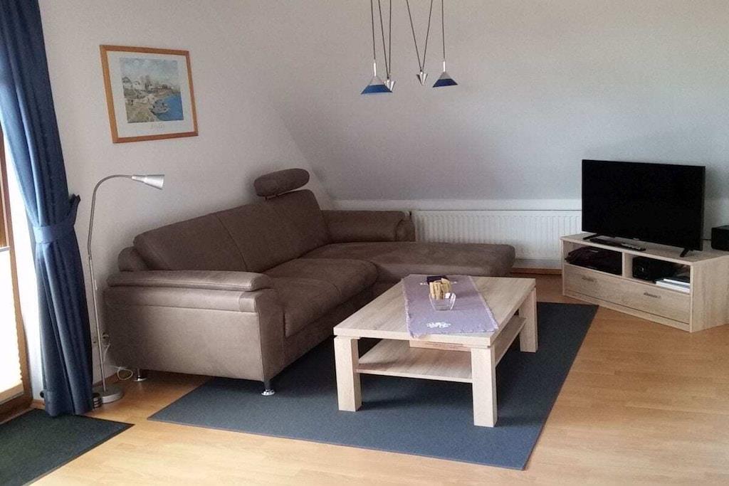 Unsere gemütlich eingerichtete Ferienwohnung ist 75 m² groß und hat einen großen Balkon zur Südseite. Sie können hier ab Mittags bis zum Sonnenuntergang die Sonne mit Ausblick in den ruhigen Garten genießen. Unsere Ferienwohnung befindet sich auf der 1. Etage und besteht aus einem großen hellen Wohnraum, ausgestattet mit Sitzecke, Wohnzimmertisch, Flat-TV und Stereoanlage, einer Küche mit Essecke, die u.a. mit Geschirrspüler, Mikrowelle und Backofen ausgestattet ist. Darüber hinaus gibt es 2 Schlafzimmer (ein großes Zimmer mit Doppelbett, Schreibtisch und einem kleinen Flat-TV und ein kleines Zimmer mit 2 Einzelbetten), Dusche/WC, Waschmaschine, W-Lan und Kabel-TV. Kinderbett, Kinderhochstuhl etc. auf Anfrage
