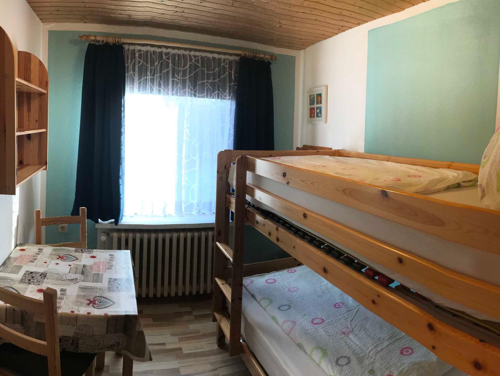 ein Kinderzimmer mit Etagenbett und Dusche/WC.