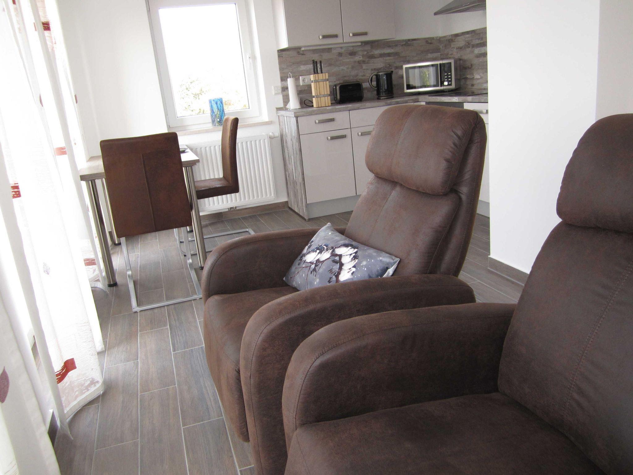Der Wohnraum mit Esstisch und gemütlichen Sesseln. Sat- Fernseher.