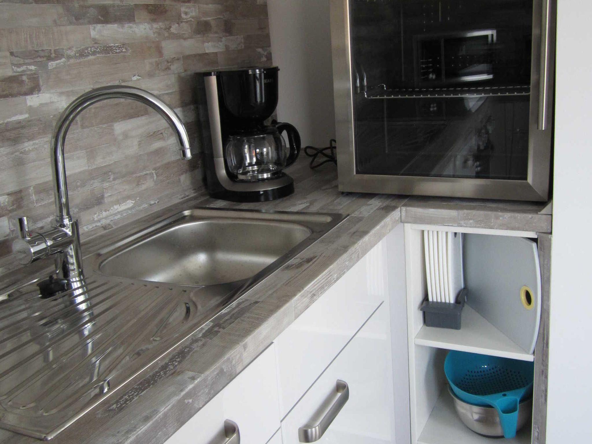 Die Küchenzeile mit Backofen, Herd mit Ceranfeld, Mikrowelle, Kühlschrank mit Gefrierfach, Geschirrspüler, Toaster, Wasserkocher und Kaffeemaschine.