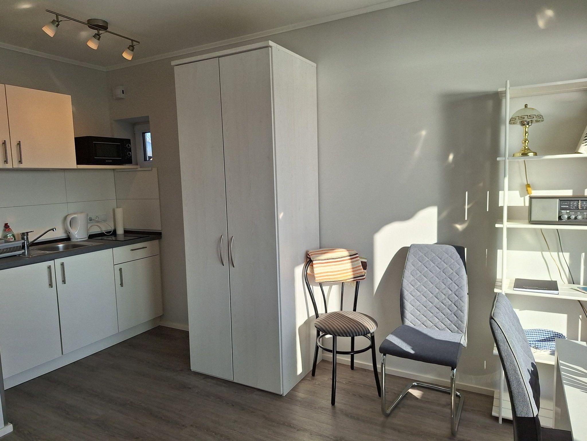 Das Appartement ist hell und mit viel Liebe zum Detail eingerichtet. Sie finden hier alles, was Ihnen Ihren Aufenthalt zu einem angenehmen Erlebnis macht. Die integrierte, neuwertige Pantry-Küche ist großzügig ausgestattet, u.a. mit Kaffeemaschine, Toaster und Mikrowelle.
