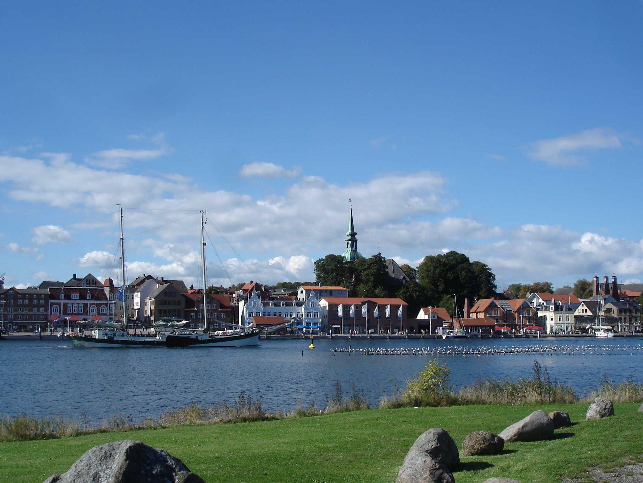 Der Balkon ist mit zwei Stühlen, Tisch, und Sonnenschirm ausgestattet mit einem wunderschönen Blick auf die Nicolai Kirche und auf die Schlei.