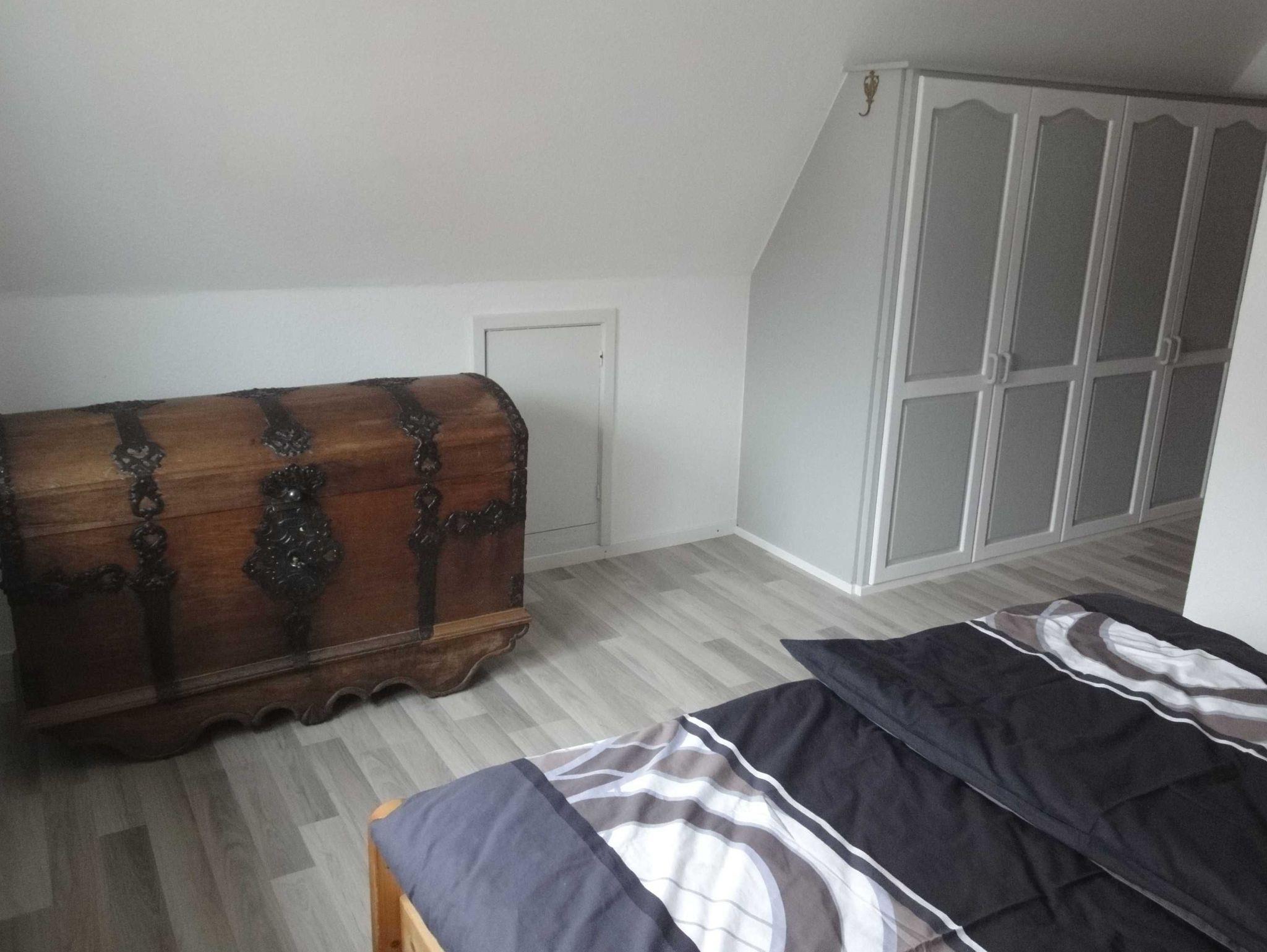 Eine schöne Dachgeschosswohnung für 2 Personen. Ein Schlafzimmer mit Doppelbett, Einbauschränke sowie eine alte Truhe.