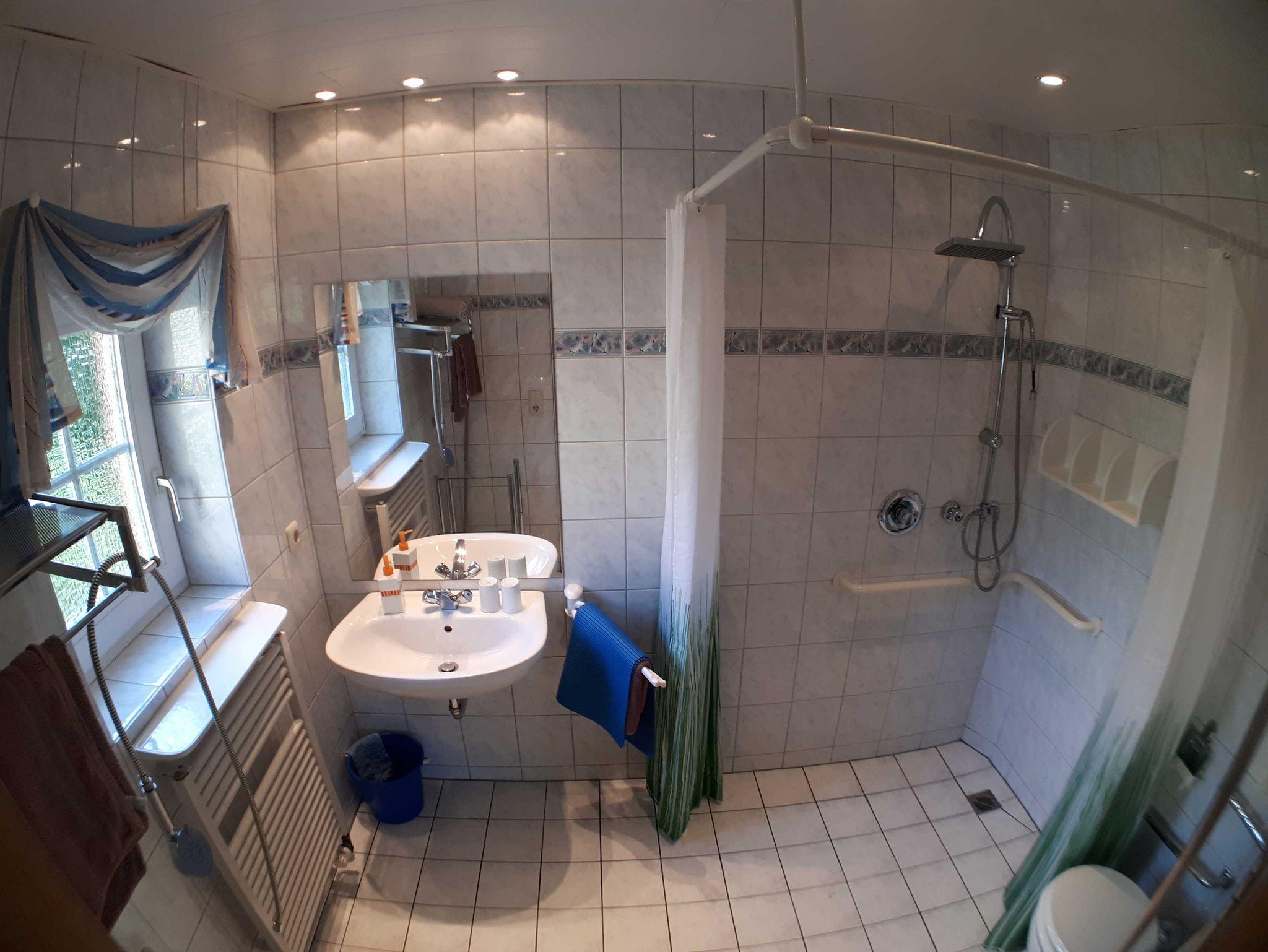 ¦Badezimmer, WC mit Haltegriff, Dusche mit dem Rollstuhl befahrbar, Waschbecken unterfahrbar und tief angebrachtem Spiegel.