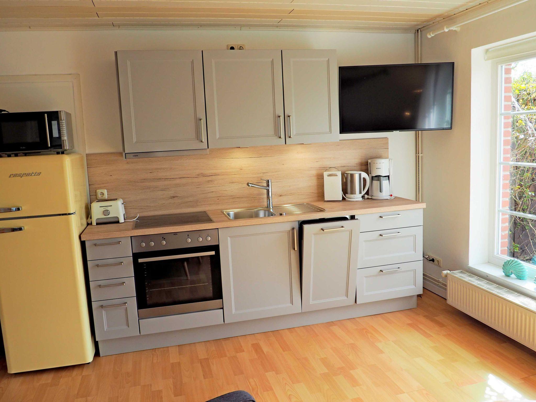 ¦Wohnküche mit Einbauküchenzeile, Kühlschrank, Microwelle, Esszimmertisch mit vier Stühlen, Radio, Smart-TV, eine Sitzecke.