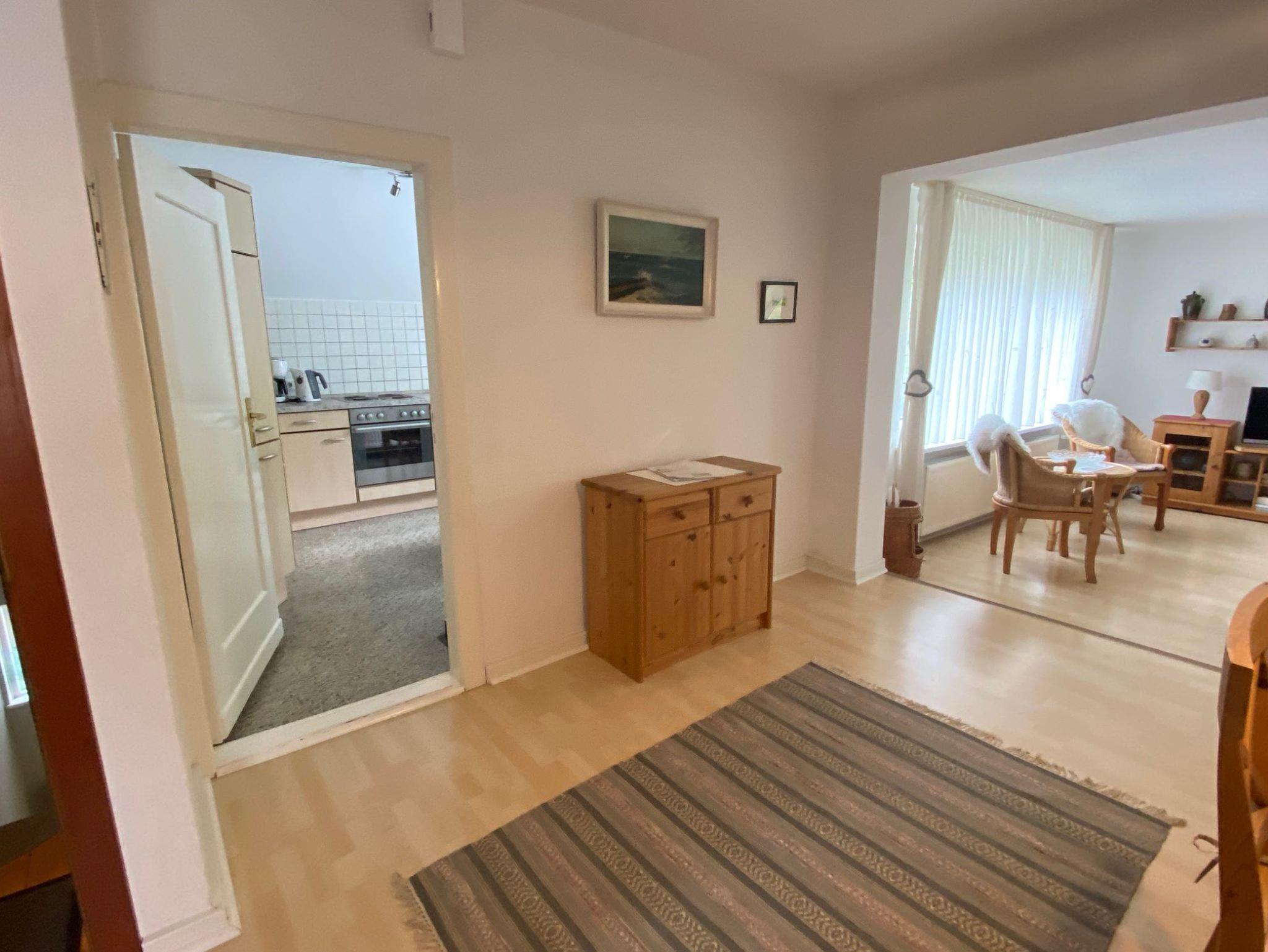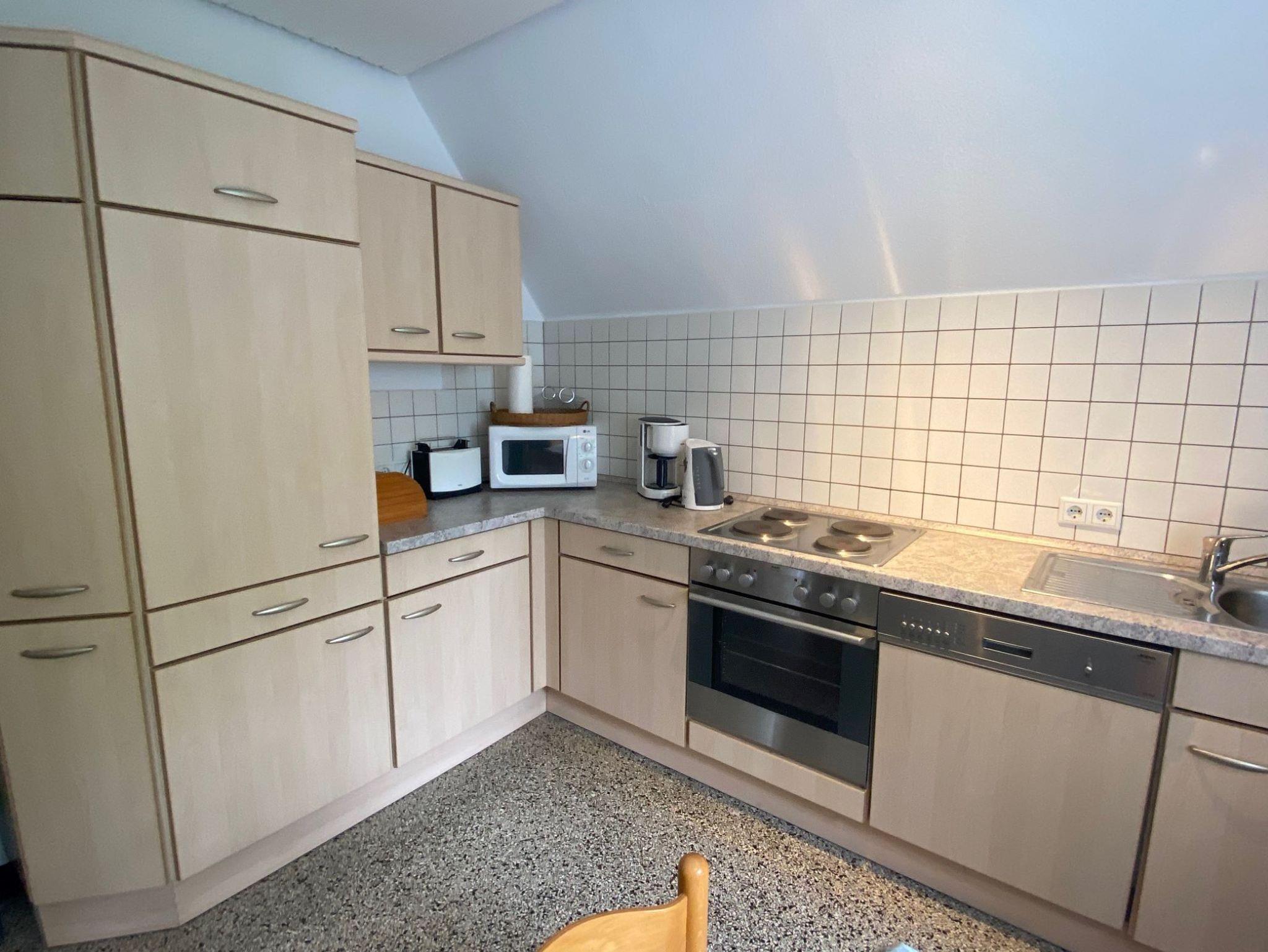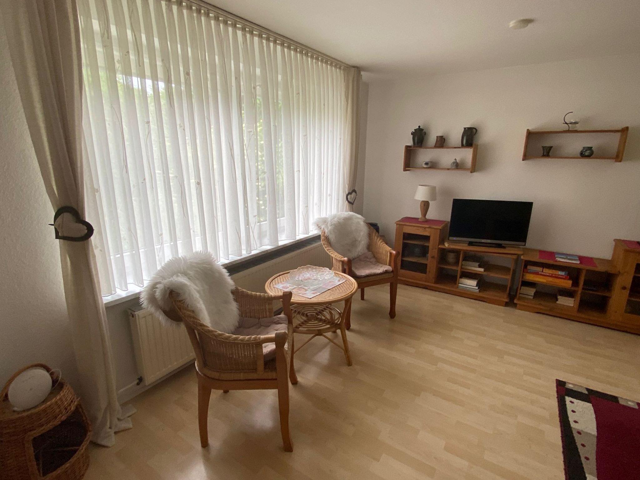 Gemütliche Ferienwohnung (75 m²) im Obergeschoss. 1 Schlafzimmer mit 1 Doppelbett, 1 Schlafzimmer mit 1 Einzelbett, 1 gemütlicher Wohnraum, Küche mit Geschirrspüler, Du/WC, Kabelfernsehen.