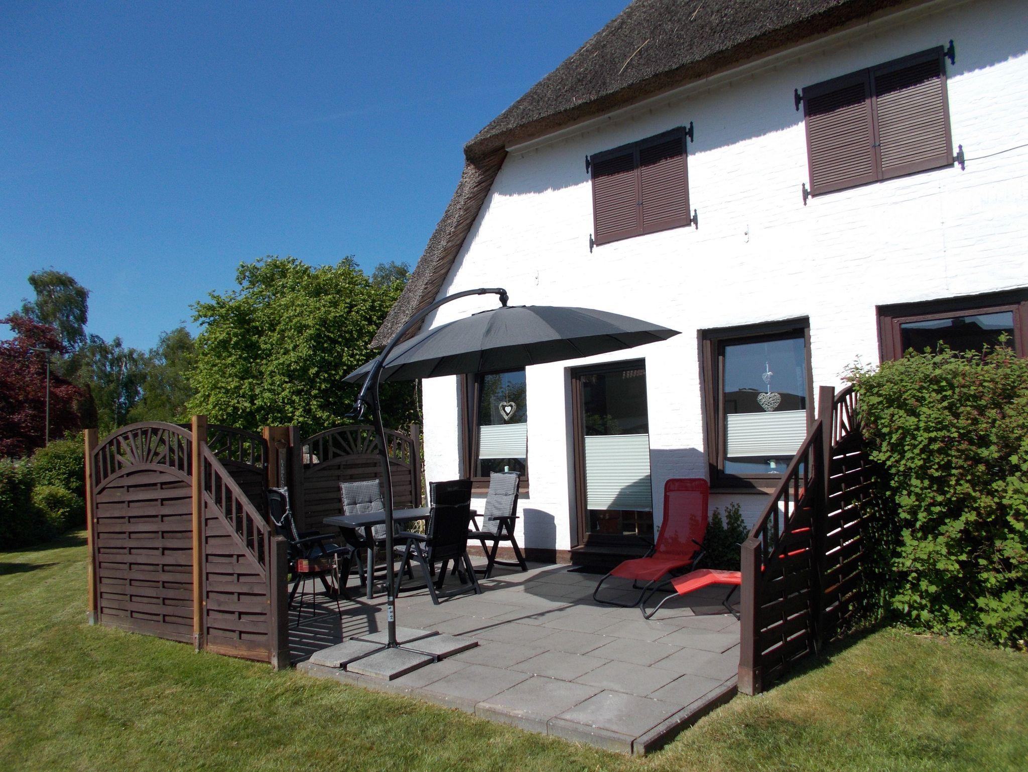 Unsere 65qm² große Erdgeschoßwohnung befindet sich in einem gepflegten,reetgedeckten Mehrfamilienhaus. Ruhig gelegen, bietet Ihnen unser komplett umzäuntes Haus alle Annehmlichkeiten für einen gelungenen Urlaub. Genießen Sie Ihren Urlaub auf der sonnigen, privat gehaltenen Terrasse mit Blick in den liebevoll angelegten, schönen großen Garten. Ihr sichtgeschützter Freisitz ist ausgestattet mit Tisch und Stühlen, sowie Liegen und einem Grill. Rauchen Sie bitte ausschließlich draußen, dort haben wir einen extra Bereich hierfür vorgesehen.