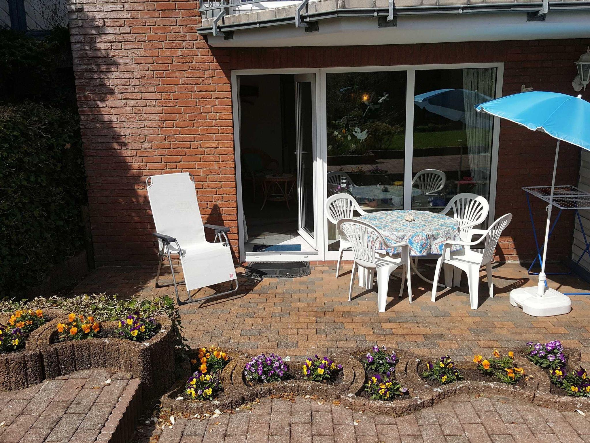 Unser gepflegter Rasen darf zum Sonnen oder zum Spielen genutzt werden. Eine Ruhebank lädt zum Lesen und Sonnen ein.