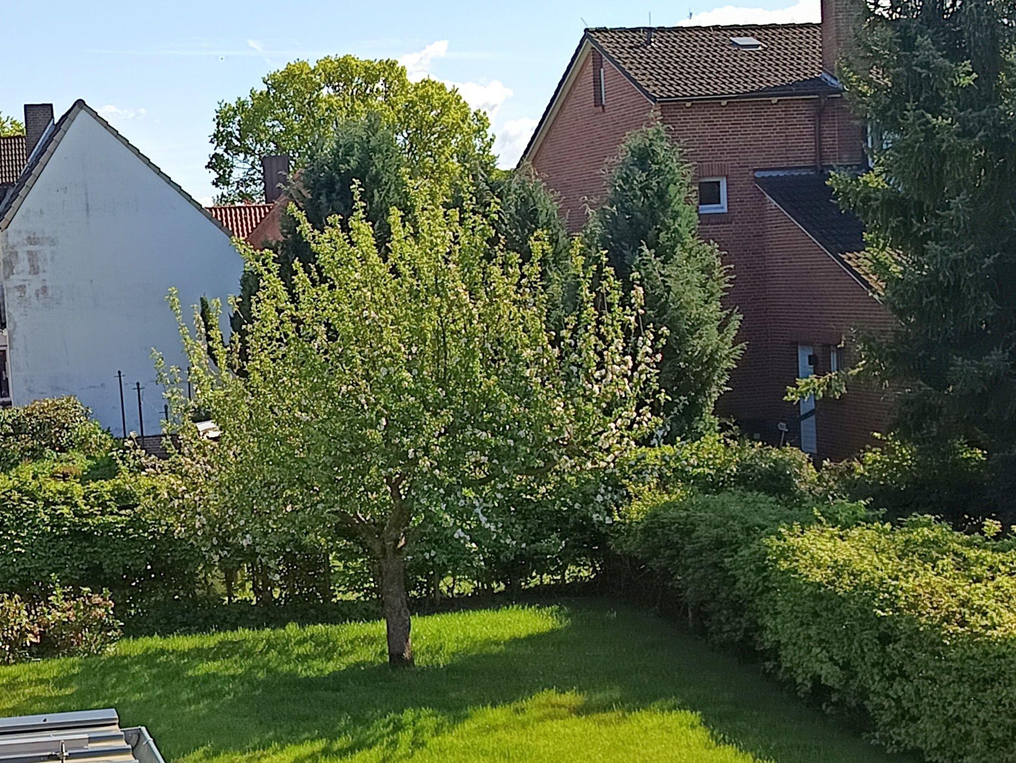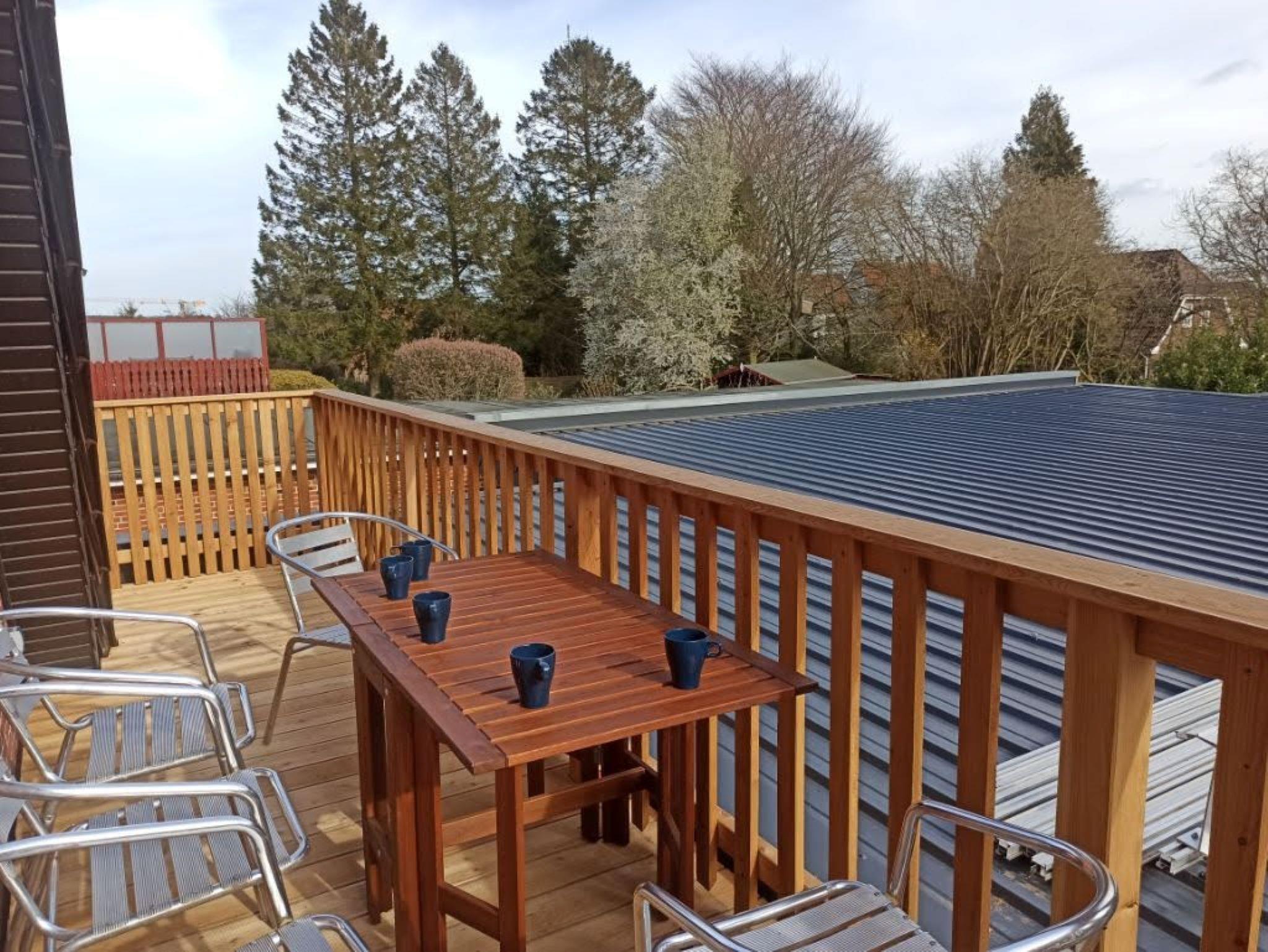 Der Holzbalkon mit Tisch und Stühlen, einer Süd-Westlage mit Blick auf den Garten mit altem Baumbestand und die beiden Kirchen, lädt bei trockenem Wetter den ganzen Tag zum Verweilen ein.