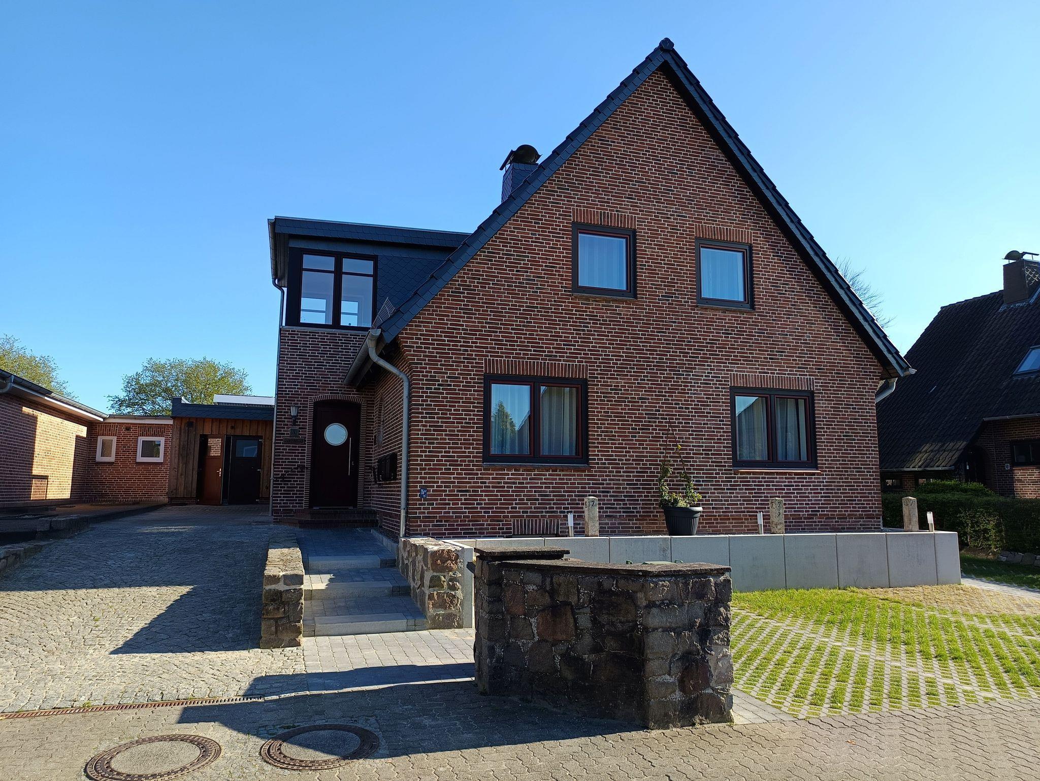 Unsere Ferienwohnung - bi Hugo, im ausgebautem Dachgeschoss - liegt in einer ruhigen Seitenstraße ca. 400 m von Kappelns Hafen entfernt. Sie bietet Ihnen mit einem offenen Wohnkonzept Platz für 4 Personen auf zwei Ebenen. Vor dem Haus befindet sich, der Parkplatz für die Ferienwohnung bi Hugo. Durch die Haustür und ein Treppenhaus, mit der original erhalten viertel gewendeten Treppe, erreichen Sie die Wohnung im neu ausgebauten Dachgeschoss. Vor der Wohnungstür finden Sie Platz für Schuhe und Garderobe. Dieser Treppenabsatz wird lediglich von unseren Gästen benutzt.