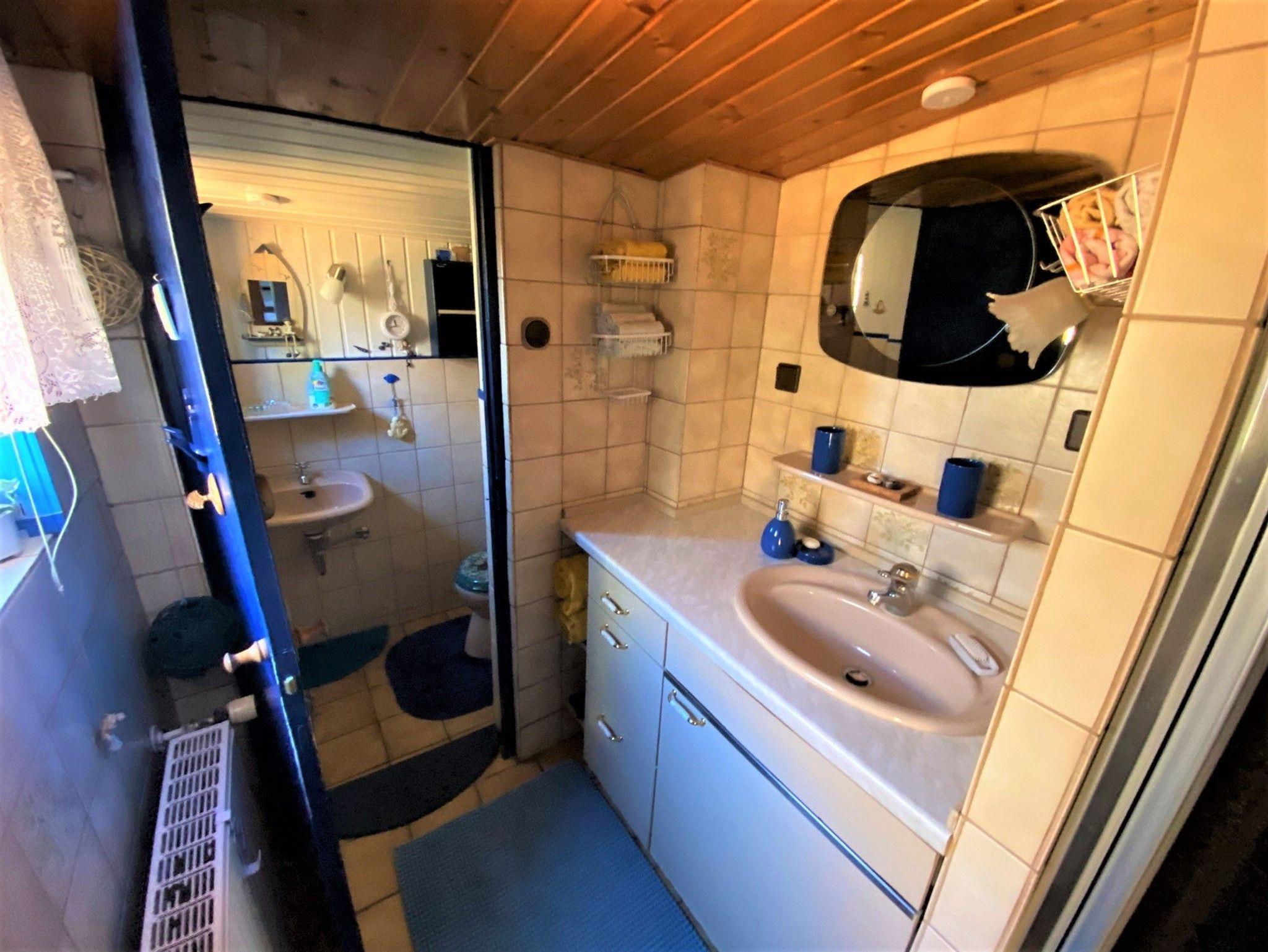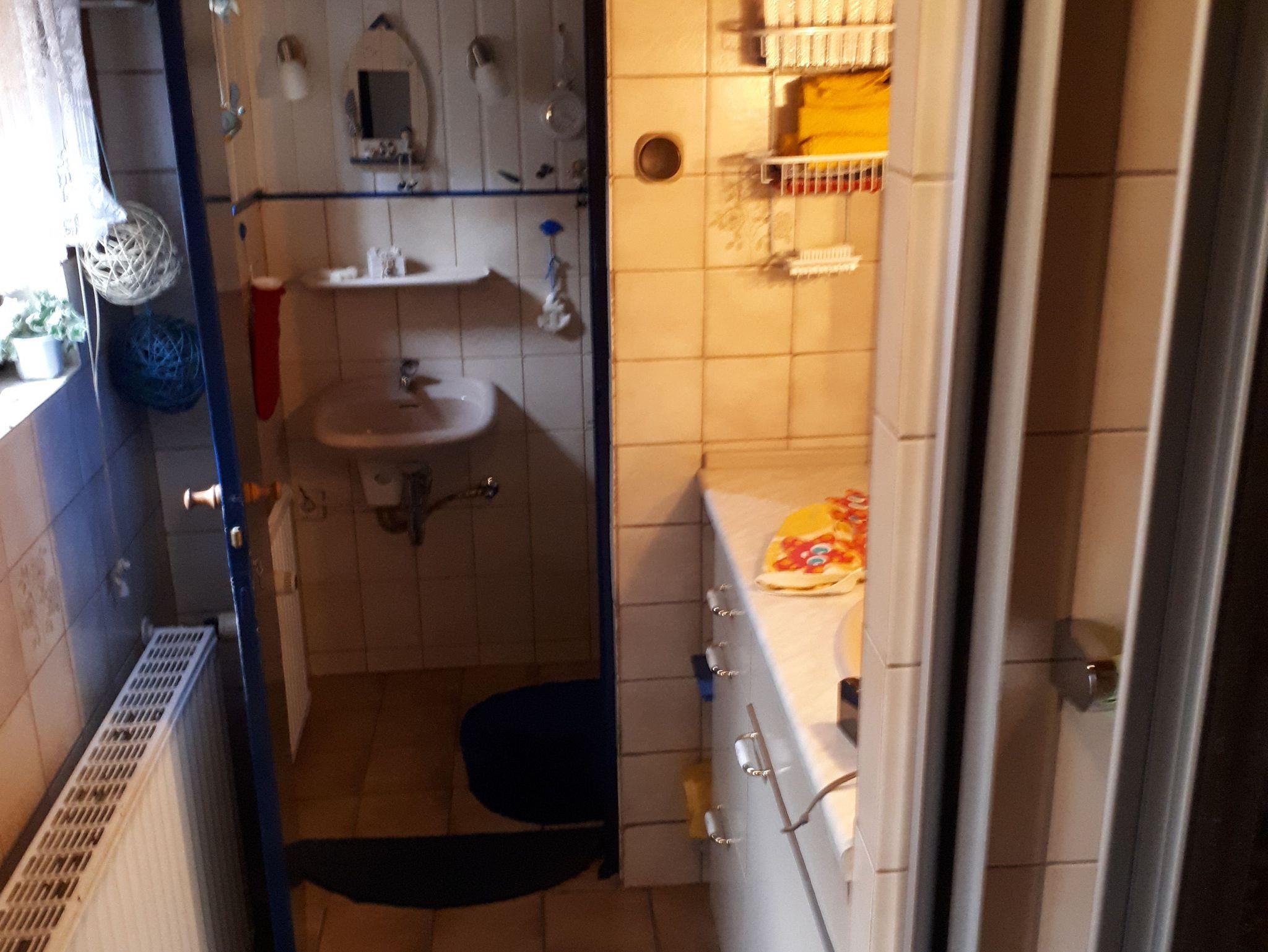 Innen befinden sich im Erdgeschoß 2 Schlafzimmer, das Esszimmer, die Küche und das Durchgangsbadezimmer mit Dusche und seperater Toilette.