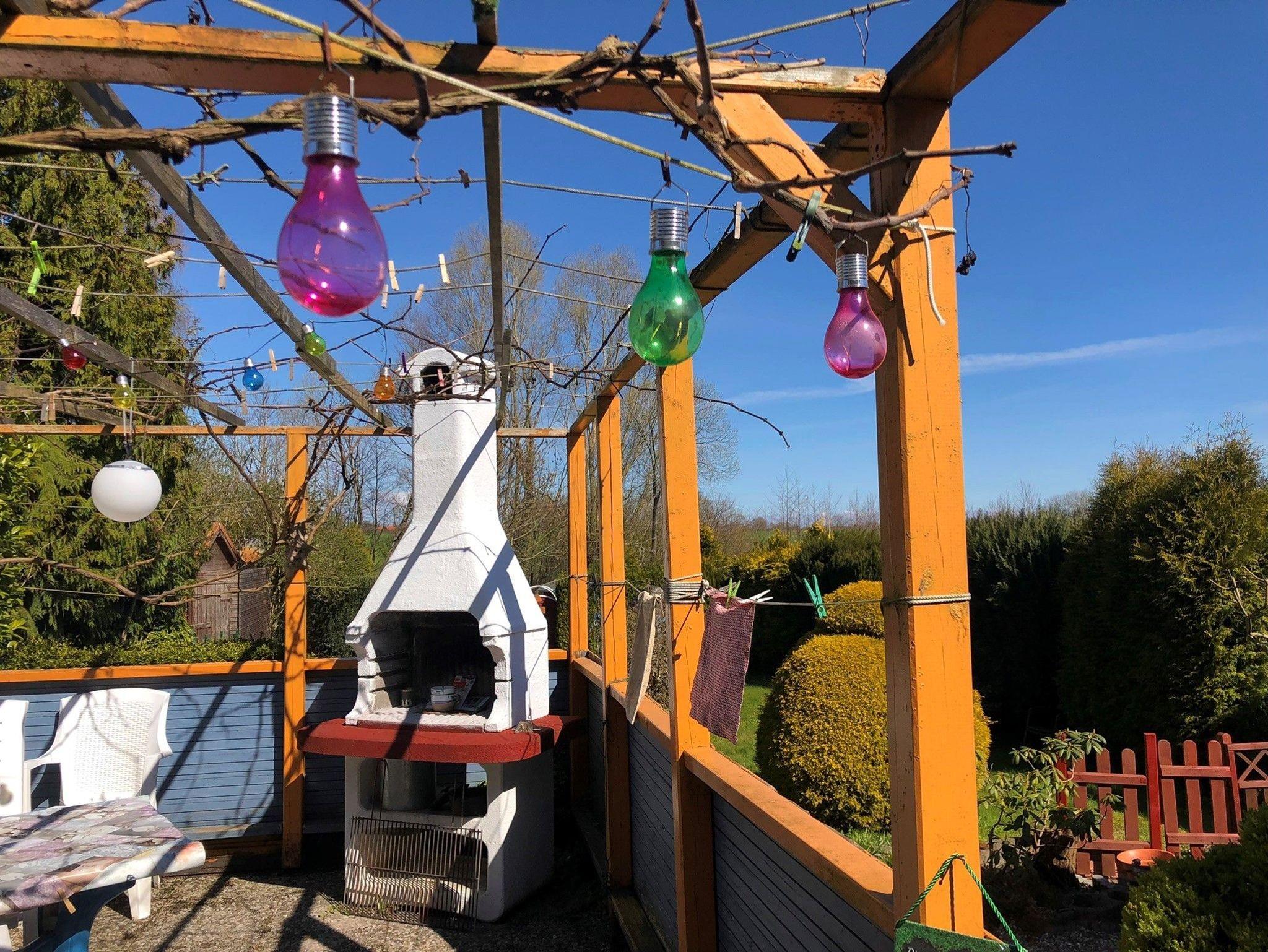 Die windgeschützte überdachte Terrasse lädt zum Relaxen und Sonnenbaden ein. Dort befindet sich auch ein feststehender Holzkohlegrill.