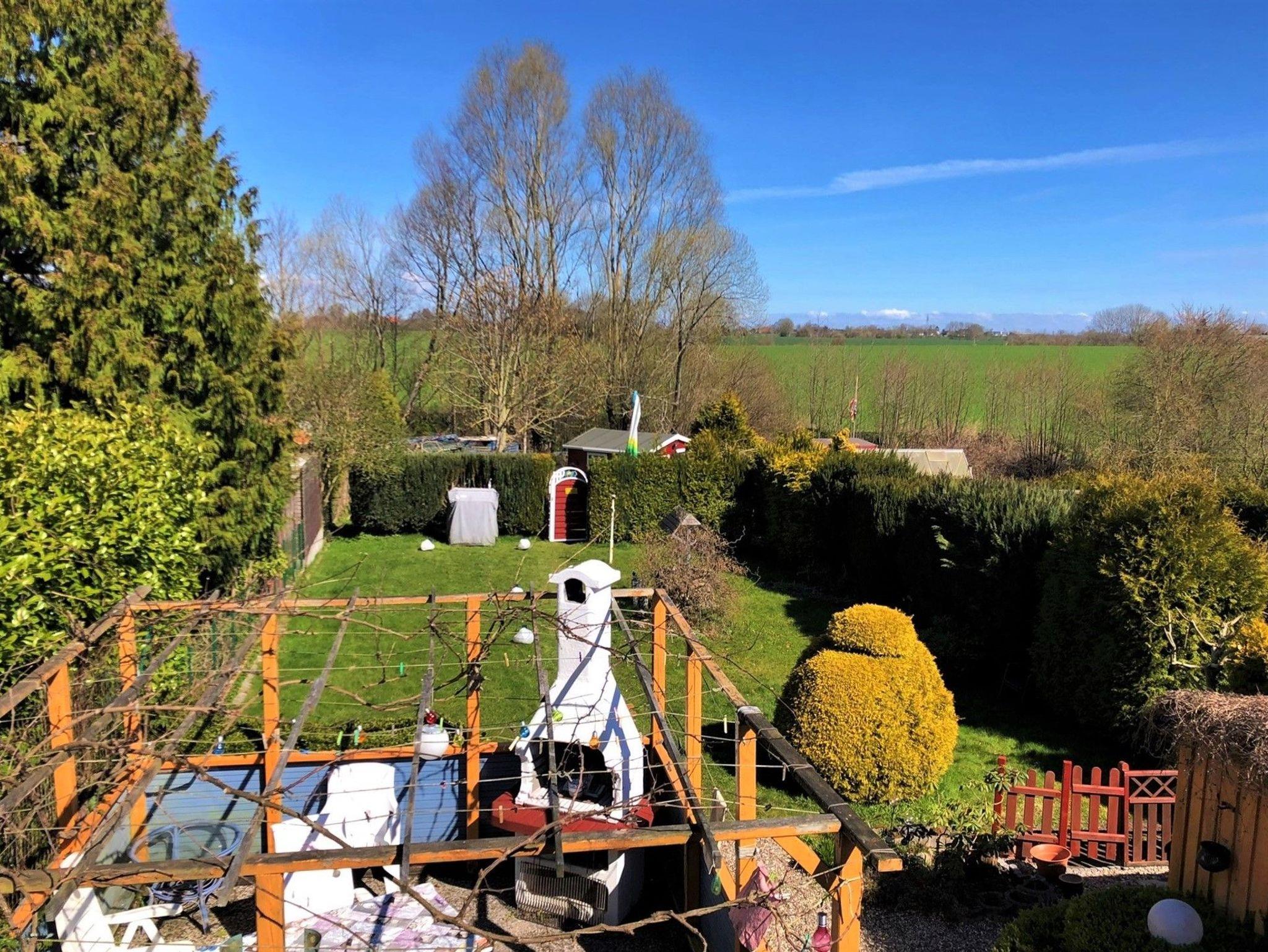 Ein Vorgarten und ein ca. 800 qm großer umfriedeter Garten mit überdachter Terrasse und stationärem Grill umrahmen das Haus.