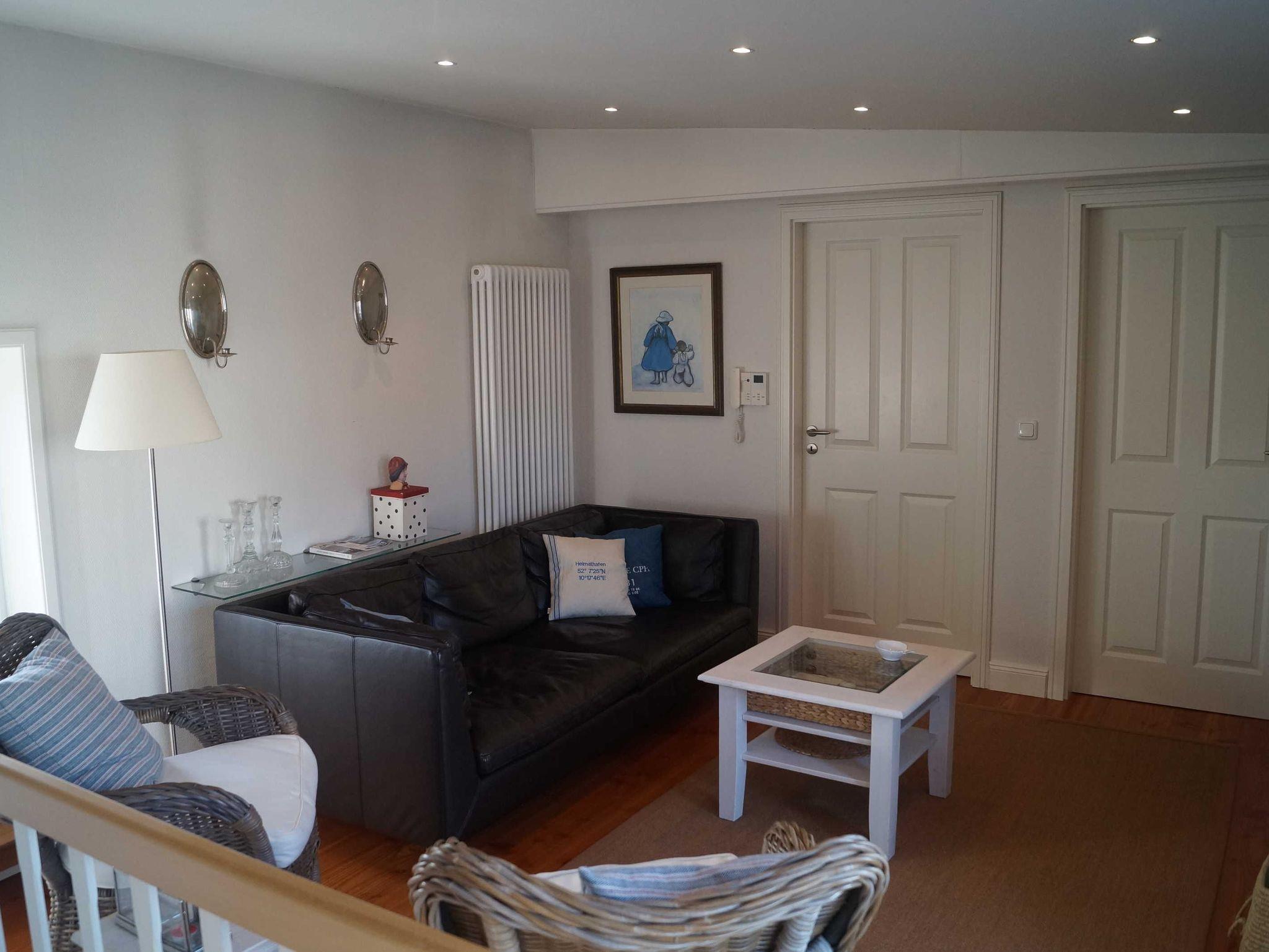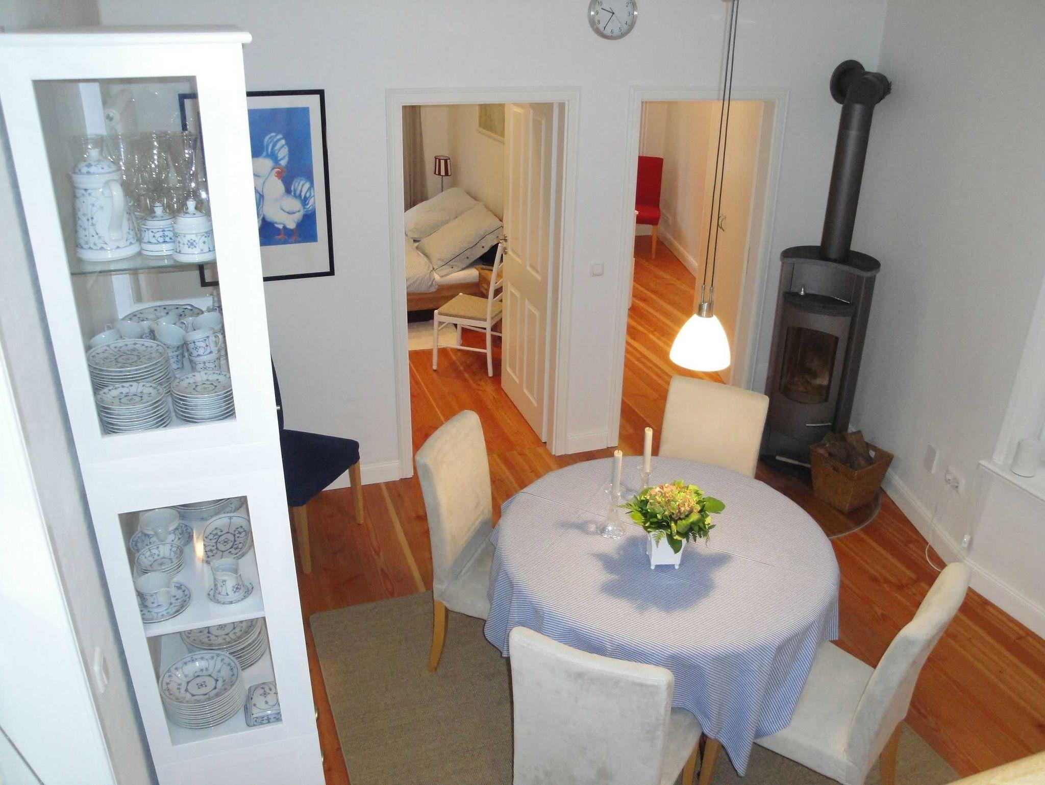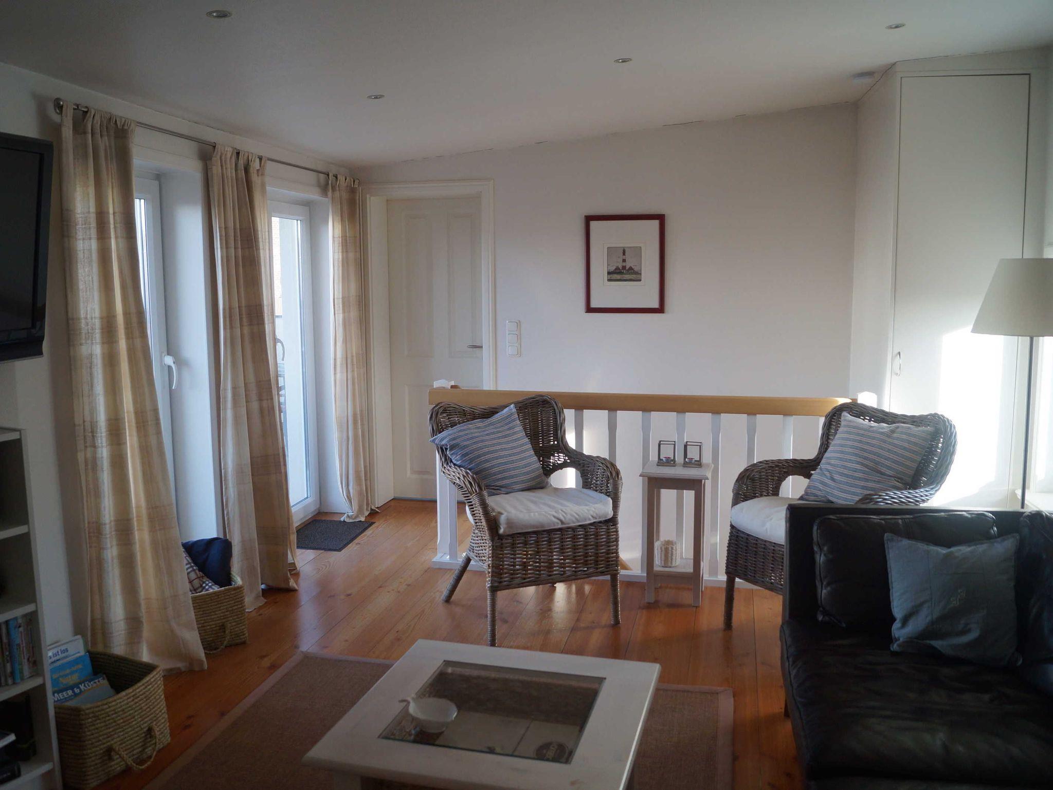 Die helle Küche ist mit Geschirrspüler, Mikrowelle, Kühlschrank mit Gefrierfach, Toaster, Kaffeemaschine, Wasserkocher, Herd und separaten Ofen ausgestattet. Das Esszimmer mit rundem Tisch und Bollerofen lädt genauso zum Verweilen ein, wie der lichtdurchflutete Wohnteil im 2. OG mit kuscheligem Sofa und Balkon-Zugang. Moderne Mediengeräte und eine Bücher- und DVD Sammlung sorgen dafür, dass der Gast sich wie Zuhause fühlt, W-LAN und ein Telefon gehören ebenfalls zur Ausstattung. An schönen Tagen lädt der Balkon mit Blick über die Dächer zum luftigen Verweilen ein. Die Ferienwohnung verfügt im 1. und 2. OG über je 2 Schlafzimmer mit einem Doppelbett (180 x 200) bzw. einem Kojenbett, die jeweils mit Schrank, Kleiderstuhl und Kleiderablage ausgestattet sind. Die neuen Bäder verfügen im 1. OG über Dusche/WC, Waschbecken und ausreichend Ablagefläche sowie im 2. OG über eine riesige Wellness-Badewanne mit Oberlicht, Waschbecken und Handtuchwärmer. Die Fußbodenheizung in den Bädern und der Küche bietet zusätzlichen Komfort und rundet die hochwertige, geschmackvolle Ausstattung der Wohnung perfekt ab.