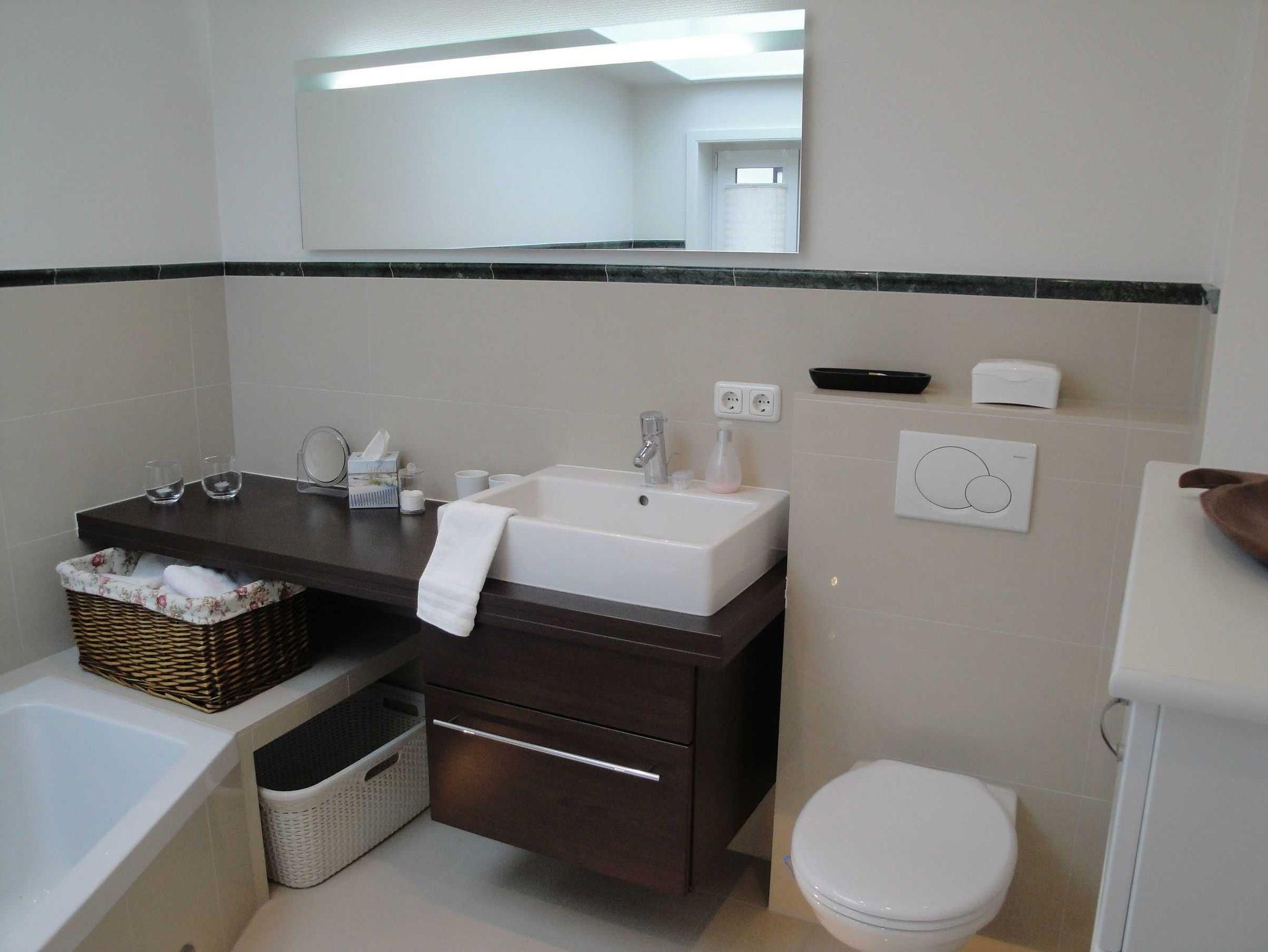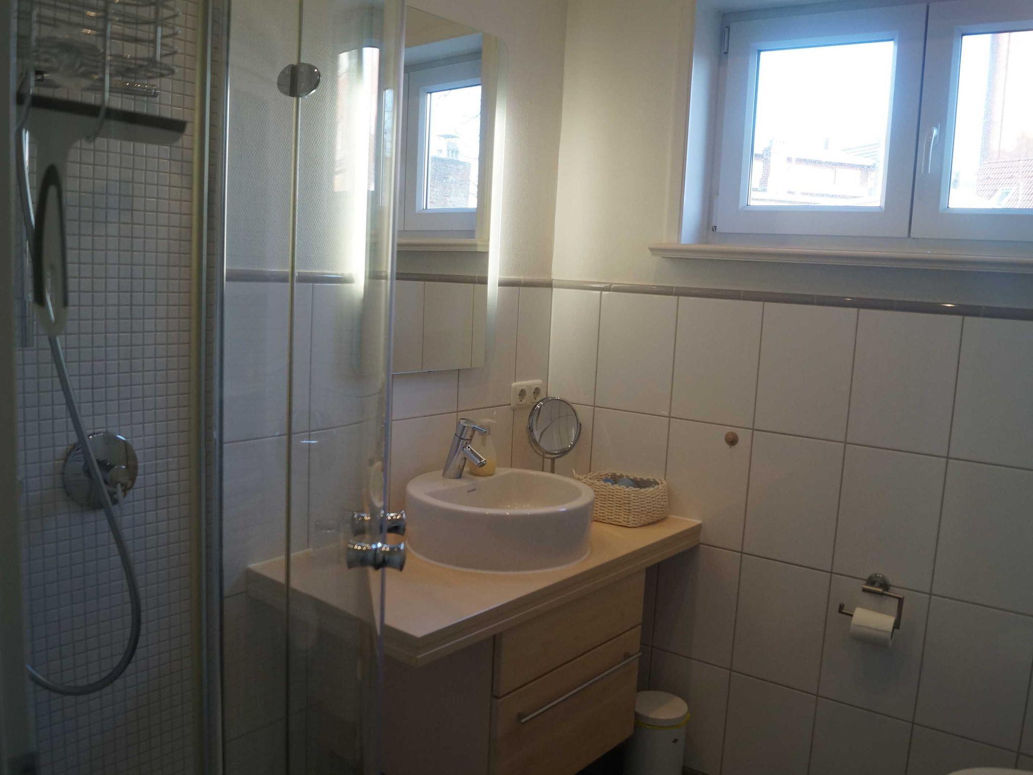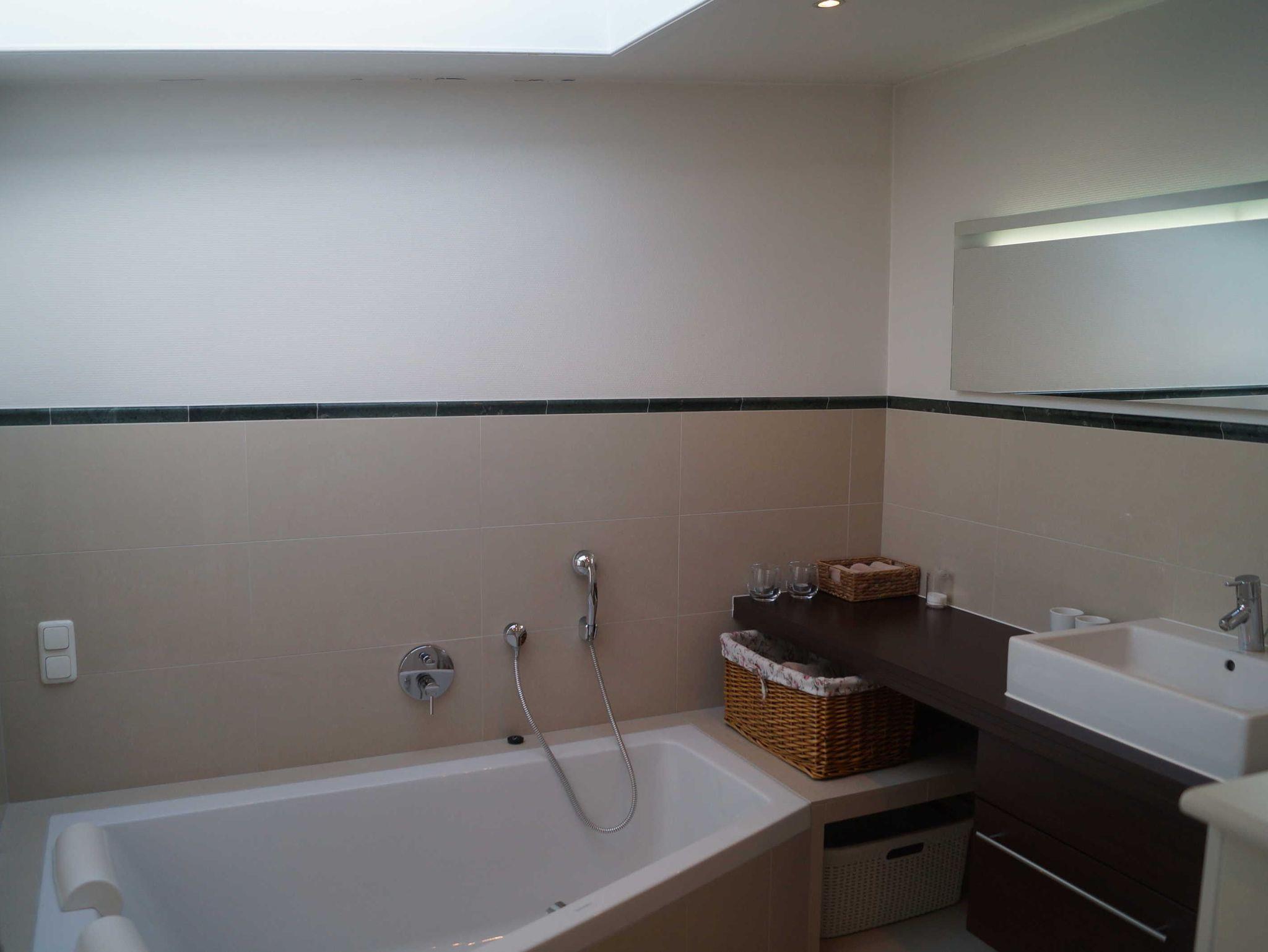 Die neuen Bäder verfügen im 1. OG über Dusche/WC, Waschbecken und ausreichend Ablagefläche sowie im 2. OG über eine große Wellness-Badewanne mit Oberlicht, Waschbecken und Handtuchwärmer.
