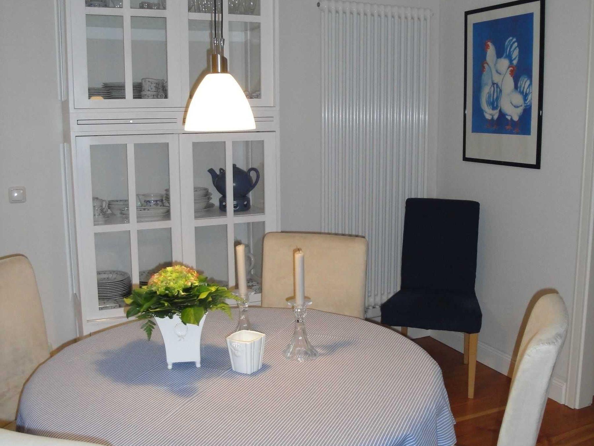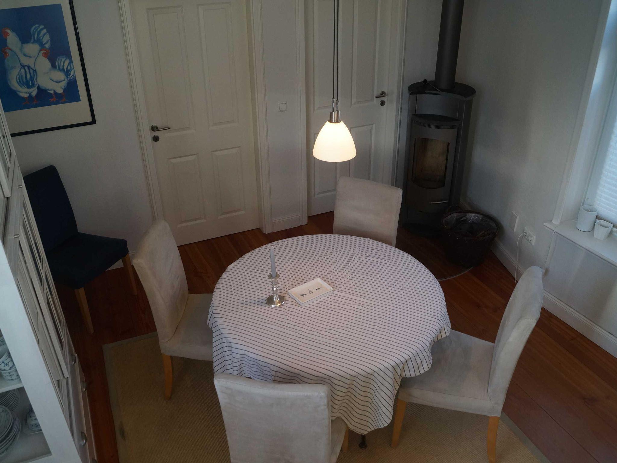 Das Esszimmer mit rundem Tisch und Bollerofen lädt genauso zum Verweilen ein, wie der lichtdurchflutete Wohnteil im 2. OG mit kuscheligem Ledersofa und Balkon-Zugang.
