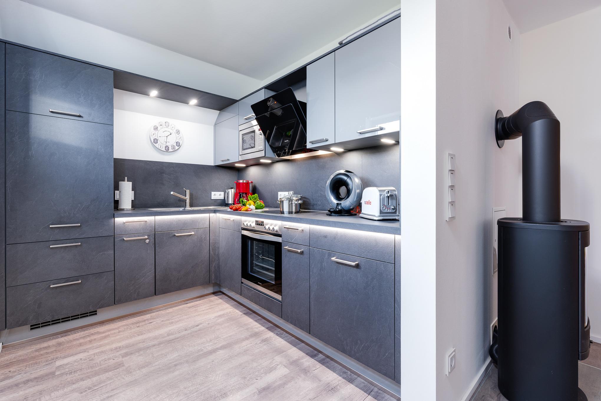Im Fokus steht aber der perfekt umgesetzte lichtdurchflutete Wohn- und Essbereich mit Holz befeuertem Kaminofen, bodentiefen Fenstern, durch die sich der Wohnbereich mit der Natur verbindet. Die Integration der offenen Küche mit hervorragender Ausstattung und funktionalem Design, steht dem gemütlichen Beisammensein auch beim zubereiten von allerlei Köstlichkeiten nichts im Wege. Der runde Kaminofen zwischen Wohnzimmer und Essbereich verleiht dem Raum eine besondere Atmosphäre. Dem faszinierenden Flammenspiel kann man durch das große Panoramaglas sowohl vom Sofa als auch vom Essbereich zuschauen. Vor allem in den kalten Wintertagen verbreitet der Ofen ein kuscheliges Wohlfühlambiente mit angenehmer Wärme. Den großzügigen zweiten Balkon (Südbalkon14m²) betritt man über den Wohnbereich, hier können es sich unsere Gäste auf einer bequemem Bestuhlung gemütlich machen und die Sonne so zu jeder Tageszeit genießen oder sich etwas leckeres auf dem Elektrogrill zubereiten.