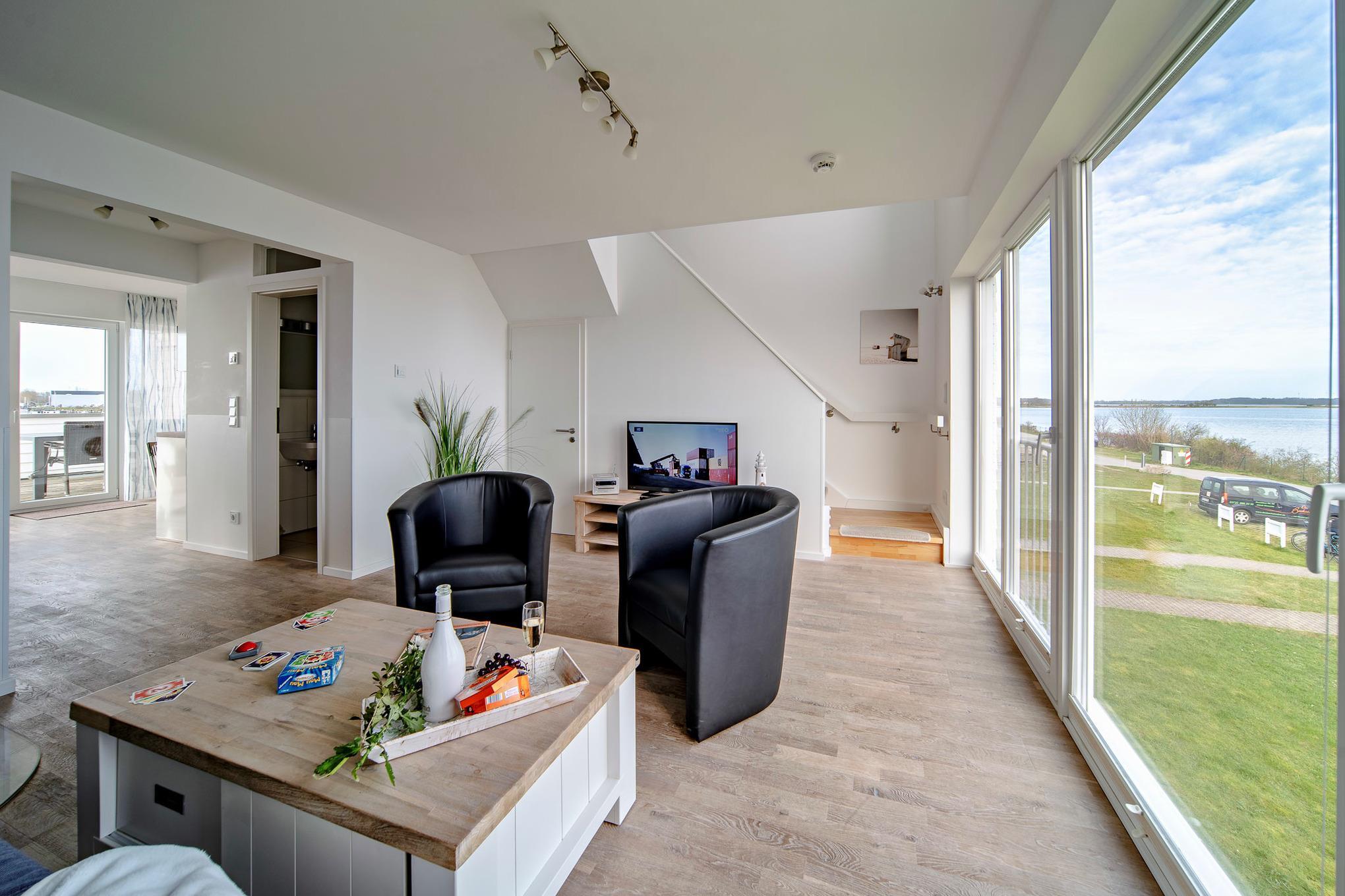 Der Blick dieser exclusiven 3-Zi-Ferienwohnung "Kaptein's Lounge"auf den Hafen einerseits und die Schlei und die Ostsee andererseits ist wirklich unbeschreiblich...