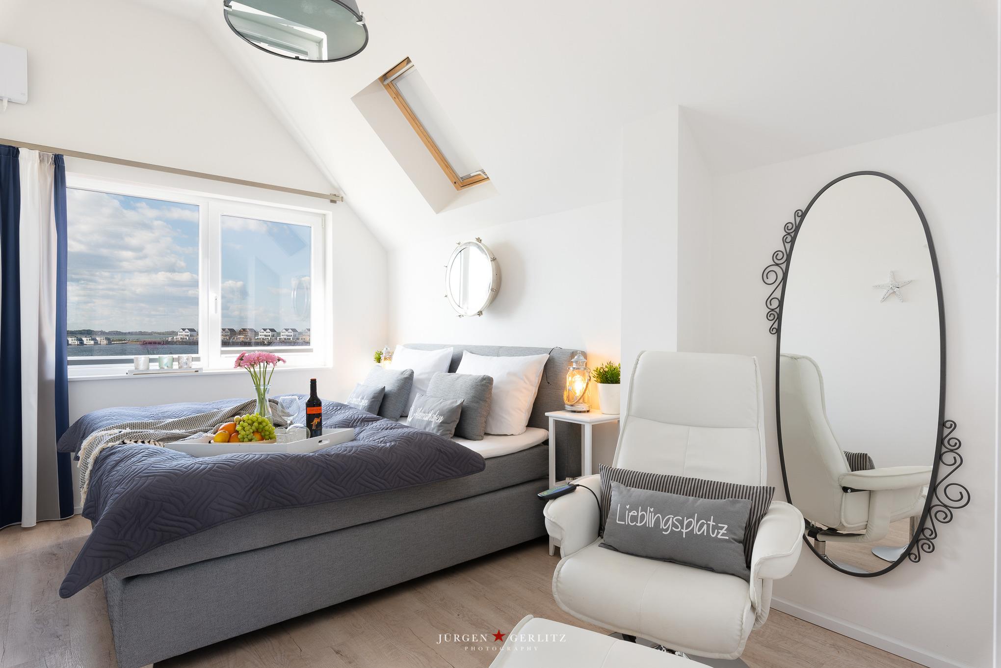 Zwei Schlafzimmer in der oberen Wohnebene bieten bis zu fünf Erwachsenen Platz zum Schlafen bei schönstem Wasserblick.
