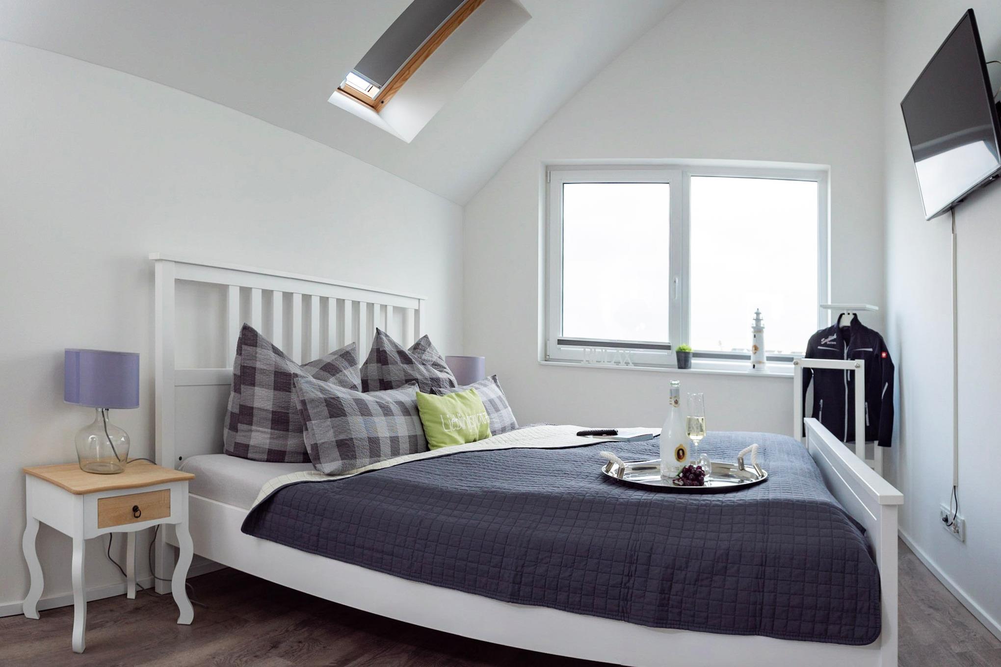 Bei dieser Wohnung sind spektakuläre Sonnenlichtspiele durch die zwei Balkone in Süd- und Nordausrichtung zu erwarten. Der Einrichtungsstil entspricht der exklusiven Lage der Ferienwohnung: Landhausstil gepaart mit klaren Farben und Formen versprechen Ruhe und Rückzug, während einzelne Farbakzente für erfrischende Leichtigkeit sorgen.