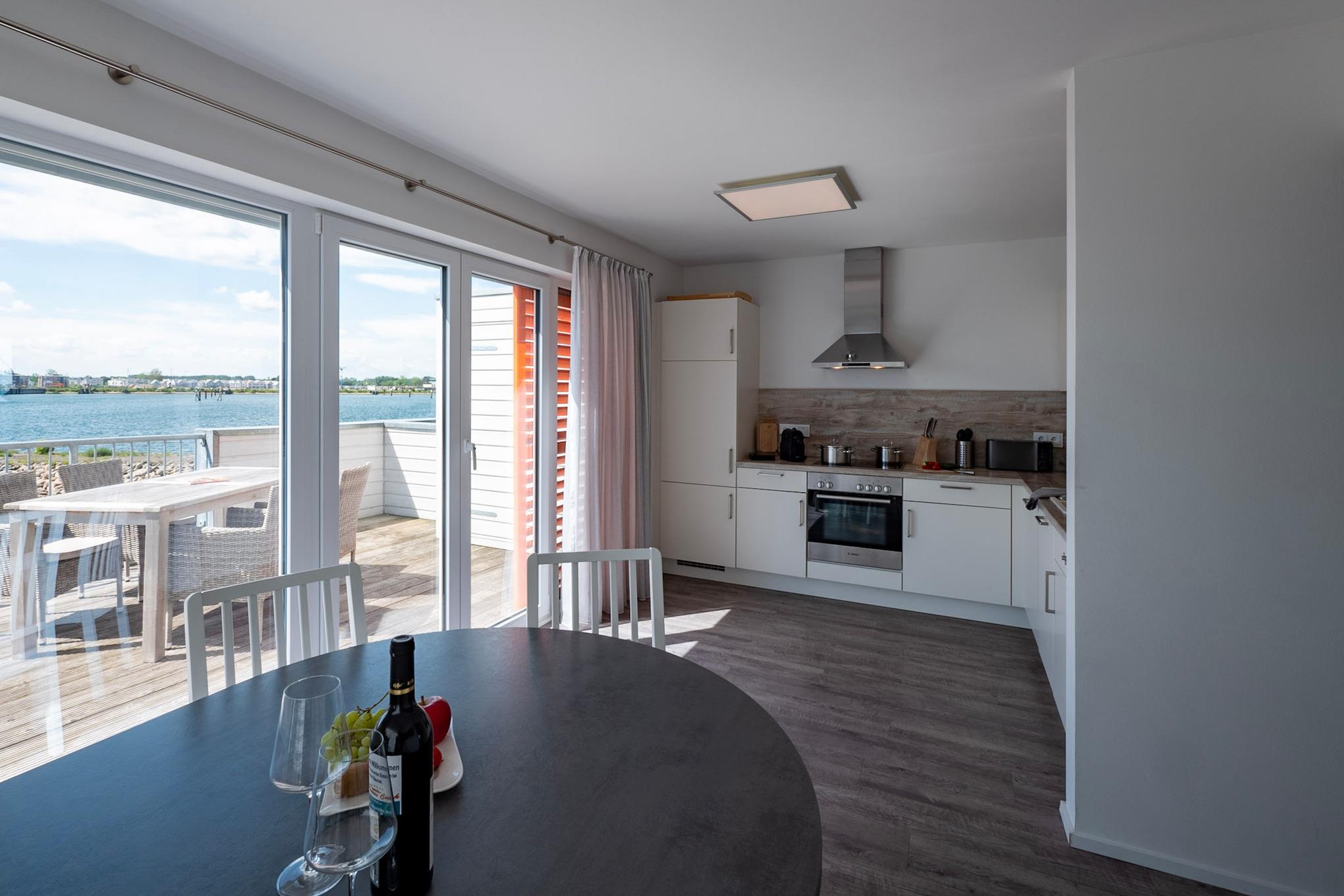 Im Fokus steht aber der perfekt umgesetzte lichtdurchflutete Wohn- und Essbereich mit Holz befeuertem Kaminofen, bodentiefen Panoramafenstern, welcher loftartig gestaltet ist, sodass alle Räume fließend ineinander übergehen und sich der Wohnbereich mit der Natur verbindet. Die Integration der offenen Küche mit hervorragender Ausstattung und funktionalem Design, steht dem gemütlichen Beisammensein auch beim Zubereiten von allerlei Köstlichkeiten nichts im Wege. Die Wasserkulisse vor dem Essbereich mit 180 Grad Panoramablick auf den gesamten Hafen und die Ostsee ist hierbei zum Greifen nah – das ist Ostseeflair. Den zweiten Nordbalkon (ca. 8m²) betritt man über den Wohnbereich, hier können es sich unsere Gäste auf einer zusätzlichen Bestuhlung gemütlich machen und bei einem Sundowner mit Abendsonne den Tag ausklingen lassen.