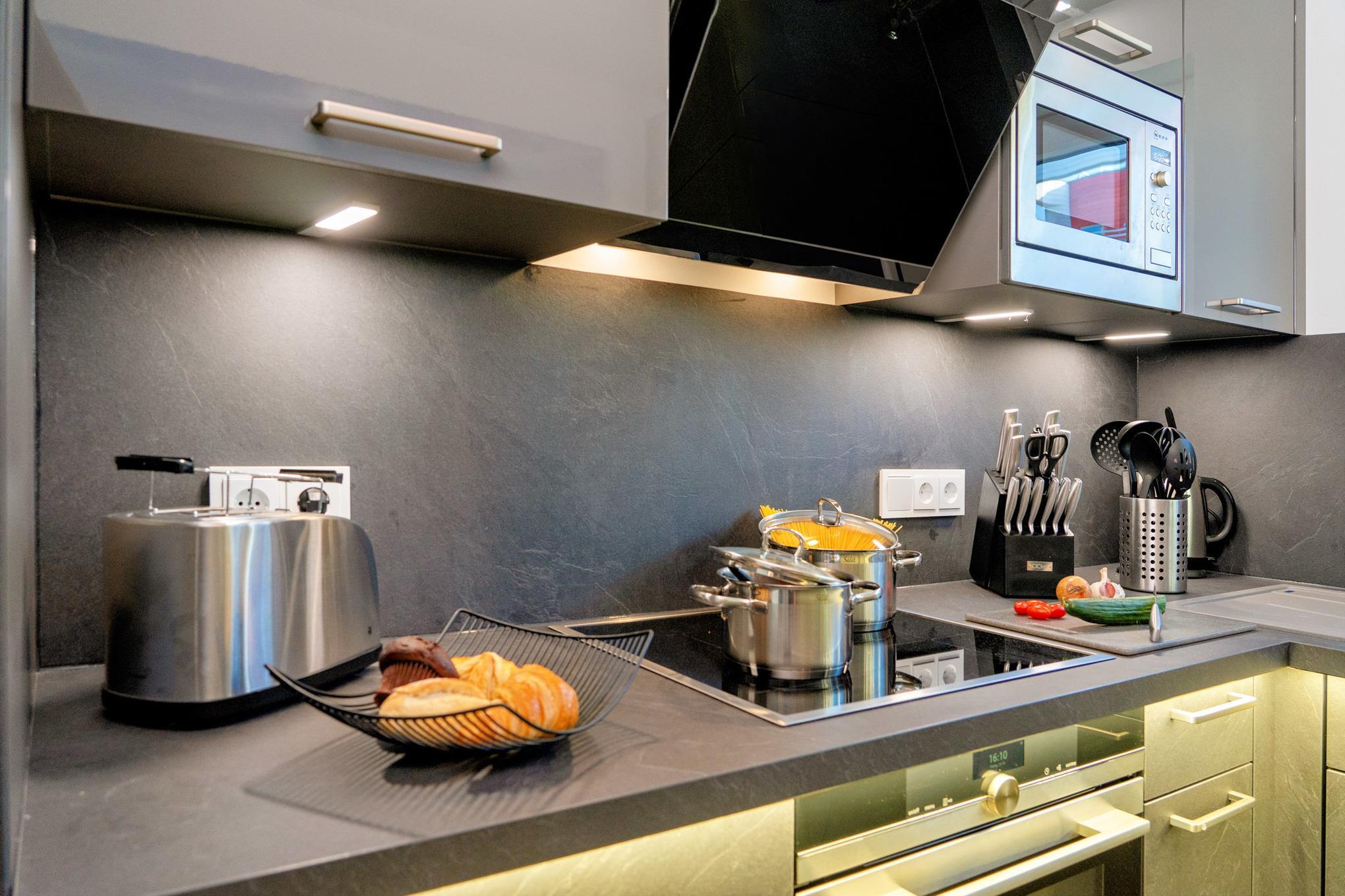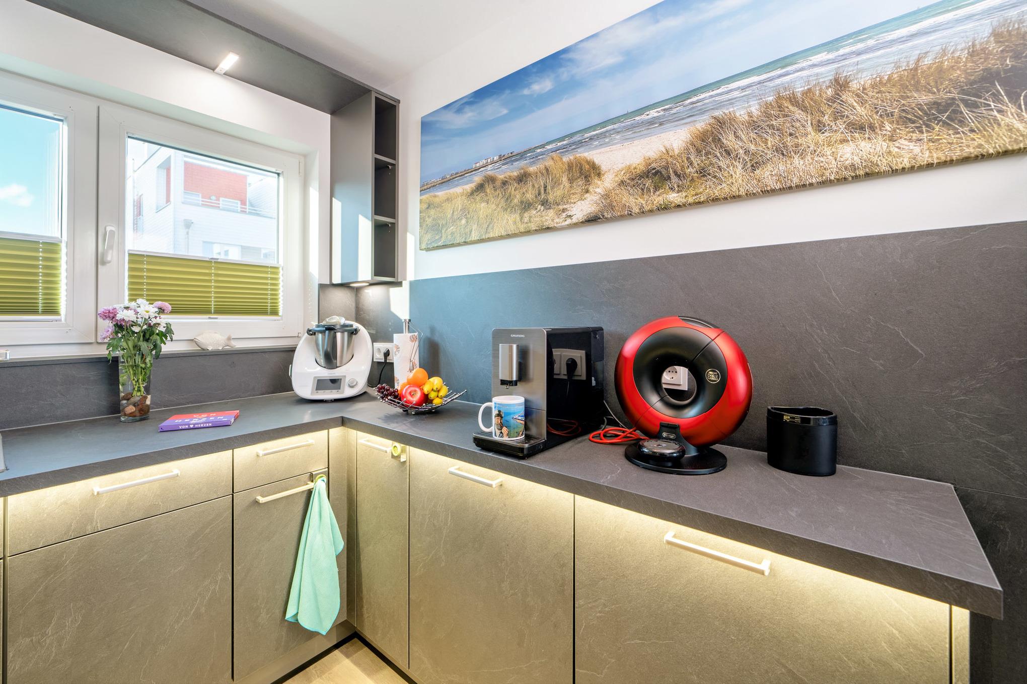 Die komplett ausgestattete Design-Küche begeistert Hobbyköche mit einer Vielzahl von Annehmlichkeiten. Ein Geschirrspüler, Induktionskochfeld, Backofen, Mikrowelle, Kühlschrank mit Gefrierfach und ein Thermomix komplettiert das Ensemble und lässt die Herzen von Kochenthusiasten höher schlagen. Als besonderes Highlight steht ein Kaffeevollautomat ohne Milchsystem bereit - ideal für Kaffeeliebhaber, die den reinen Geschmack schätzen. Erleben Sie pure Entspannung in Ihrem Urlaubsdomizil.