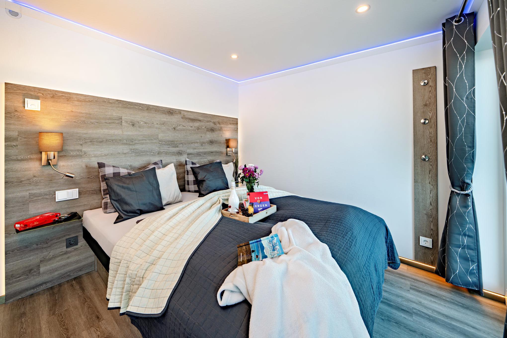 Die Interieur kombiniert modernen Stil mit erstklassigem Komfort. Der Masterbedroom beeindruckt mit einem luxuriösem Wasserbett (1,80m x 2,20m) und bietet einen atemberaubenden Ausblick auf die Marina. Gleichzeitig enthüllt das zweite Schlafzimmer mit einem Boxspringbett (1,80m x 2m) die Schönheit der Schlei.