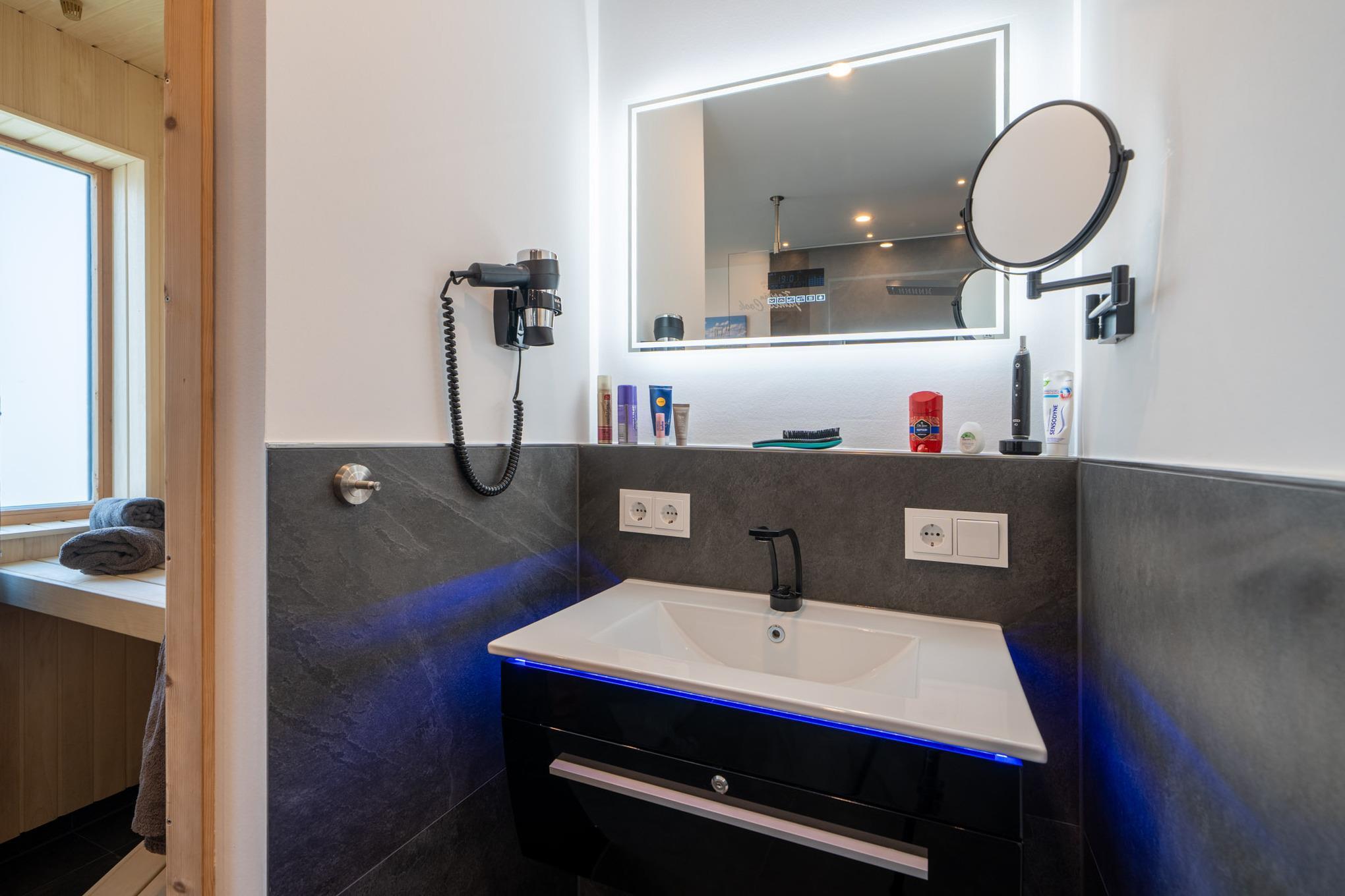Die Ausstattung dieses exklusiven Domizils lässt keine Wünsche offen. Ein modernes Bad mit WC, Dusche und einer finnischen Sauna verspricht Entspannung pur in der ersten Etage.