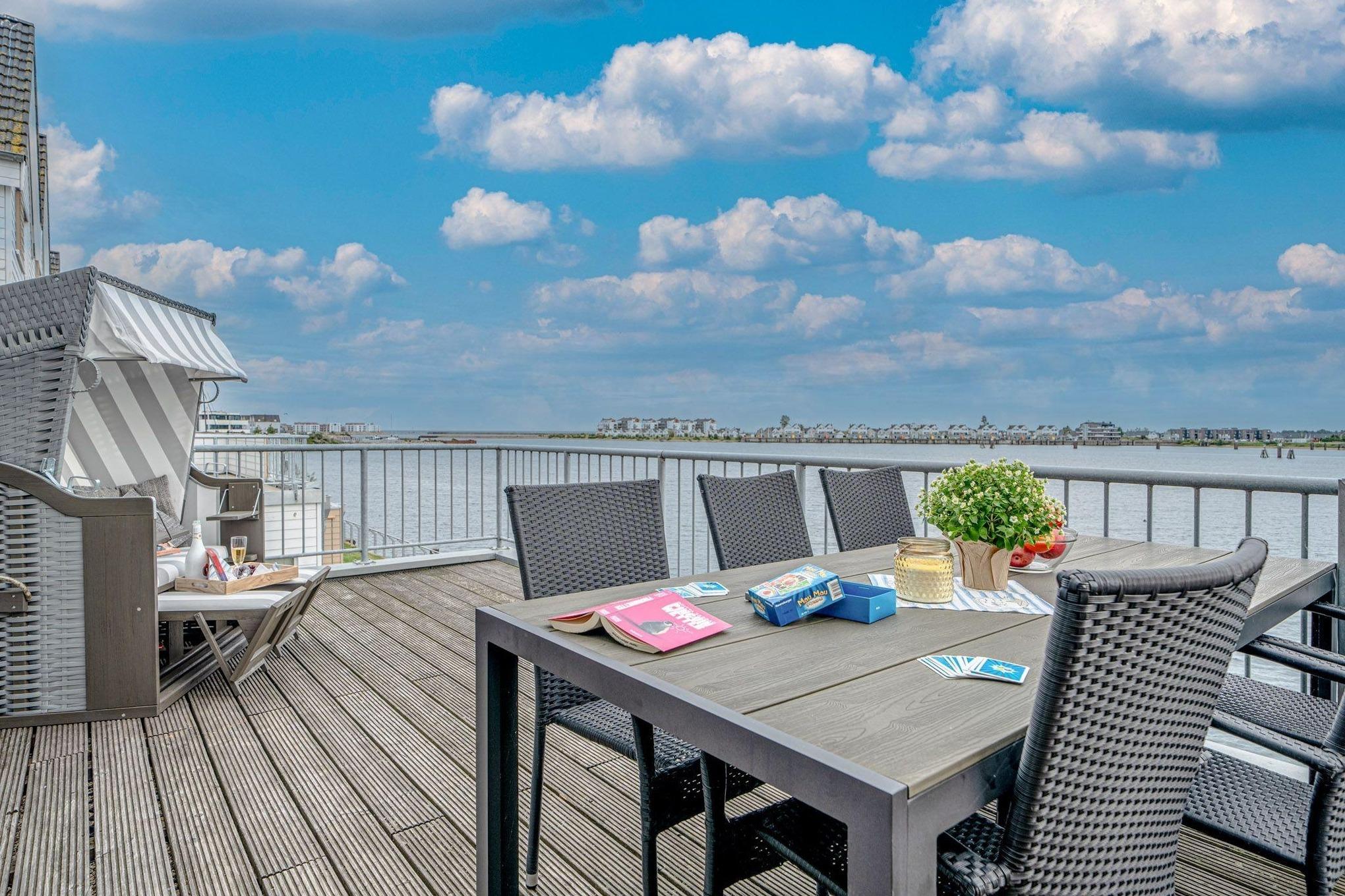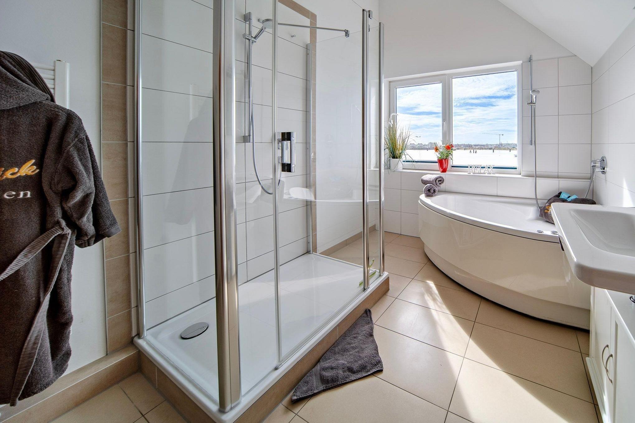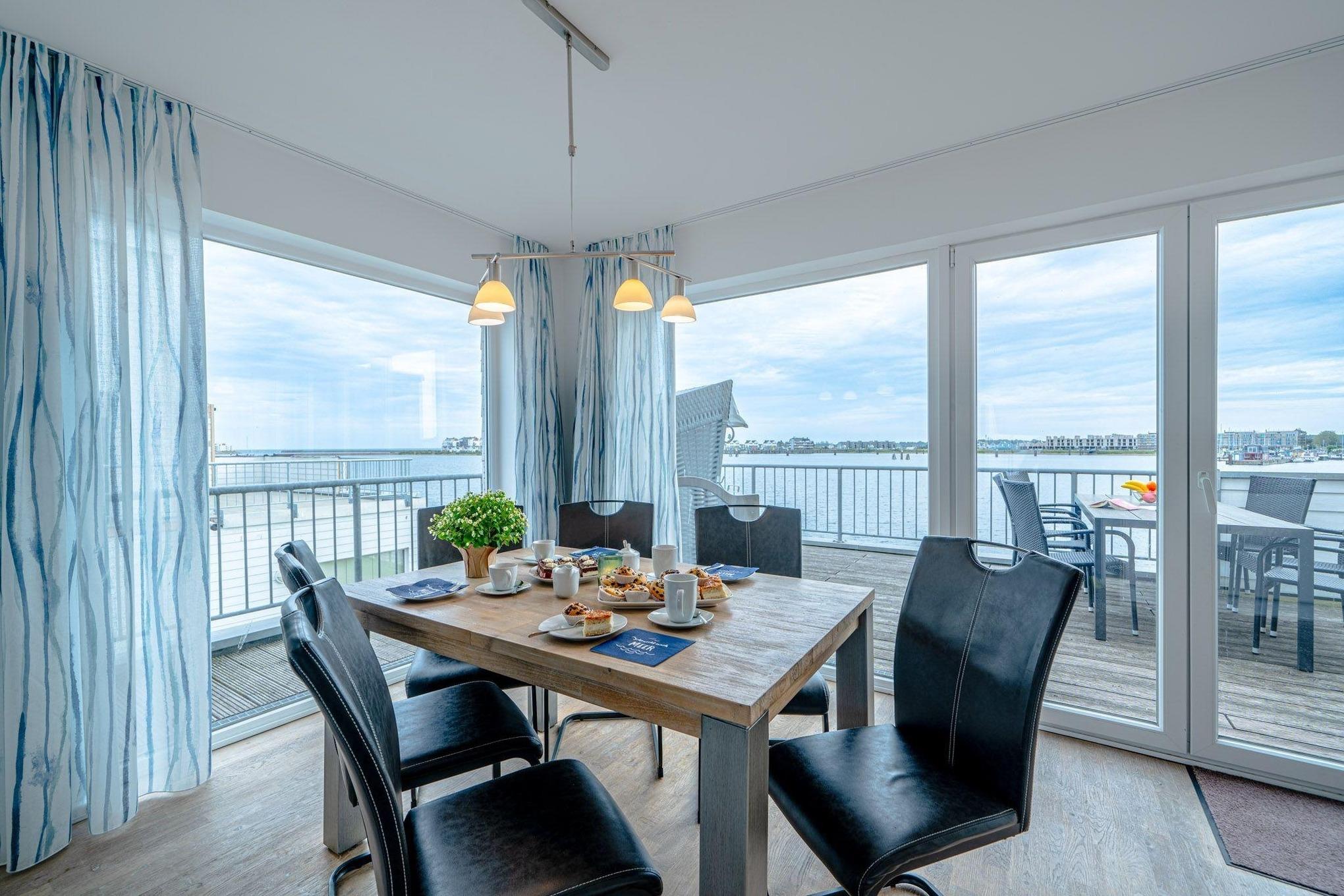 Der Blick dieser Maisonette-Wohnung auf zwei Ebenen im Ober- und Dachgeschoß des Hafenhauses am Kaianleger im OstseeResort Olpenitz mit 93 qm Wohnfläche ist wirklich unbeschreiblich! Durch die großen Fensterflächen gelangt viel Licht in die Wohnung, so daß sie stets hell und einladend wirkt - und man fühlt sich hier fast mehr wie auf der "Kommandobrücke" eines (Kreuz-) Schiffs als in einer Ferienwohnung! Den Lebensmittelpunkt dieses loftartig gestalteten Feriendomizils bietet die Eingangsebene im 1. Obergeschoß, in dem die Räume fast fließend ineinander übergehen. Das geräumige und einladende Wohnzimmer hat einen unbeschreiblichen Ausblick auf die Schlei und ist der ideale Treffpunkt für die ganze Familie, auch bei kühleren Jahreszeiten, wenn der eingebaute Kamin prasselt. Über den angrenzenden Eßbereich mit offener Küche gelangt man zur großen Terrasse in Südausrichtung und einem 180 Grad-Panoramablick über den ganzen Hafen. Abgerundet wird diese Etage mit einem Gäste-WC und Dusche. Über eine bequeme Treppe gelangen Sie vom Wohnbereich ins Dachgeschoß zu den zwei Schlafzimmern und dem großzügigen Wellness-Bad mit Duche, großer Badewanne mit Whirlpoolfunktionen und einer Infrarotsauna. Das Masterbedroom mit Blick in Richtung Marina verfügt zudem über einen TV. Hier bietet sich überall ein unvergleichbarer Ausblick auf Hafen und Schlei. Mehr Wasserblick als speziell in diesem außergewöhnlichen Ferienobjekt können Sie fast nirgendwo sonst haben: Nach Norden vom Wohn- und Schlafzimmer aus auf Schlei und die vorbeifahrenden Segelschiffe, die Ostsee sowie den Leuchtturm von Schleimünde, und nach Süden von Eßbereich und großer Panorama-Terrasse aus auf das komplette Hafengebiet von Port Olpenitz!